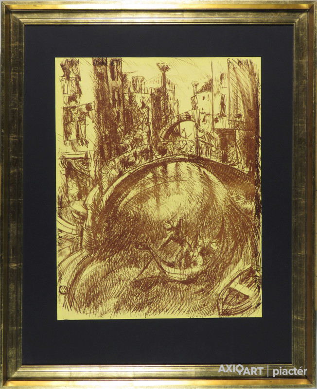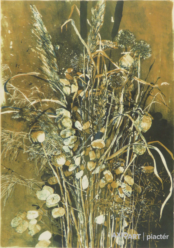[FKD020/Bp202/108] A kép mérete: 57 x 40 cm keret nélkül. Készült: Színes litográfia, Papír A kép Bálványos Huba (Budapest, 1938) alkotása. Jelezve lent "Ősz (litó) próba Erzsóknak szeretettel: Huba - Bálványos 981 (ceruzával)" A festmény jó állapotban van. Keret: Ép Magyar festők és grafikusok életrajzi lexikona I-II. Grafikus. Tanulmányait a budapesti Képzőművészeti Főiskolán végezte 1962-ben. Szőnyi István, Pór Bertalan, Pap Gyula és Ék Sándor voltak a mesterei. Egy évig független művészként tevékenykedett, később 1963-ban visszatért a budapesti Képzőművészeti Főiskolára, mint óraadó tanár. 1957-1977 többször megfordult a Kecskeméti Alkotóházban. Grafikai lapjaival részt vesz országos és külhoni kiállításokon. "Beszélgetők" című linómetszetével sikeresen szerepelt a Berlini Intergraphik Kiállításon. 1977-ben a budapesti Tanítóképző Főiskola docense, majd a Képzőművészeti Főiskola adjunktusa lett. Litográfiákat, valamint tusrajzokat alkot. 1967-ben Derkovits-ösztöndíjat nyert, 1968-ban Firenzében a Nemzetközi Grafikai Kiállításon Aranyéremmel jutalmazták, 1979-ben pedig Munkácsy-díjjal tüntették ki. A Stúdió pályázatain többször nyert díjat. Derkovits grafikai művészetének folytatója. Grafikáinak tárgya nem annyira a vizuális élmény, mint inkább a koreszmék lázas világa, melyeket Bálványos realista eszközökkel próbál képnyelvre fordítani. Tematikailag az ember, a tárgy, a táj egyaránt megjelenik grafikáin. Számos irodalmi művet illusztrált. Termékeny grafikus, nagy érdemei vannak a kőrajz hazai feltámasztásában. (Műv. 1966/10, D. F. Zs.: Műv. 1969/8, M. M.: Műv. 1970/9, KM) Magyar festők és grafikusok adattára A Képzőművészeti Főiskolán végezte tanulmányait. 1963-1972 közötti években ugyanitt ábrázoló mértant tanított. 1977-ben a Budapesti Tanítóképző Főiskola docense. Litográfiákat és tusrajzokat készít. Munkásságát 1979-ben Munkácsy-díjjal tüntették ki. Ismertebb litográfiái: "Bartók: Az elmúlt időkből", "Csodaszarvas" és a "Győztes ünneplése". Termékeny grafikus, nagy érdemei vannak a kőrajz hazai feltámasztásában. Grafikáinak tárgya nem annyira a vizuális élmény, mint inkább a koreszmék lázas világa, amelyet realista eszközökkel igyekszik képnyelvre fordítani. - Irod.: Krunák Emese; Bálványos Huba. Bp. 1984. - P. Sz. T.: Művész életrajzok. Bp. 1985. Magyar festők és grafikusok életrajzi lexikona I-II. Műgyűjtők és kereskedők kézikönyve Grafikus. Tanulmányait a bp.-i Képzőművészeti Főiskolán végezte, 1962-ben. Szőnyi István, Pór Bertalan, Pap Gyula és Ék Sándor voltak a mesterei. Egy évig független művészként működött, később, 1963-ban visszatért a bp.-i Képzőművészeti Főiskolára, mint óraadó tanár. Grafikai lapjaival részt vesz országos és külföldi kiállításokon. "Beszélgetők" című linometszetével sikeresen szerepelt a berlini Intergraphik kiállításon. 1977-ben a bp.-i Tanítóképző Főiskola docense, majd a Képzőművészeti Főiskola adjunktusa lett. Litográfiákat és tusrajzokat készít. 1967-ben Derkovits-ösztöndíjjal nyert, 1968-ban Firenzében a Nemzetközi Grafikai Kiállításon aranyéremmel jutalmazták. 1979-ben Munkácsy-díjjal tüntették ki. A Stúdió pályázatain többször nyert díjat. Derkovits Gy. grafikai művészetének folytatója. Grafikáinak tárgya nem annyira a vizuális élmény, mint inkább a koreszmék lázas világa, amelyek realista eszközökkel próbál képnyelvre fordítani. Tematikailag az ember, a tárgy, a táj egyaránt megjelenik B. H. grafikáin. Számos irodalmi művet illusztrált. Termékeny grafikus, nagy érdemei vannak a kőrajz hazai feltámasztásában. (Műv.-1966/10, D.F.Zs.: Műv.-1969/8, M. M.: Műv.-1970/9)
