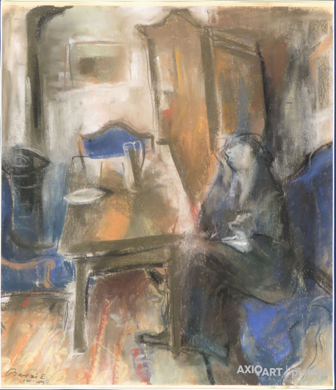[FKD049/Bp9/42] A kép mérete: 73 x 102 cm keret nélkül. Készült: Akrill, Papír A kép Vinkler László (Szabadka, 1912, Szeged, 1980) alkotása. Jelezve jobbra lent "Vinkler László" A festmény jó állapotban van. Keret: Ép Magyar festők és grafikusok életrajzi lexikona I-II. Festő. Tanulmányait Lápossy-Hegedűs Géza irányításával kezdte. A budapesti Képzőművészeti Főiskolán Glatz Oszkár és Karlovszky Bertalan tanítványa volt. 1935-ben diplomázott. 1933-ban a főiskola jubileumi tárlatán a "Nagymamám" című alkotásával elnyerte a Balló-díjat. 1935-1936-ban római ösztöndíjas volt, és a Collegium Hungaricum-ban töltött nyolc hónapot. Szorgalmasan dolgozott, közben tanulmányokat folytatott az Accademia delle Belle Arti freskó-osztályán, Ferazzi irányítása mellett. Az itt készült "Maria Surigia" című képmását 1936-ban a Collegium Hungaricum kiállításán mutatta be, amelyet az olasz állam vásárolt meg. A "Római szobrásznő" című képe 1937-ben elnyerte a Jellinek-díjat. Az alkotás jelenleg a Magyar Nemzeti Galéria tulajdona. Számos kelet- és nyugat-európai országban járt tanulmányúton. 1931-től szerepelt hazai és külföldi bemutatókon. Egyéni kiállításai voltak Szegeden (1942, 1958, 1963, 1972), az Ernst Múzeumban (1959), Olaszországban (1961), Jugoszláviában (1968). Nagyobb anyaggal szerepelt a szegedi művészek 1967-es Magyar Nemzeti Galéria-béli kiállításán. 1932-ben Balló-díjat, 1937-ben Fényes Adolf-díjat kapott, 1972-ben Szeged város alkotói-díját, 1979-ben a Szegedi Nyári Tárlat díját nyerte el. Éveken keresztül (tizenöt év megszakítással) a szegedi Tanárképző Főiskola rajzi tanszékének vezetőjeként működött. Korábban protréfestőként volt ismeretes. Karlovszky mellett a rajz kultuszára és a csendéleti formalátásra kapott indíttatásokat, később Glatz hatott rá, így a rajzos analizálás helyett a művész a szélesebb festőiségre tért át. A naturalizmussal elvi szakítást jelentő harmadik stílusát a novocento jelképes, színesen dekoratív szellemében alakította ki. Jeles grafikus volt. Több irodalmi művet illusztrált. Monumentális feladatokkal is foglalkozott (freskók a Petőfi-telepi templomban stb.). 1957-ben a városban végzett művészi tevékenysége elismerésül a szegedi Collegium Artium Képzőművészeti tagozata vezetőjévé választotta. Műveinek jelentős részét a szegedi Móra F. Múzeum őrzi. (PZ-SzMF,D.E.: Műv. 1927/6, ML, Sz.Z.: Műv. 1973/1, Műv. 1982/10. D.F.Zs.: Műv. 1973/8.) Magyar festők és grafikusok életrajzi lexikona I-II. Műgyűjtők és kereskedők kézikönyve Festő. Tanulmányait Lápossy-Hegedűs Géza irányításával kezdte. A budapesti Képzőművészeti Főiskolán Glatz Oszkár és Karlovszky Bertalan tanítványa volt. 1931 óta kiállító művész. 1933-ban a főiskola jubileumi kiállításán a "Nagymamám" c. festményével elnyerte a Balló-díjat. 1935-36-ban római ösztöndíjas volt. Az Accademia della Bella Arti freskó-osztályán, Ferazzi mester mellett folytatott tanulmányokat. Az itt készült "Maria Surigia" c. portréját 1936-ban a Collegium Hungaricum kiállításán mutatta be, amelyet az olasz állam vásárolt meg. A "Római szobrásznő" c. képe 1937-ben elnyerte a Jellinek-díjat. A mű a MNG tulajdona. Több kelet- és nyugat-európai országban járt tanulmányúton. Egyéni kiállításai voltak Szegeden (1942, 1958, 1963, 1972), az Ernst Múzeumban (1959), Olaszországban (1961), Jugoszláviában (1968). Nagyobb anyaggal szerepelt a szegedi művészek 1967-es MNG-beli kiállításán. 1937-ben Fényes Adolf-díjat, 1972-ben elnyerte Szeged város alkotói-díját, 1979-ben a Szegedi Nyári Tárlat díját. Ezen kívül művészpedagógusi és alkotói tevékenysége elismeréseként még számos kitüntetéssel és díjjal jutalmazták. Hosszabb ideig a szegedi Tanárképző Főiskola rajztanszékének vezetőjeként tevékenykedett. Korábban arcképfestőként volt ismeretes. Karlovszky mellett a rajz kultuszára és a csendéleti formalátásra kapott indíttatásokat, később Glatz Oszkár hatott rá és a rajzos analizálás helyett a szélesebb festőiségre tért át. A naturalizmussal elvi szakítást jelentő harmadik stílusát a novocento jelképes, színesen dekoratív szellemében alakította ki. Jeles grafikus volt. Számos irodalmi művet illusztrált. Monumentális feladatokkal is foglalkozott. (freskók a Petőfi-telepi templomban, stb). (PZ-SzMF,ML,Sz.Z.: Műv.-1982/10) Magyar festők és grafikusok adattára Művészeti tanulmányait Lápossy-Hegedűs Géza irányításával kezdte, majd a Képzőművészeti Főiskolán Karlovszky Bertalan és Glatz Oszkár növendékeként fejezte be 1935-ben. 1931 óta kiállító művész. 1933-ban a főiskola jubileumi kiállításán a Nagymamám c. festményével elnyerte a Balló-díjat. A diploma megszerzését követően 1935-1936-ban római ösztöndíjas. Az itt készült Maria Surigia c. portréját az olasz állam megvásárolta. A Római szobrásznő c. képe 1937-ben elnyerte a Jellinek-díjat, s amelyet ma az MNG őriz. Számos kelet- és nyugat-európai országban megfordult tanulmányúton. Egyéni kiállításai voltak Szegeden (1942, 1958, 1963, 1968, 1972), az Ernst Múzeumban (1959) és Dunaújvárosban (1977), illetve külföldön Olaszországban (1961) és Jugoszláviában (1968). Nagyobb anyaggal szerepelt a szegedi művészek 1967-ben MNG-beli bemutatóján. 1972-ben elnyerte Szeged város alkotói díját és 1979-ben a Szegedi Nyári Tárlat díját. Hosszabb időt töltött a Szegedi Tanárképző Főiskola rajztanszékének élén. Emlékkiállítását 1982-ben a szegedi Móra Ferenc Képtárban és a MNG-ban rendezték meg. Karlovszky mellett a rajz kultuszára és a csöndéleti formalátásra kapott indíttatásokat, később Glatz hatott rá és a rajzos anal