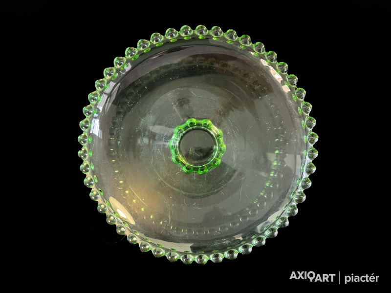 **Leírás:** **Rudolf Schröttert a modern csehszlovák préselt üveg atyjának** tartják . 1887-ben született Németországban. Tervezőként végzett, majd egy rajnai üveggyárban dolgozott Kölnben. 1912-ben kezdett üvegtervezőként dolgozni Rudolf kohógyárában, amely az Inwald üveggyárhoz tartozott. Korábban az üveggyár üveget dolgozott fel, aminek szálcsiszolt üveget kellett volna utánoznia. Rudolf Schröter érkezésével ez a tendencia megváltozott, és olyan termékeket tervezett, amelyek nem tagadták a préselt üveg eredetét. Ő tervezte a Lord, Pollax, Boule és Perforal szetteket, valamint sok más terméket, melyeket az üvegtervezők fiatalabb generációja folytatta. Alena Adlerová Schröter 1920-as és 1930-as évekbeli készleteit „üvegtervezésünk fő úttörő alkotásainak” tekintette, amelyek közvetlenül a **funkcionalizmus hatására** jöttek létre . Rudolf Schröter egész pályafutását az Inwald üveggyártó cégnél töltötte, amelynek nagy sikereket hozott. Az együttműködés a két világháború közötti időszaktól az 1950-es évek végéig tartott. Ebben a későbbi időszakban a tervezők új generációja érkezik a gyárba - Jiří Zejmon és Václav Hanuš, akik Štípl professzornál végeztek VŠUP-ban. **Rudolf Schröter a híres „Durit”** csésze tervezője is , amelyet 1934-ben kezdtek el gyártani, és jelenleg is gyártják. Préselt üveg, hibátlan állapotban, kissé karcos, nem jelzett, cca. 1930-1940, 42 cm átmérő **Számlázás:** Kizárólag magánszemélyek számára tudunk számlát kiállítani. Minden termékről számlát állítunk ki! **Átvétel:** Személyes átvételre Gyöngyösön az irodánkban és hétvégenként Budapesten van lehetőség az Árkádi Shell kúton. Csomagjainkat FoxPost-tal és a Magyar Postával küldjük, gondosan csomagolva, a postázáskor keletkező károkért 100%-ban felelősséget vállalunk! Fizetni előreutalással és utánvéttel lehet. A nagyobb tárgyakat és a kimagasló értékű tárgyak esetén nem mindenesetben tudunk postázni. Személyesen is szállítjuk a tárgyakat, viszont ez külön díjazás, melyről privátüzenetben szívesen adunk tájékoztatást. **Többi termék:** Több termék vásárlása esetén nagyobb kedvezményeket biztosítunk! Kérjük tekintse meg termékeinket. Konkrétan keres valamit? Vegye fel velünk a kapcsolatot!