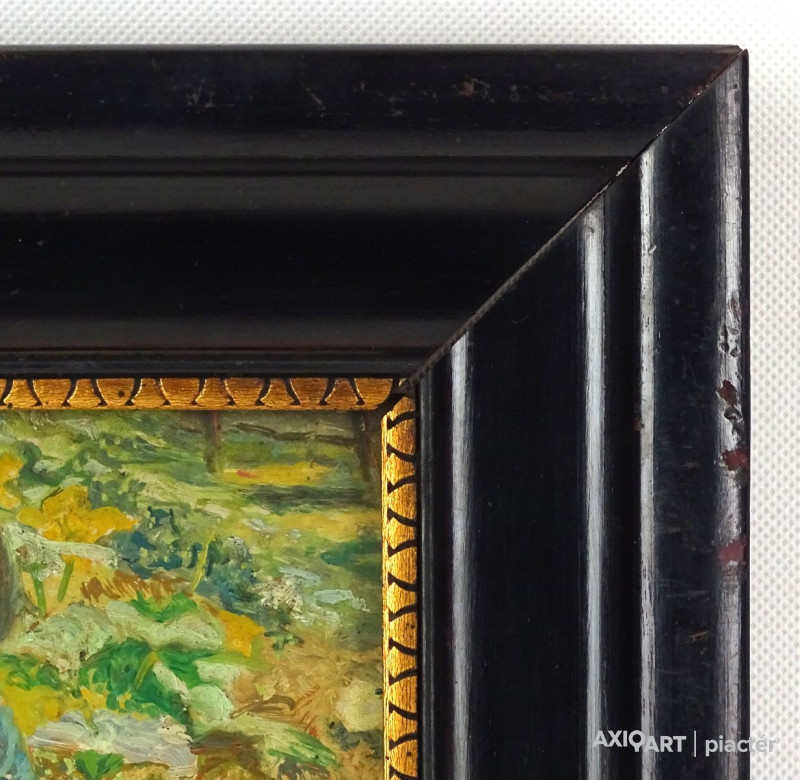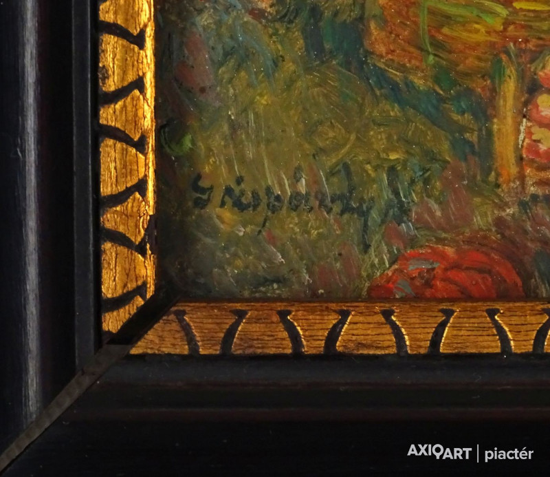 [FK0914/BX-2] A kép mérete: 15,5 x 25,5 cm keret nélkül. Készült: Olaj, Falemez A kép Magyar-Mannheimer Gusztáv (Pest, 1859, Budapest, 1937) alkotása. Jelezve Középen lent "Magyar Mannheimer" A festmény jó állapotban van. Keret: Új Magyar festők és grafikusok életrajzi lexikona I-II. Festő. Előbb a fővárosi Mintarajziskolában, később Bécsben H. Makartnál végzett művészeti tanulmányokat. 1878-tól a müncheni Képzőművészeti Akadémia növendéke lett. Itt a rézkarcoló Raab-nak, utána Löfftznek és Wagner Sándornak az irányításával tanult olyan sikerrel, hogy 1880-ban ezüstérmet, 1881-ben pedig dicsérő oklevelet és budapesti ösztöndíjat is kapott. Budapestre hazatérve, Benczúr-mesteriskolájában tanult a kapott ösztöndíjjal. Ekkor mutatkozott be a budapesti Műcsarnok közönségének az "Olvasó öregasszony", "A vőlegény jó kilátásai" című éleképekkel és néhány vázlattal. Később Bécsben H. Makartnak lett segédje egy dekoratív munkánál. A '90-es évek végén a nagybányai művésztelepen is megfordult. Ezután következett gyakran megismételt olaszországi útja. Még a sugárzó verőfény országában is híven kísérte a tompító müncheni tónus. 1901-ben "Esti hangulat" című alkotásával Társulati-díjat, 1902-ben állami kis aranyérmet nyert. 1910-ben a Velencei Biennálén "Tavasz" című festményét a Velencei Modern Képtár számára vásárolták meg. 1912-ben állami nagy aranyérmet nyert. Több ízben vett részt a budapesti Műcsarnok és a Nemzeti Szalon seregszemléin. 1913-ban, 1920-ban, 1922-ben, 1929-ben és 1933-ba kollektív kiállítása volt az Ernst Múzeumban. Stílusát a romantikus, a naturalizmus és a Makart-féle akadémikus dekorativizmus ötvözete jellemezte. A Szinyei Társaság alapítói közép tartozott. Illusztrálta Bródy Sándor, Mikszáth Kálmán, stb. műveit. Számos műve megtalálható a Magyar Nemzeti Galériában. Önarcképe a Magyar Történeti Képtárban van. (ML, Éber, L-MMM) Magyar festők és grafikusok életrajzi lexikona I-II. Műgyűjtők és kereskedők kézikönyve Festő. Előbb a fővárosi Mintarajziskolában, később Bécsben H. Makartnál, Münchenben pedig L. von Löfftznél és Wagner Sándornál tanult. Budapestre visszatérve, Benczúr-mesteriskolájában kapott több éves ösztöndíjat. 1901-ben "Esti hangulat" c. alkotásával Társulati-díjat, 1902-ben állami kis aranyérmet nyert. 1910-ben a Velencei Biennálén "Tavasz" c. képét a Velencei Modern Képtár számára vásárolták meg. 1912-ben állami nagy aranyérmet kapott. Több ízben szerepelt a Műcsarnok és a Nemzeti Szalon kiállításain. 1913-ban, 1920-ban, 1922-ben, 1929-ben és 1933-ban kollektív tárlata volt az Ernst Múzeumban. Stílusát a romantikus, a naturalizmus, és a Makart-féle akadémikus dekoratizmus ötvözete jellemezte. A Szinyei Társaság alapítói közé tartozott. Illusztrálta Bródy Sándor, Mikszáth Kálmán, stb. műveit. Számos műve megtalálható a MNG-ban. Önarcképe a MTK-ban van. (ML, Éber) Magyar festők és grafikusok adattára A bécsi akadémián Makart, a müncheni akadémián pedig Wágner tanítványa volt. Hazatérve a Benczúr-mesteriskola tagja lett. Stílusát a romantikus, a naturalizmus és a Makart-féle akadémikus dekoratizmus ötvözte, jellemezte. 1901-ben Esti hangulat c. képével társulati díjat, 1902-ben állami kis aranyérmet, 1912-ben állami nagy aranyérmet nyert. Tavasz c. képét 1910-ben megvásárolta a velencei Modern Képtár. Több ízben szerepelt csoportos kiállításon a Nemzeti Szalonban és az Ernst Múzeumban. Képei találhatók a MNG-ban. Számos illusztrációt is készített (Mikszáth Kálmán és Bródy Sándor műveihez stb.). Önarcképe a Magyar Történelmi Képcsarnokban található. Egyik alapító tagja volt a Szinyei Társaságnak. - Irod.: Herman Lipót: Magyar-Mannheimer Gusztáv. Magyar Művészet, 1937. Művészeti lexikon I-IV. Festő. Előbb a Mintarajziskolában, majd Bécsben H. Makartnál, Münchenben L. von Löfftznél és Wagner Sándornál tanult. Bp.-re visszatérve Benczúr mesteriskolájában kapott több éves ösztöndíjat. 1910-ben a Velencei Biennále kiállításán egyik képét (Tavasz) a velencei Modern Képtár számára megvásárolták. Színes, oldott előadású tájképeivel, sötétes hangulatú alakos kompozícióival a kiállítások állandó szereplője volt. Illusztrálta Bródy, Mikszáth stb. műveit. A Szinyei Társaság alapító tagjai közé tartozott, s több állami díjat nyert. Kampis Antal Művészeti lexikon I-II. Festő. Münchenben és Bécsben végezte tanulmányait. Képei túlnyomó részének tárgyát gyakori olaszországi tanulmányútjaiból merítette. Ilyenekkel szerepelt a Műcsarnokban a nyolcvanas évek óta, de temperamentumos előadása, mélytüzű színei csak nagysokára szereztek neki elismerést. A Campagna, sziklás, pikáns olasz tájai, kavargó felhői, patetikus hangulatai, élénk és egyéni előadása végre legjobb művészeink sorába emelték. Ily művei: Est a Campagnában, Esti hangulat, Erdőszéle stb. Eleinte inkább világos színhatású, utóbb mélyrefogott barnából és zöldből formált színharmóniája jelentkezik néhány alakos képén és tanulmányfején is (Libapásztorok, Arckép, Pulykapásztorlány)