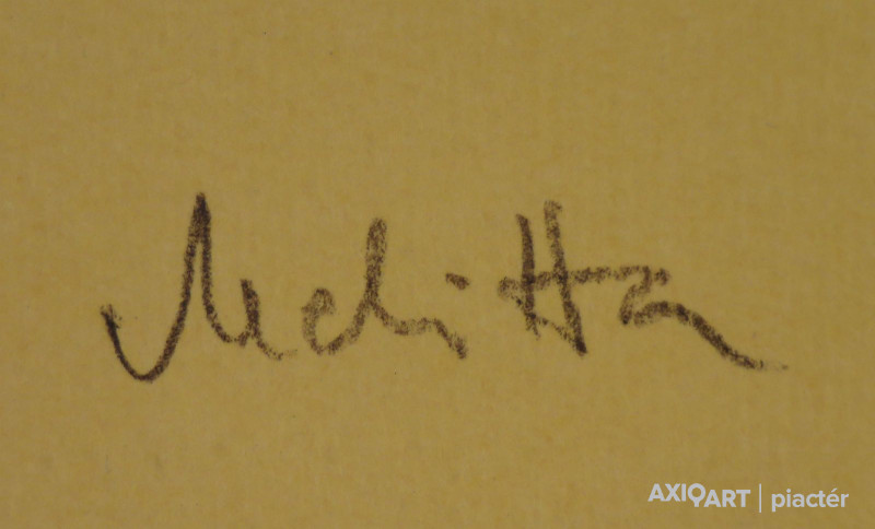 [FKB664/Bp202/80] A kép mérete: 15 x 21 cm keret nélkül. Készült: Akvarell, Papír A kép Németh Miklós (Budapest, 1943) alkotása. Jelezve középen lent "monogrammal" A festmény jó állapotban van. Keret: Sérült Magyar festők és grafikusok életrajzi lexikona I-II. Festő. 1950-54 között Márffy Ödön festőiskoláját látogatta. Ilosvai Varga István, Gádor Emil és Tóth Menyhért tanítványa volt. 1990-98 között a Budai Művészcsoport főtitkáraként tevékenykedett. A tokaji és telkibányai művésztelepek munkájában vett részt. Budapesten működik. Egyéni tárlatok: Tiszti Ház, Jókai Klub, Műcsarnok, Csillaghegyi Galéria, Gutenberg Galéria, Fészek Klub, Kaesz Gy. Faipari Középiskola, Csepel, MOM Műv. Ház, Soroksár, Gyöngyös, Tokió, stb. Rendszeresen szerepel az Országos Akvarell Biennálékon. Expresszív, szürreális jegyekkel készített táblaképeinek témái aktok, életképek és csendéletek. Témaválasztása egyre inkább szimbolikus jellegűvé vált. Művészete besorolható az Art Brut művészet sorába, de nevezhetjük punk művésznek, új expresszionistának is. Díjak: a Pesterzsébeti Tavaszi Tárlat díja; a Pest-Buda egyesítése 100. évfordulójára kiírt pályázat I. díja. Több díjat nyert helyi és országos amatőr kiállításokon. Munkáit a Fővárosi Képtár, a szentendrei Ferenczy K. Múzeum és a nagycenki Széchenyi Múzeum őrzi. (Fitz Péter adatközlése nyomán)
