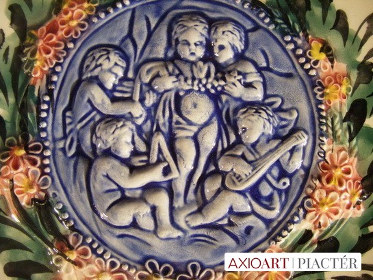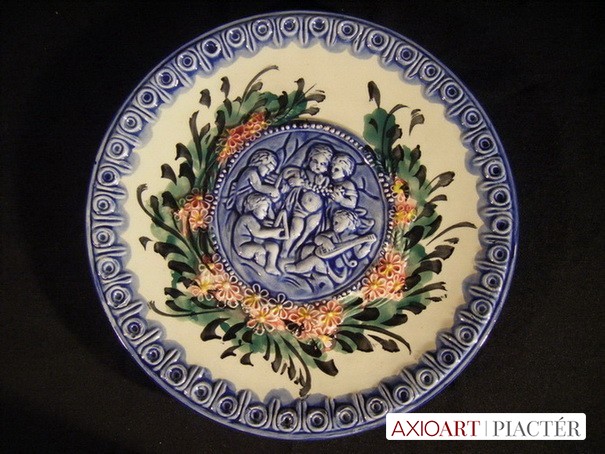 1900 környékéről való, kézi festésű, domború mintás, 5 angyal alakos vagy 5 zenélő kisgyerek látható a tál közepén.