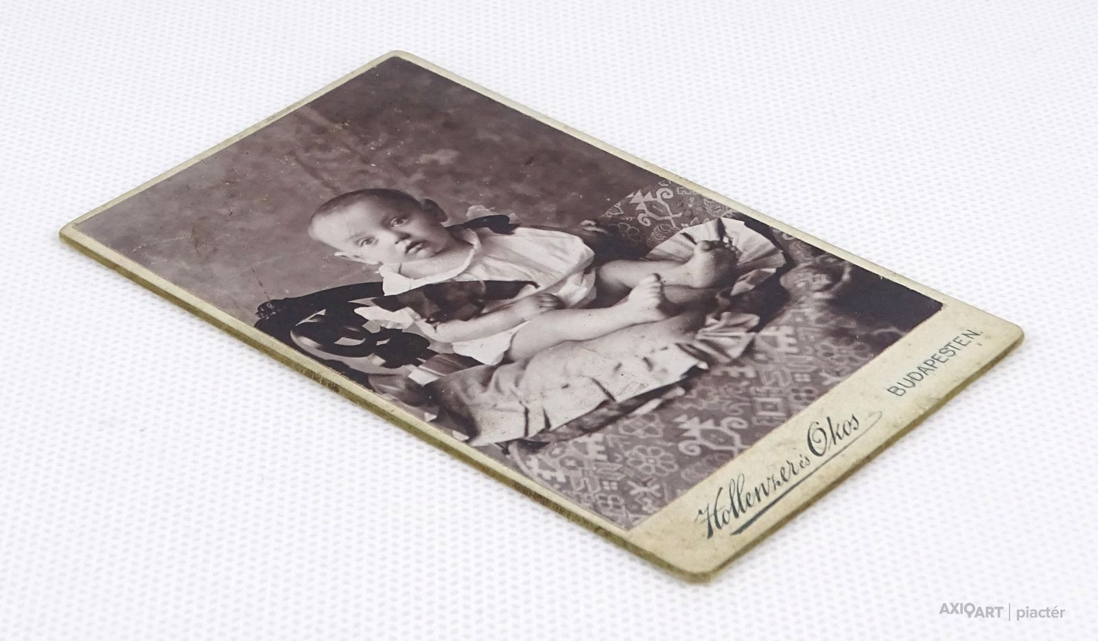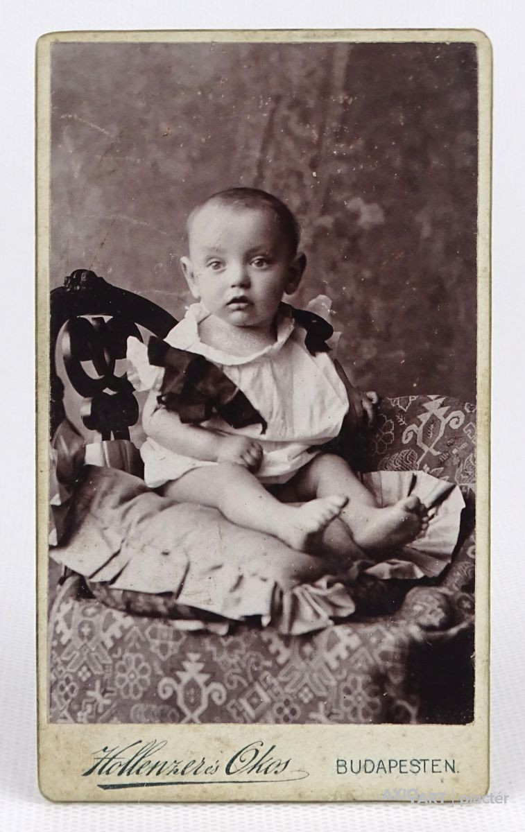 [1Q277/X024/17] Antik, kartonra ragasztott fekete-fehér csecsemő fotográfia az 1900-as évek elejéről. Feliratok: HOLLENZER ÉS OKOS BUDAPESTEN HOLLENZER ÉS OKOS FÉNYKÉPÉSZETI MŰTERME BUDAPESTEN I. KER. KRISZTINA KÖRÚT 135 GRANDE PRIX TÖBBSZÖRÖSEN KITÜNTETVE Magasság: 11 cm Szélesség: 6.5 cm Súly: 0.01 kg