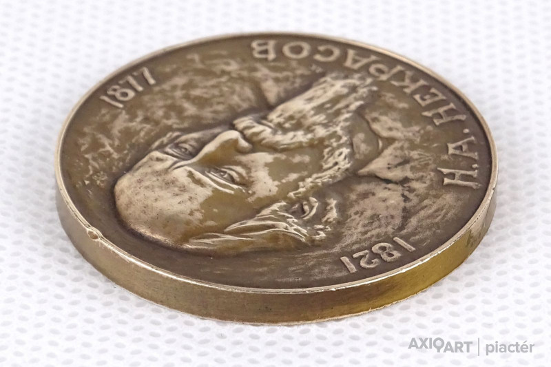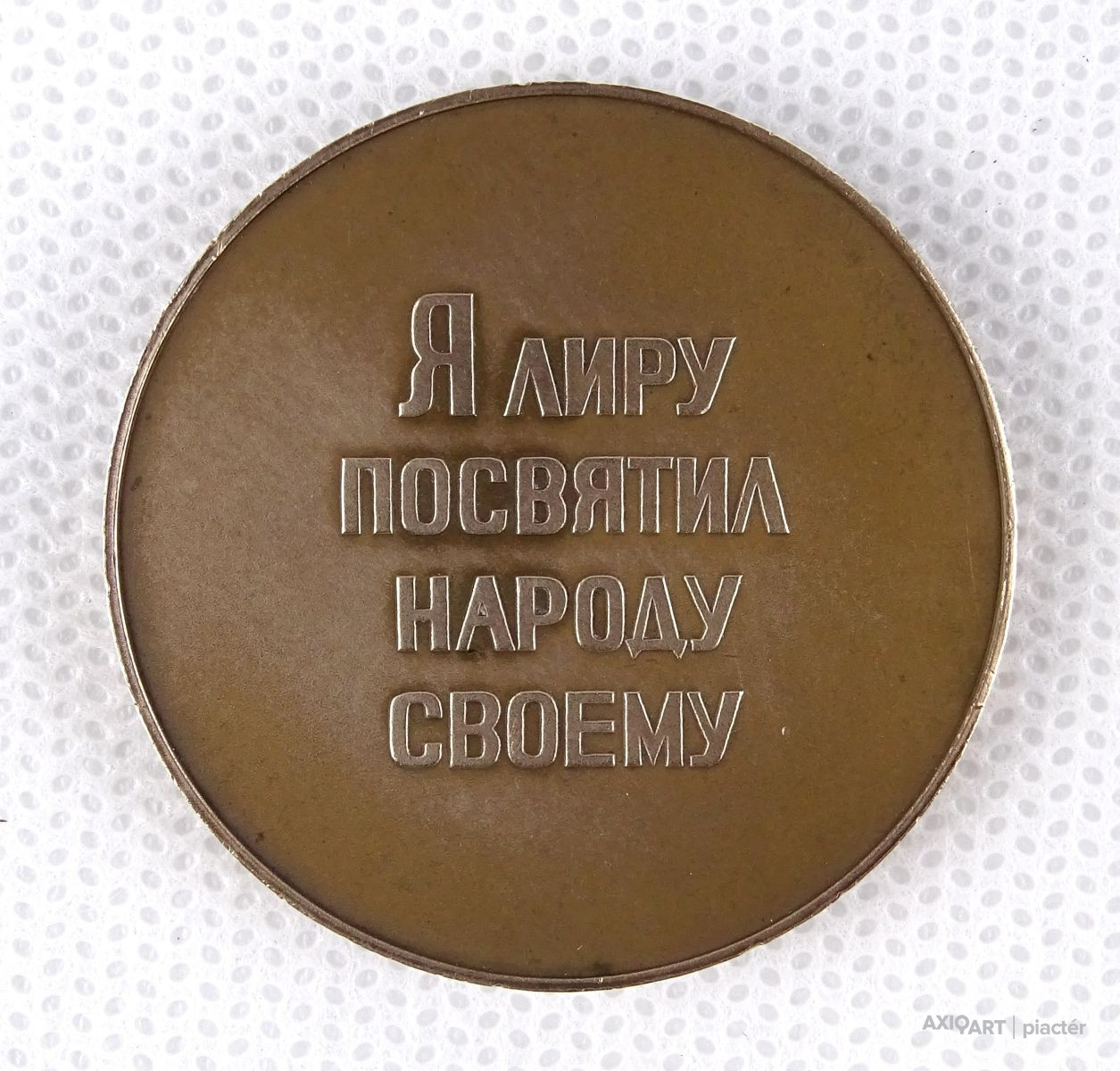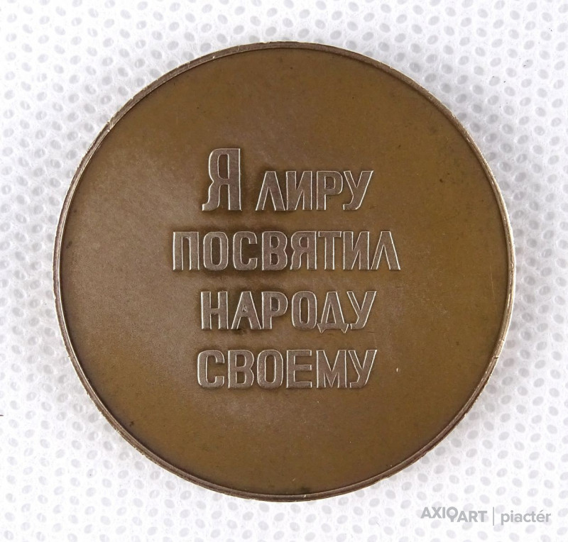 [1M150/X000] Kétoldalas bronz plakett, bronz emlékplakett. Egyik oldalán férfi portré, alatta cirill betűs felirat: Н.А. Некрасов (N.A. Nyekraszov) 1821-1877 Jelzés: AK (A.K.) Másik oldalán cirill betűs felirat: Я ЛИРУ ПОСВЯТИЛ НАРОДУ СВОЕМУ (~ a lírát népemnek ajánlottam) Szélesség: 3.7 cm Súly: 0.03 kg Nyikolaj Alekszejevics Nyekraszov    Ugrás a navigációhozUgrás a kereséshez Nyikolaj Alekszejevics Nyekraszov Élete Született 1821. november 28. Nemyriv, Ukrajna Elhunyt 1877. december 27. (56 évesen) Szentpétervár, Orosz Birodalom Sírhely Novodevichy Cemetery Jellemző műfaj(ok) költészet Nyikolaj Alekszejevics Nyekraszov aláírása Nyikolaj Alekszejevics Nyekraszov (orosz nyelven: Николай Алексеевич Некрасов, – Nyemirov, Podolszki kormányzóság, 1821. november 28. /december 10./ – Szentpétervár, 1877. december 27. /1878. január 8./) orosz költő, író, lapkiadó és szerkesztő. A 19. század közepén a társadalmi elkötelezettségű orosz demokrata költészet legnagyobb képviselője.  Élete Az Orosz Birodalom Podolszki kormányzóságában (a mai Ukrajna Vinnicjai területén) lévő Nyemirovban született (ukránul: Неми́рів, lengyelül: Niemirów). Elszegényedett nemesi családból származott, tizennégyen voltak testvérek. Nagyapjuk csaknem egész vagyonát elvesztette kártyán, katonatiszt apjuk pedig nyugdíjazása után, 1825-ben családjával a megmaradt birtokra, a Volga parti Gresnyevo faluba költözött (ma: Oroszország Jaroszlavli területén). A költő anyja tehetős lengyel polgári családból származott, iskolázott asszony volt. Nyikolaj Nyekraszov Gresnyevóban töltötte gyermekkorát. Ott szembesült apja durva, erőszakos természetével, jobbágyaival szembeni önkényeskedésével. 1832-től 1837-ig a jaroszlavli gimnáziumban tanult. 1838-ban Szentpéterváron felvételét kérte az egyetemre, de vizsgája nem sikerült. Apja akarata ellenére, anyagi támogatásától megfosztva a fővárosban maradt és „önkéntesként” látogatta az egyetem előadásait (1839–1840). Két-három éven át nélkülözött, alig tudta megélhetését biztosítani, néha „éjjeli menedékhelyen” lakott, majd óraadásból élt. A nélkülözés megedzette és nem egészen tiszta, „praktikus” megoldások keresésére szoktatta. Közben már írt prózát, színpadi bohózatot és verseket is. Első megjelent verseskötetét (Mecsti i zvuki, 1841) vegyesen fogadták. 1843-ban almanachok kiadásával kezdett foglalkozni. Ezek egyikében jelent meg többek között Dosztojevszkij első regénye, a Szegény emberek. 1847 elején I. I. Panajevvel együtt (aki jelentős összeget kölcsönzött) bérbe vette, majd színvonalas kiadvánnyá emelte a Szovremennyik című folyóiratot. Ebben jelent meg folytatásokban két (mérsékelt színvonalú) kalandregénye is, melyeket szerelmével, A. Ja. Panajevával (I. I. Panajev feleségével) együtt írt. A folyóirat irányvonala Csernisevszkij belépésével (1854–1862) megváltozott és egyre inkább hangot adott az ún. forradalmi demokraták nézeteinek. A belső ellentétek miatt a szerkesztőség felbomlott, néhány munkatársa távozott, köztük Turgenyev is, aki 1861-ben végleg szakított Nyekraszovval. A cár elleni merénylet után, 1866-ban a Szovremennyiket megszüntették. Ekkor Nyekraszov bérbe vette az Otyecsesztvennije Zapiszki (Hazai jegyzetek) című folyóiratot, amelynek munkatársa lett Szaltikov-Scsedrin is. Utolsó éveiben a Ki él boldogan Oroszországban? című nagy elbeszélő költeményén dolgozott, de már nem tudta az összes tervezett részt elkészíteni. 1875 elején jelentkezett és hosszan elhúzódott súlyos betegsége. Temetésén Dosztojevszkij is jelen volt és beszédben búcsúzott tőle.    Forrás: wikipédia