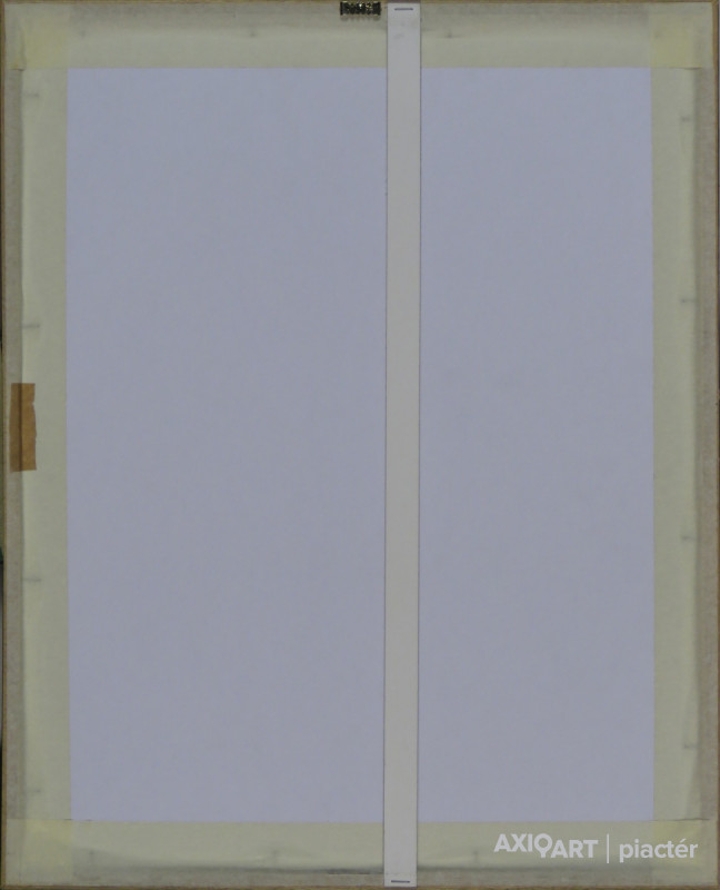 [1Y029/Z018] Olaj farost festmény, üveglap mögött, hibátlan képcsarnokos keretben. Hátoldalán Képcsarnok Vállalat papír címkéje: A művész neve: SCHÉNER MIHÁLY A kép címe: TÁJ Magasság: 66.5 cm Szélesség: 86 cm Súly: 6.54 kg Schéner Mihály festő, grafikus, szobrász, keramikus, bábtervező Medgyesegyháza, 1923-01-9 Elhalálozott: Budapest, 2009. május 11. Honlap: http://www.kormendigaleria.hu/kiadvany.html 1942-1947: Magyar Képzőművészeti Főiskola, tanára: Rudnay Gyula. 1978: Munkácsy-díj; 1984: érdemes művész; 1989: kiváló művész; 1995: Kossuth-díj. 1992-től a Magyar Művészeti Akadémia, 1993-tól a Széchenyi Irodalmi és Művészeti Akadémia tagja. 1956-ig tanított. 1982: Nagyatádi Faszobrász Alkotótelep, 1985: Nemzetközi Acélszobrász Alkotótelep, Dunaújváros. A stílusában felismerhető, mégis sokféle műtárgyat létrehozó ~ gazdag, állandóan alakuló életműve a folyton változó világban helyét kereső, az alkotói szabadságot megvalósító XX. századi képzőművész példázata lehetne. Magát expresszív-szürrealista alkotónak nevezi. Egyaránt dolgozik festékkel, textillel, fával, fémmel. Rajzol, szerkeszt, farag, épít, gyúr, varr és ragaszt, felhasználja a mézesbábok öntőformáit. Festő, rajzoló, textilszobor- és bábkészítő, fazekas, asztalos, esztergályos. Háromlépcsős folyamatban gondolkozik: rajzban tervez, majd fest, szobrot készít, “formába önt”, mindig a végső plasztikai megoldást keresi. Ami állandó és mégis játékosan változékony megjelenésű Schéner művészetében, az a gyermekkori emlékek által meghatározott népi mesterségek iránti tiszteletet kifejező motívumkincs, a tárgyi folklór formakészlete, amely már-már kézjegyként ismétlődik munkáin. Mitologikussá nőtt képzelete új lényeket teremt, pl: a Pigulát, amely disznótestű, emberfejű teremtmény. Schéner festményein a szürrealista motívumokat konstruktív szerkezetbe rendezi, a geometriát és az organikus természeti motívumokat egyaránt beépíti műveibe. A népi, népművészeti formakincsből merített lovas huszárok, betyárok, szegénylegények cifra szűr mentéje, piros csákója, fekete csizmája, az önálló életet élő zsinórdíszek és mézeskalács bábok, a kiskocsik a gyermekkori vásárok, búcsúk színes forgatagába vezet. A primér motívumokat aztán felváltják a vastagon felhordott felületbe karcolt jelek, vonalhálózatok, amelyek a játszó gyermek homokba rajzolt ábráit, a pásztorember fába vésett üzeneteit, az ősember barlang falába rótt mágikus jeleneteit idézik meg. A művész pillanatnyi érdeklődésének megfelelően a színek búvópatakként tűnnek el és jelennek meg ismét. A 60-as években leginkább a formákkal való játék érdekelte, a festmények felülete egyre gazdagodott: a táblaképek felületén applikációk jelentek meg, vagy lemállasztott rétegek hagyták maguk után hiányukat, motívumok nélküli ősformák, archetipikus képzetek bukkantak fel művészetében. A véletlenszerűnek látszó rétegekkel való játék azonban tudatos komponálás eredménye, amely később nyilvánvaló ritmusnak és formai szerkesztettségnek adja át a helyét, mint a Törvénytáblák c. sorozaton. A különböző művészi kifejezési formák egymásra termékenyítő hatással vannak, át- meg áthatják egymást. Textilszobrai, amelyekkel új műfajt teremtett, ugyanazzal az automatikus, expresszív-szürrealista módszerrel készülnek, mint festményei. A hagyományosan a népművészetben alkalmazott anyag, a filc lehetőséget ad a népi formakincs felelevenítésére, amely azonban a művész különös szürrealista átiratában jelenik meg. A szívekkel kivarrt, zsinórdíszes Posztókotlós c. művén mézesbábok lógnak, hátán huszárok lovagolnak. Egész sor textilből készült kéz-plasztikát alkot, amelyeket az ujjakra rávarrt díszekkel öltöztet, személyesít meg. A színes-különös világból aztán ~ újra puritán képi és formai rendbe juttatja el a nézőt, majd nemsokára tépett, gyűrt, vágott, csorgatott, repedezni hagyott szenvedélyesen vonagló képi felületeket hagy hátra. Schéner készített apró gyermekjátékokat, térstruktúra-tereket, mászókákat is. A magyar népi formák mellett szürreális játékaiban gyakran alkalmaz görög mitológiai alakokat, “elkentaurosodott” lovakat, Gorgó-fejeket, sellőket, hárpiákat, Pán-ábrázolásokat. Schéner nemcsak saját művészetéről publikál, hanem művésztársairól is számos írása jelenik meg, elsősorban az Új Auróra c. folyóiratban, amelynek egy ideig főmunkatársa volt. Irodalom kiállítása, Magyar Építőművészet, 1962/4. Húsz év után, Művészet, 1965/4. BOZÓKY M.: ~, Tiszatáj, 1968/5. PERNECZKY G.: Nincs uborkaszezon, Élet és Irodalom, 1969. augusztus 8. BARÁNSZKY-JÓB L.: ~, Művészet, 1969/9. LÁSZLÓ GY.: ~ kaposvári kiállítása, Jelenkor, 1969/4. MAJOR M.: Pásztorok, betyárok, huszárok - kezek, Tükör, 1970. szeptember 15. FRANK J.: Bemutatjuk ~t, Élet és Irodalom, 1972. május 6. ról kiállítása ürügyén, Képzőművészeti Almanach, Budapest, 1972 Sötétkék kokasok, Élet és Irodalom, 1973. szeptember 9. MAJOR M.: ~ játékai, Élet és Irodalom, 1974. július 27. BARTA J.: Egy különös művész, Alföld, 1974/6. VADAS J.: Szárnykészítők, Élet és Irodalom, 1975. október 4. JUHÁSZ F.: A halál ellen játszani, Élet és Irodalom, 1975. május 17. PAP G.: Kincsek és műkincsek, Művészet, 1975/6. P. SZŰCS J.: Az utak kettéválnak, Művészet, 1978/3. Békési művészet, Művészet, 1978/7. SZAMOSI F.: ~ [kismonográfia], Budapest, 1978 VADAS J.: Játék a játékkal, Élet és Irodalom, 1979. augusztus 18. NÉMETH L.: ~ műveiről, Művészet, 1979/4. MIKLÓS P.: Mit akar ez a múzeum?, Művésze