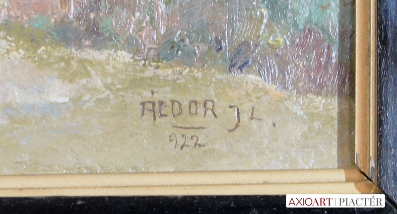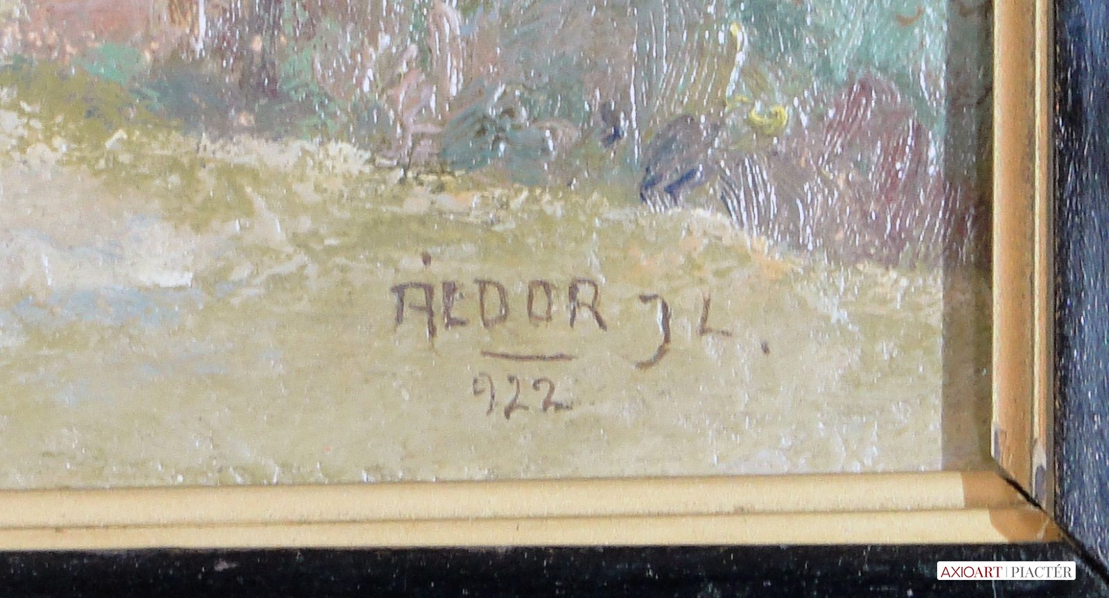 [0C271/101] Olaj karton festmény, jelezve jobbra lent ÁLDOR J. L. 922 Szép állapotú kép, régi korabeli fekete vastag fa keretben. Magasság: 29 cm Szélesség: 37 cm Súly: 0.82 kg