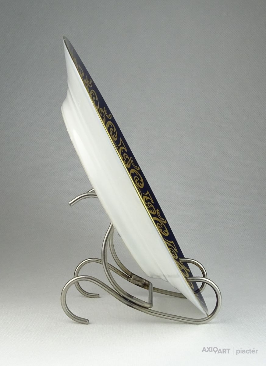 [0P008/X042] Hibátlan állapotú, jelzett Altwien családi porcelán, porcelán tányér. Rajta négy alakos családi fotográfia. Pereme kobaltkék színű, arannyal gazdagon díszített. A tányér hátoldalán (csak onnan látszódik) kisebb hajszálrepedés található. Szélesség: 24.5 cm Súly: 0.428 kg