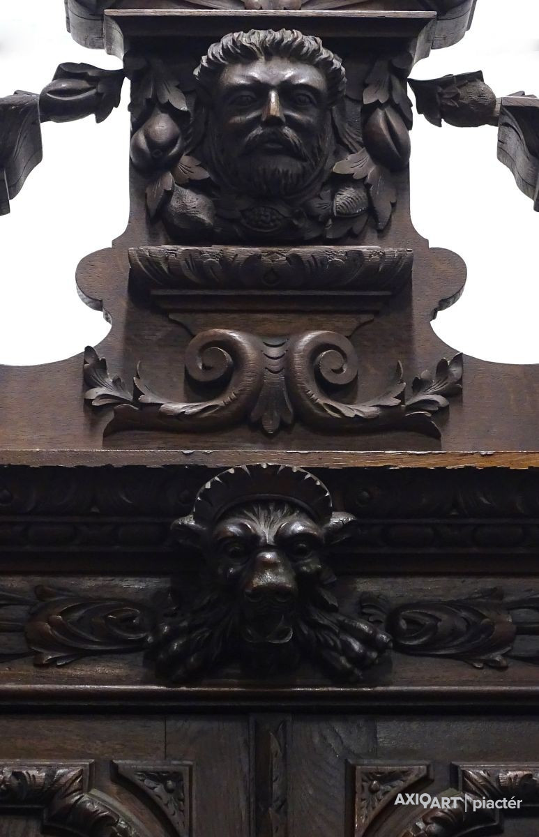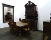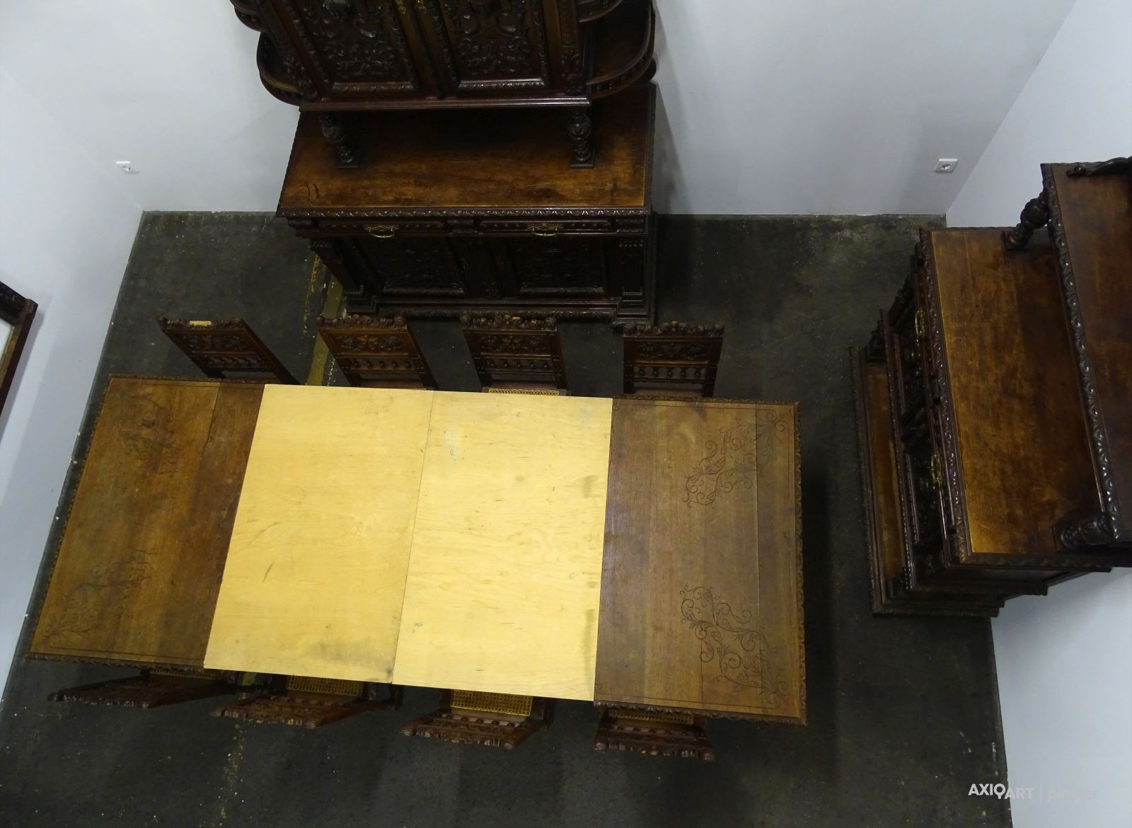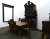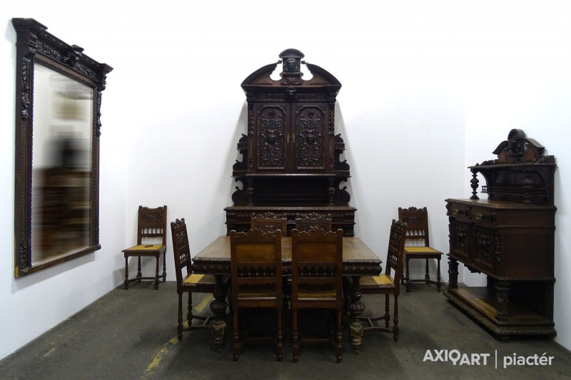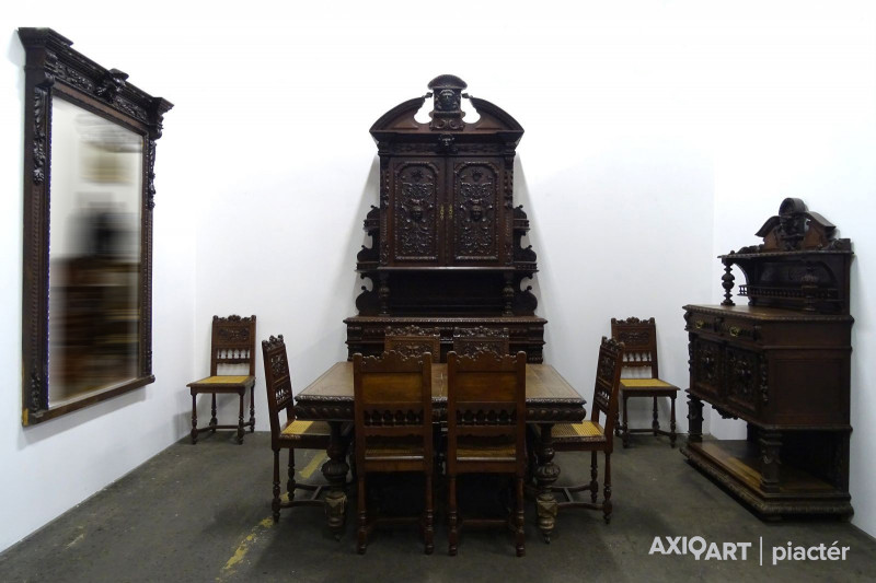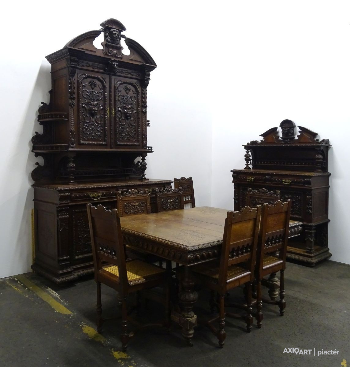[0X506/BX-7] Antik sötétbarna színű, szép állapotú, nagy méretű, dúsan faragott ónémet garnitúra az 1800-as évek végéről. A garnitúra részei: - 1 darab nagy méretű tálalószekrény - 1 darab kis méretű tálalószekrény - 1 darab nyitható étkezőasztal - 8 darab támlás, gyékényes szék - 1 darab hatalmas tükör Az egyik szék gyékény ülőfelülete sérült.