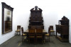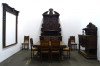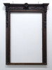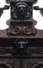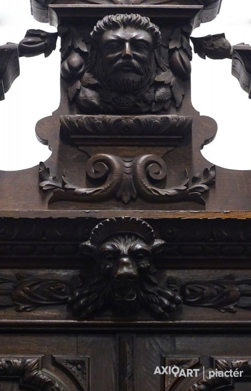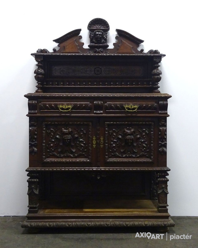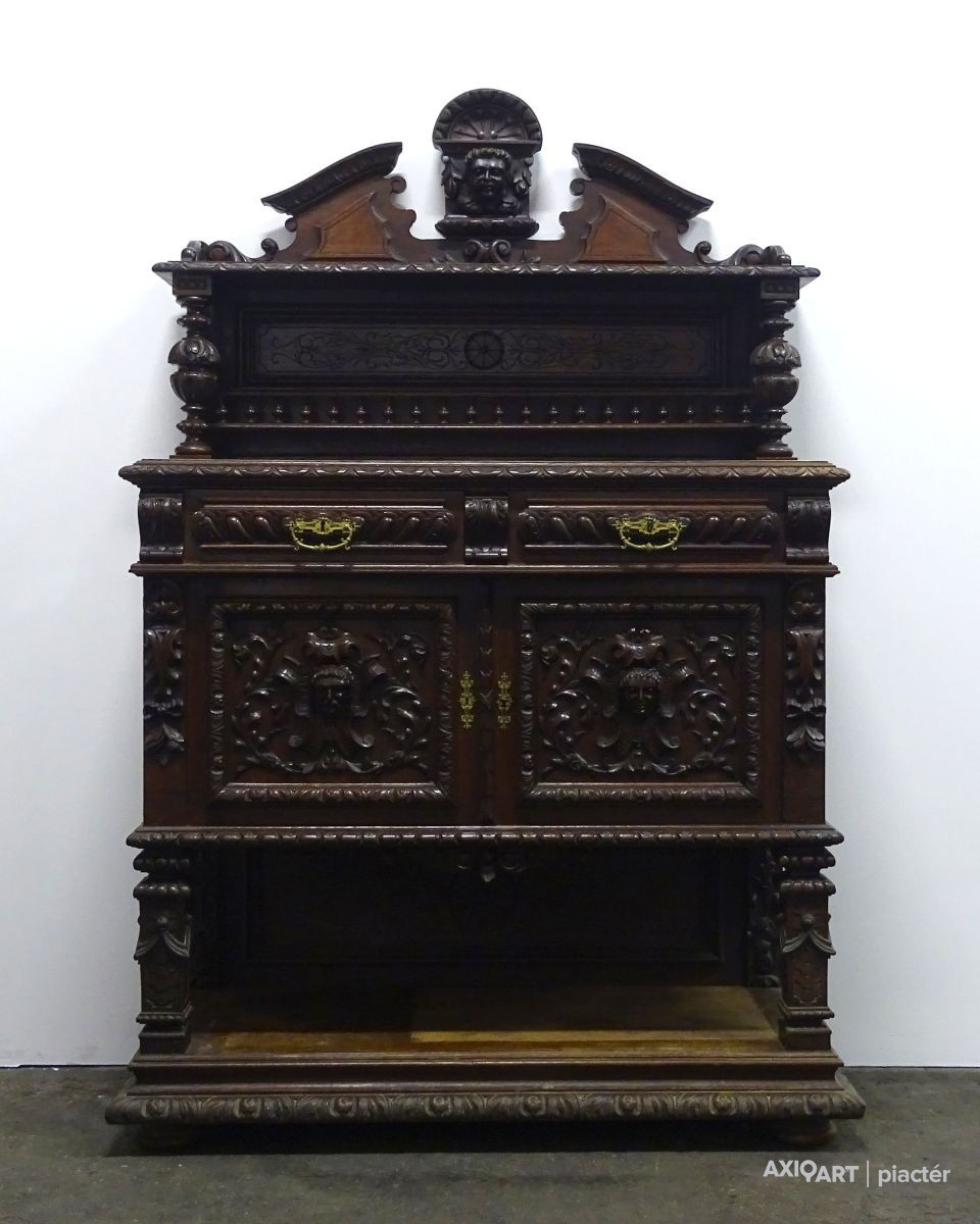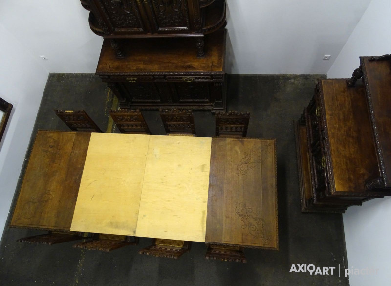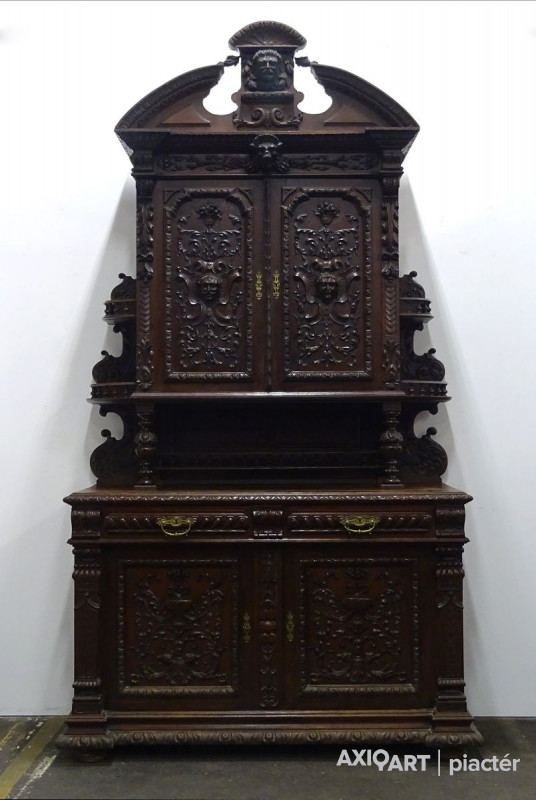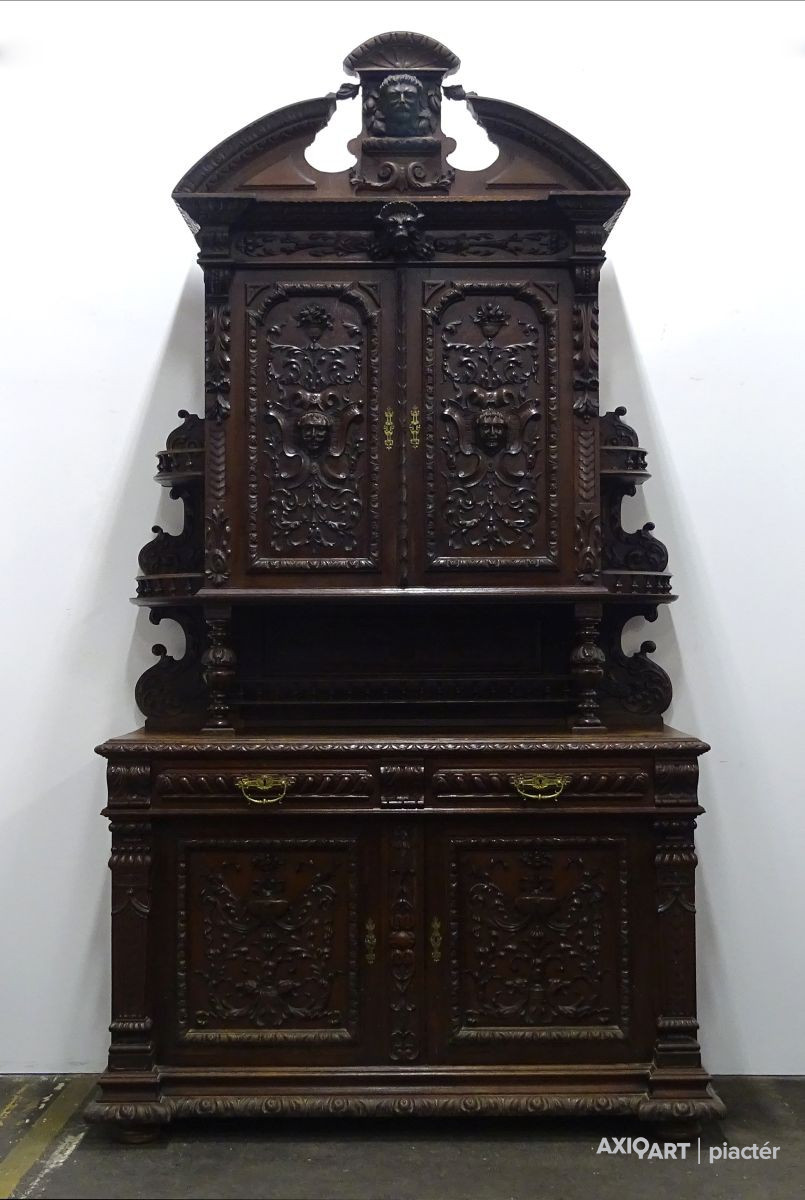 [0X506/BX-7] Antik sötétbarna színű, szép állapotú, nagy méretű, dúsan faragott ónémet garnitúra az 1800-as évek végéről. A garnitúra részei: - 1 darab nagy méretű tálalószekrény - 1 darab kis méretű tálalószekrény - 1 darab nyitható étkezőasztal - 8 darab támlás, gyékényes szék - 1 darab hatalmas tükör Az egyik szék gyékény ülőfelülete sérült.