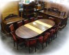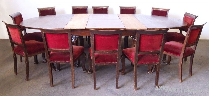 [0N255/UZ-K] Gyönyörű, komplett, nagypolgári, hatalmas részletgazdag faragványokkal díszített tálaló garnitúra az 1920-30 as évekből. A garnitúra darabjai: - Vitrin (208 x 148 x 68 cm) - Nagy tálaló (155.5 x 251 x 78 cm) - Kis tálaló szekrény, komód (128 x 148 x 70 cm) - Nagyméretű, nyitható ovális alakú étkező asztal (79 x 133 x 181.5 cm, kinyitva: 133 x 310 cm) - 12 darab támlás oroszlánlábas szék (90 x 54 x 49 cm) Az asztal egy a belsejéből kihajtható szín azonos betéttel (61 cm) és kettő darab fenyő betétlappal (2 x 33.5 cm) rendelkezik.A székek epedarugósak, kényelmesek, kárpitjuk egységes bordó színű.