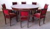 Az asztal egy a belsejéből kihajtható szín azonos betéttel (61 cm) és kettő darab fenyő betétlappal (2 x 33.5 cm) rendelkezik.A székek epedarugósak, kényelmesek, kárpitjuk egységes bordó színű.