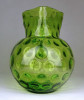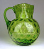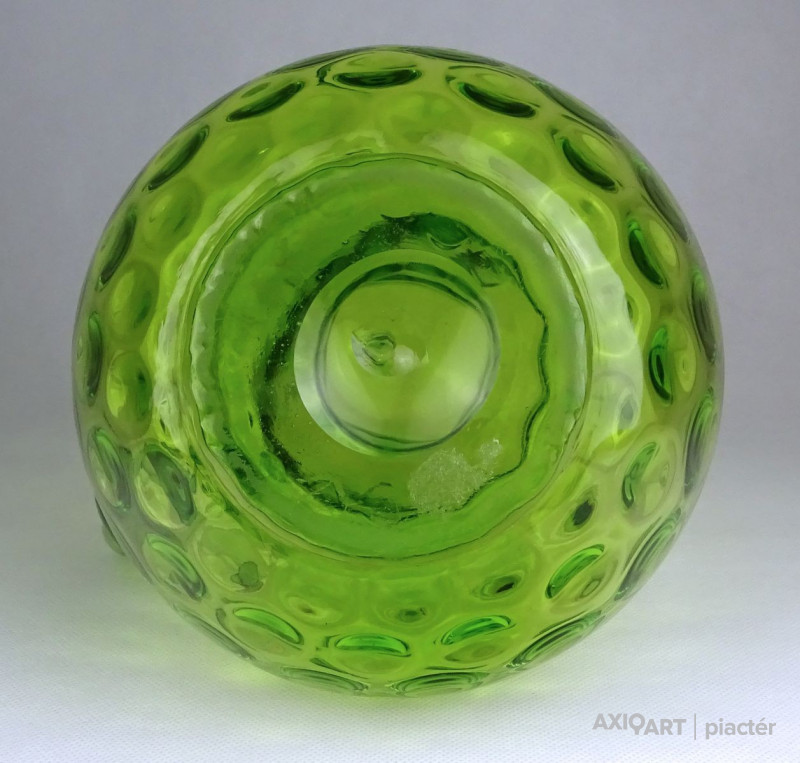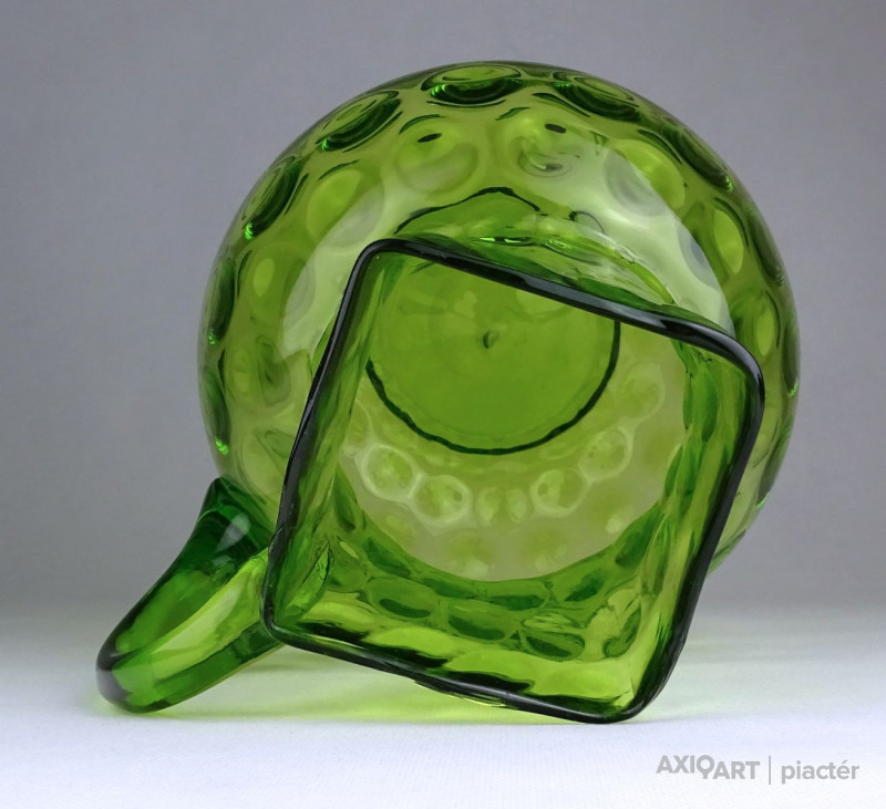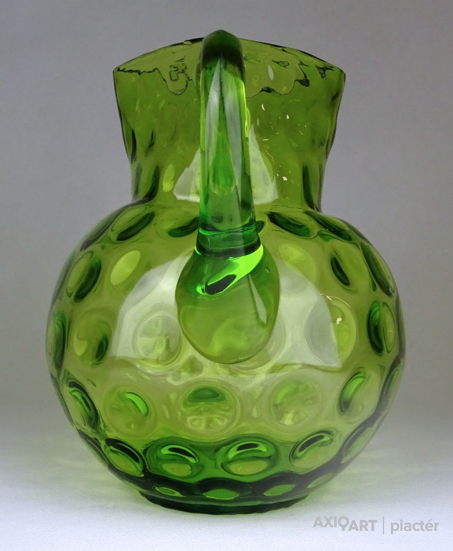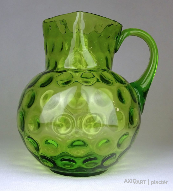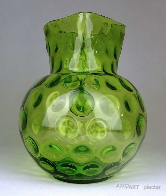 Hibátlan állapotú, hólyagos, lencsés zöld színű fújt üveg hutaüveg nagy méretű kancsó.