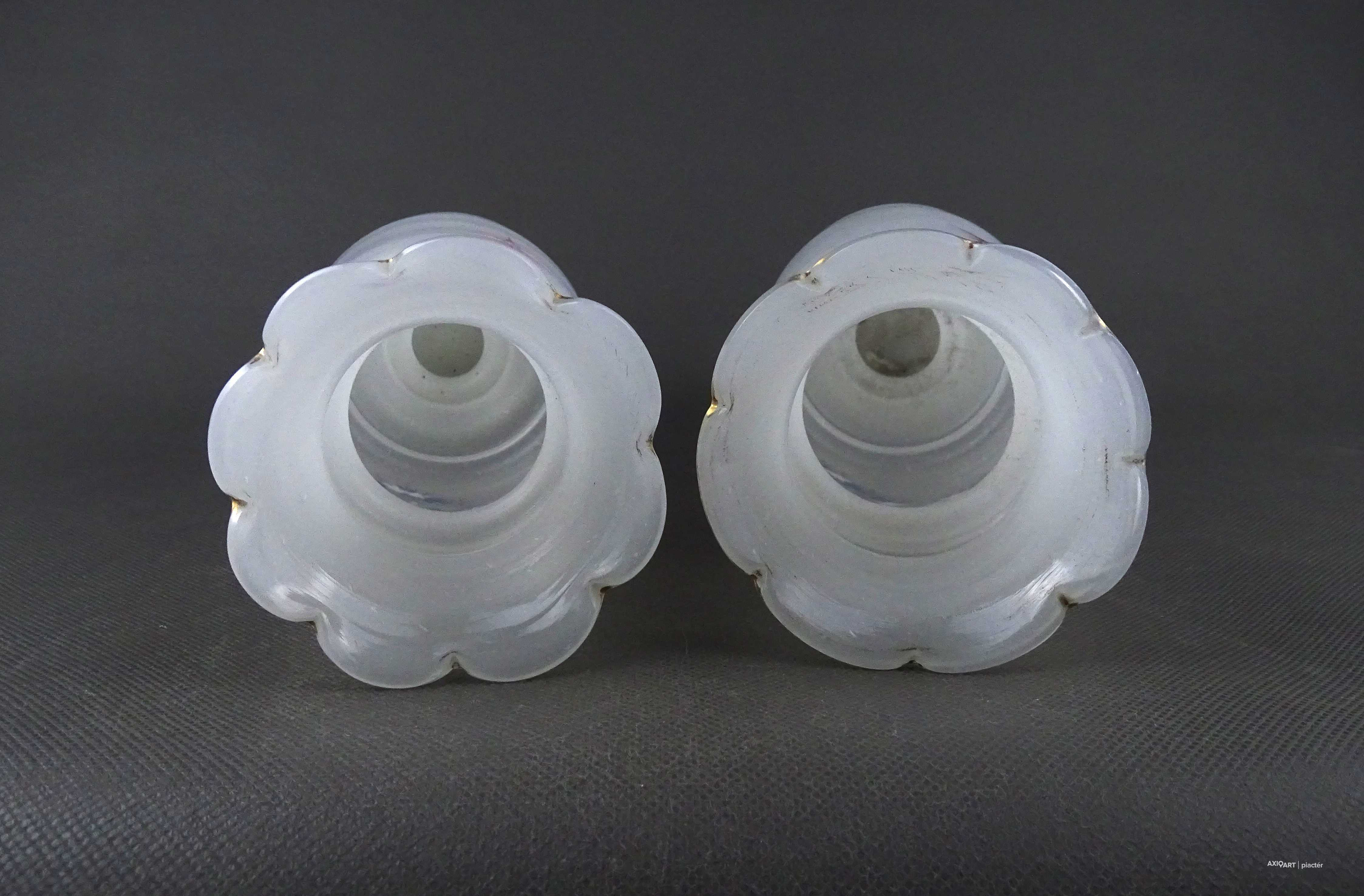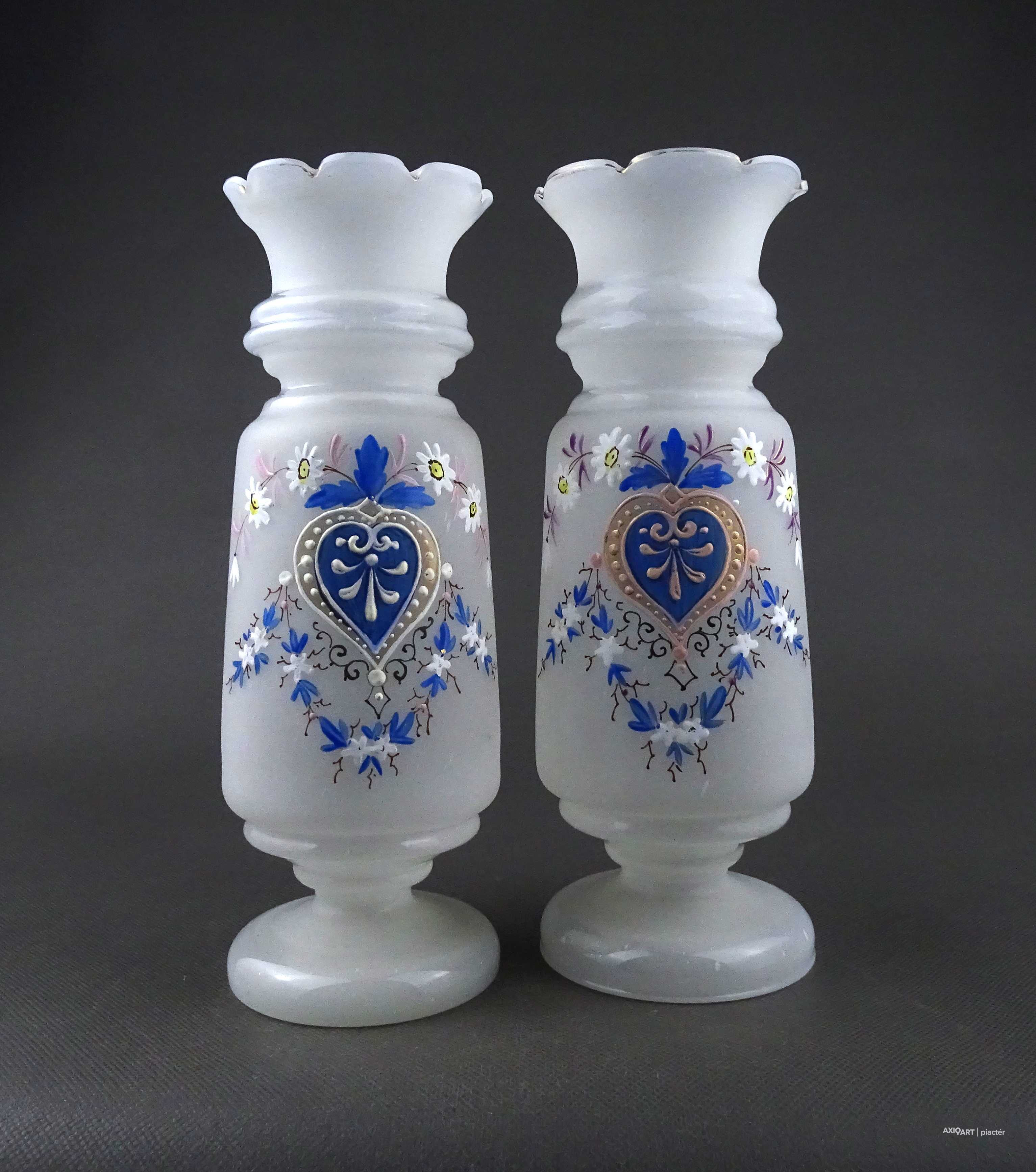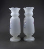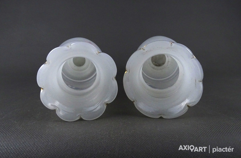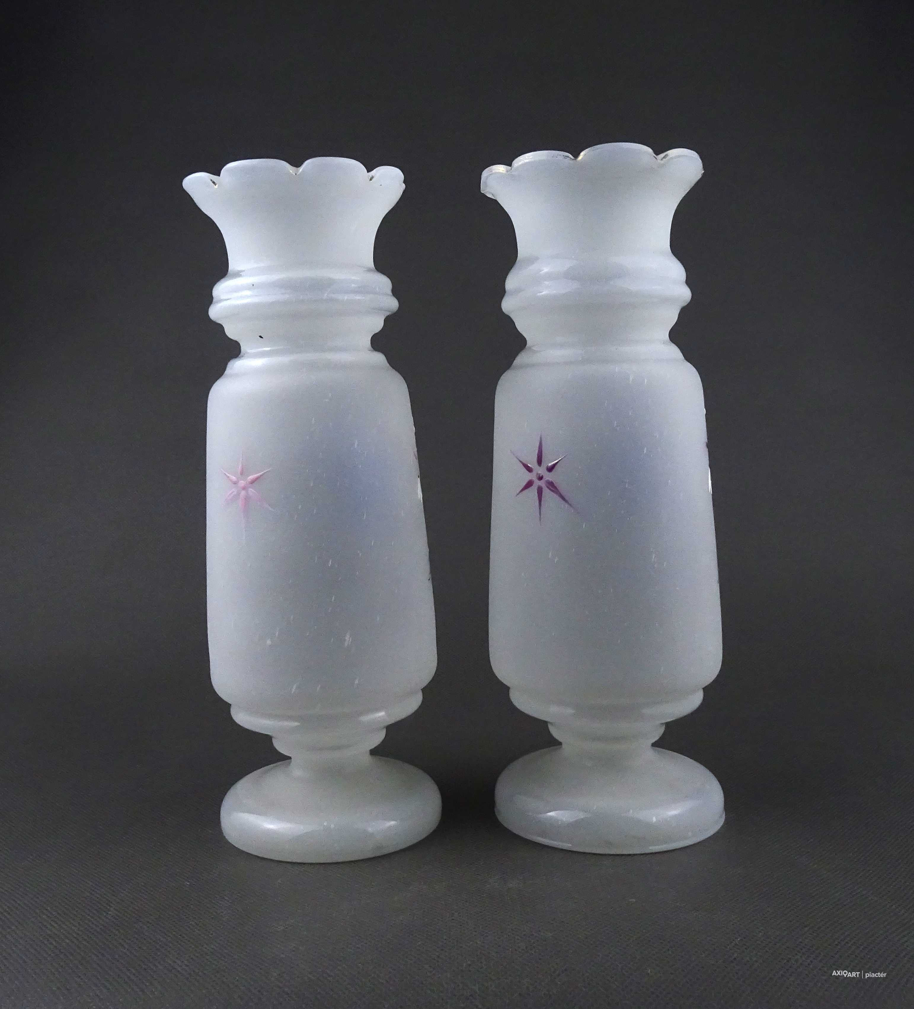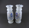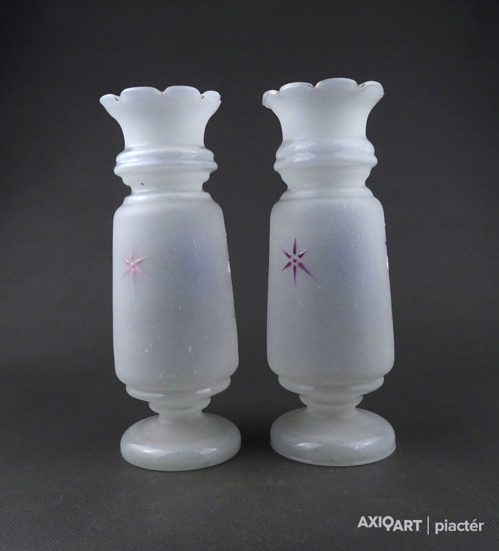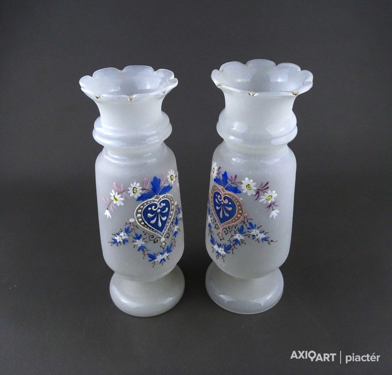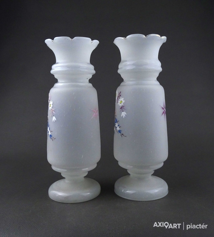Antik 1880 körüli festett virágmintás fehér kalcedon üveg váza pár 23 cm