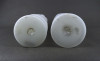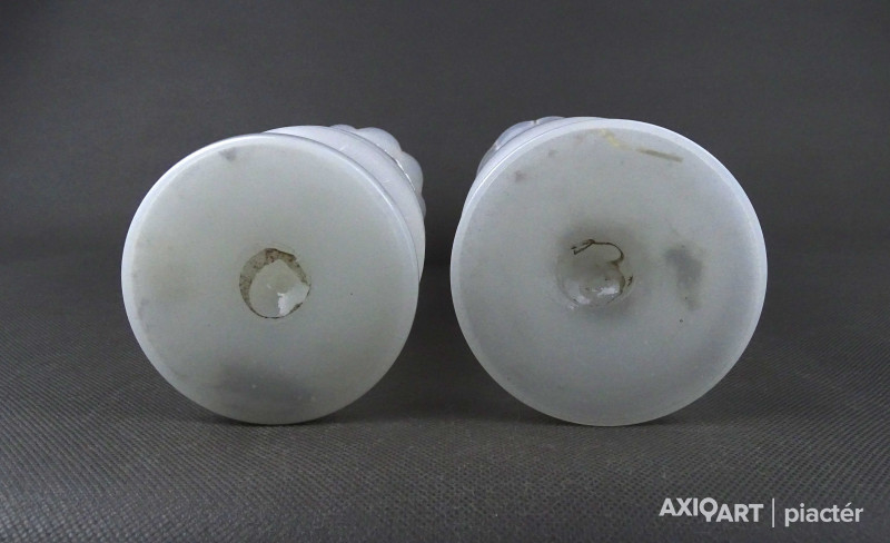 Antik, hibátlan állapotú, kézifestésű virágokkal díszített fehér kalcedon üveg, opálüveg művészi fújtüveg váza pár. Talpukon a fújás, szakítás nyomai láthatók.