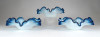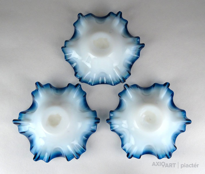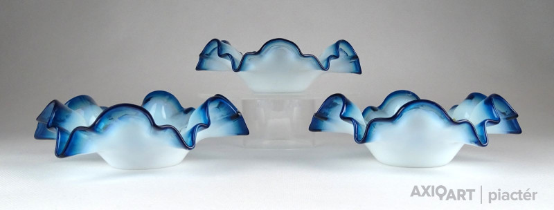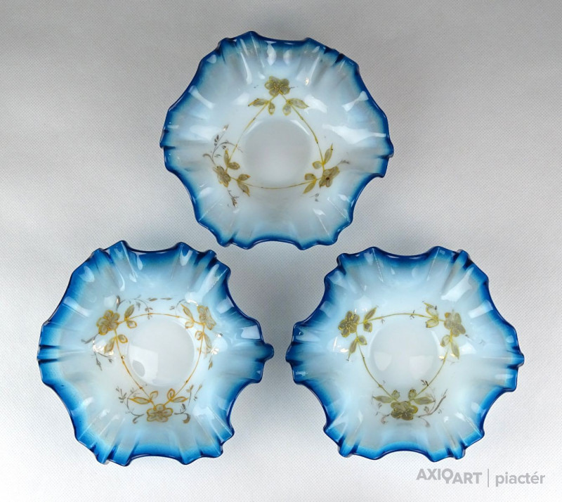 Antik fodros szélű fújt szakított üveg desszertes készlet. Aljukon látható a szakítás nyoma. Színe tejfehér, pereme kék, illetve aranyozott.