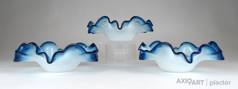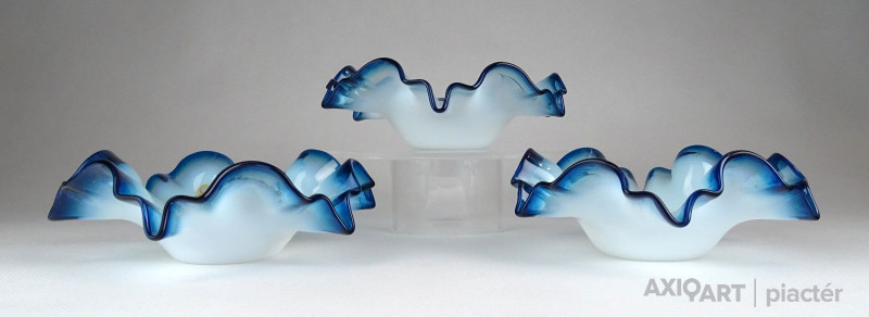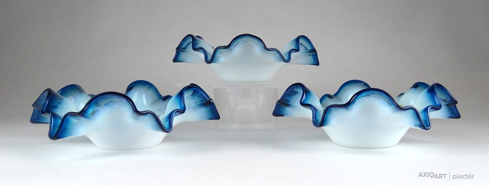 [1G072/X126] Antik fodros szélű fújt szakított üveg desszertes készlet. Aljukon látható a szakítás nyoma. Színe tejfehér, pereme kék, illetve aranyozott. Magasság: 5.3 cm Szélesség: 15 cm Súly: 0.58 kg