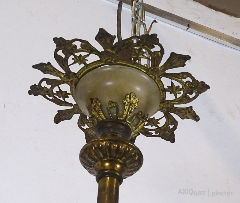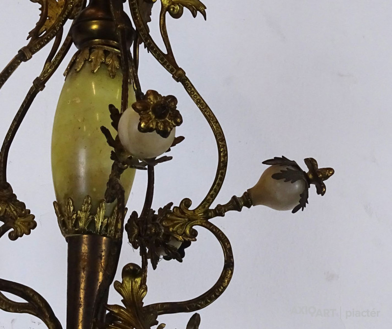 Nagyméretű antik ötkarú tűzarany csillár. A karok gyertyákban végződnek, kisméretű (E14) izzó való bele. A tűzaranyozott réz testet márvány elemek díszítik.