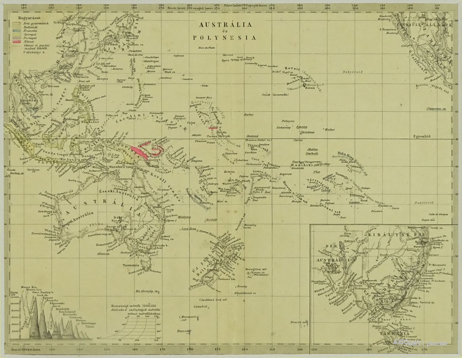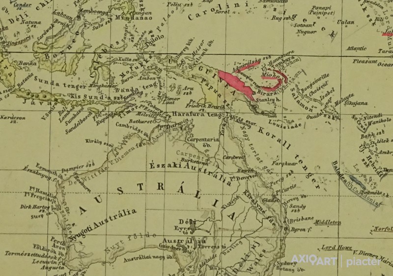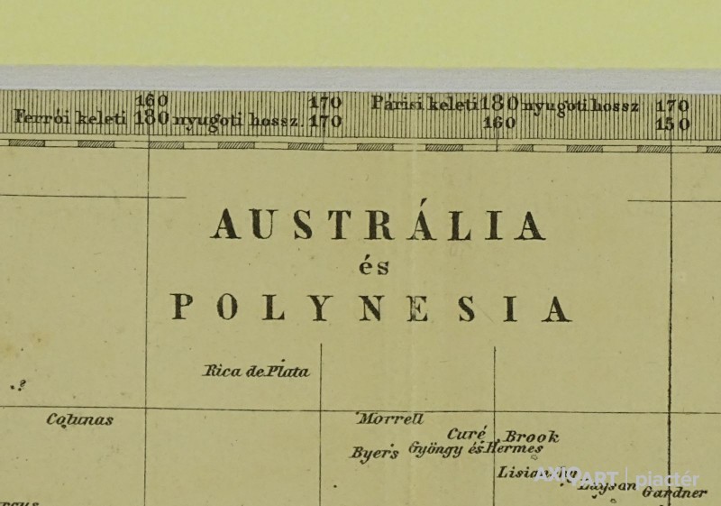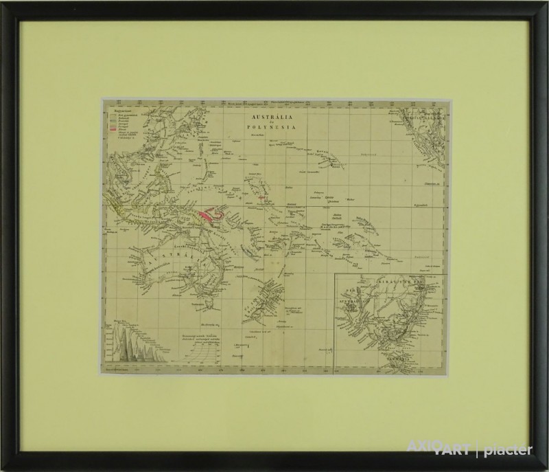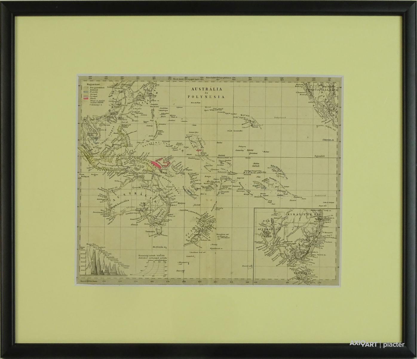 [0L612/111] Szépen keretezett, paszpartuban és üveglap mögött található, hibátlan, ajándékozható állapotban lévő acélmetszet térkép. Feliratok: AUSTRÁLIA ÉS POLYNESIA Magasság: 33.5 cm Szélesség: 39.5 cm Súly: 0.88 kg