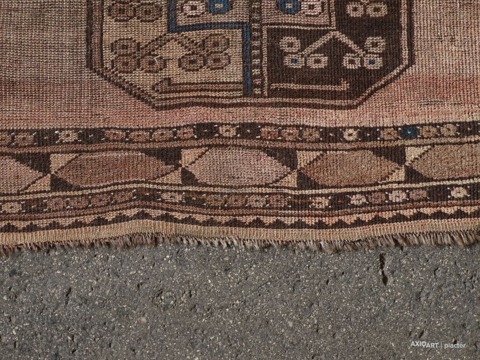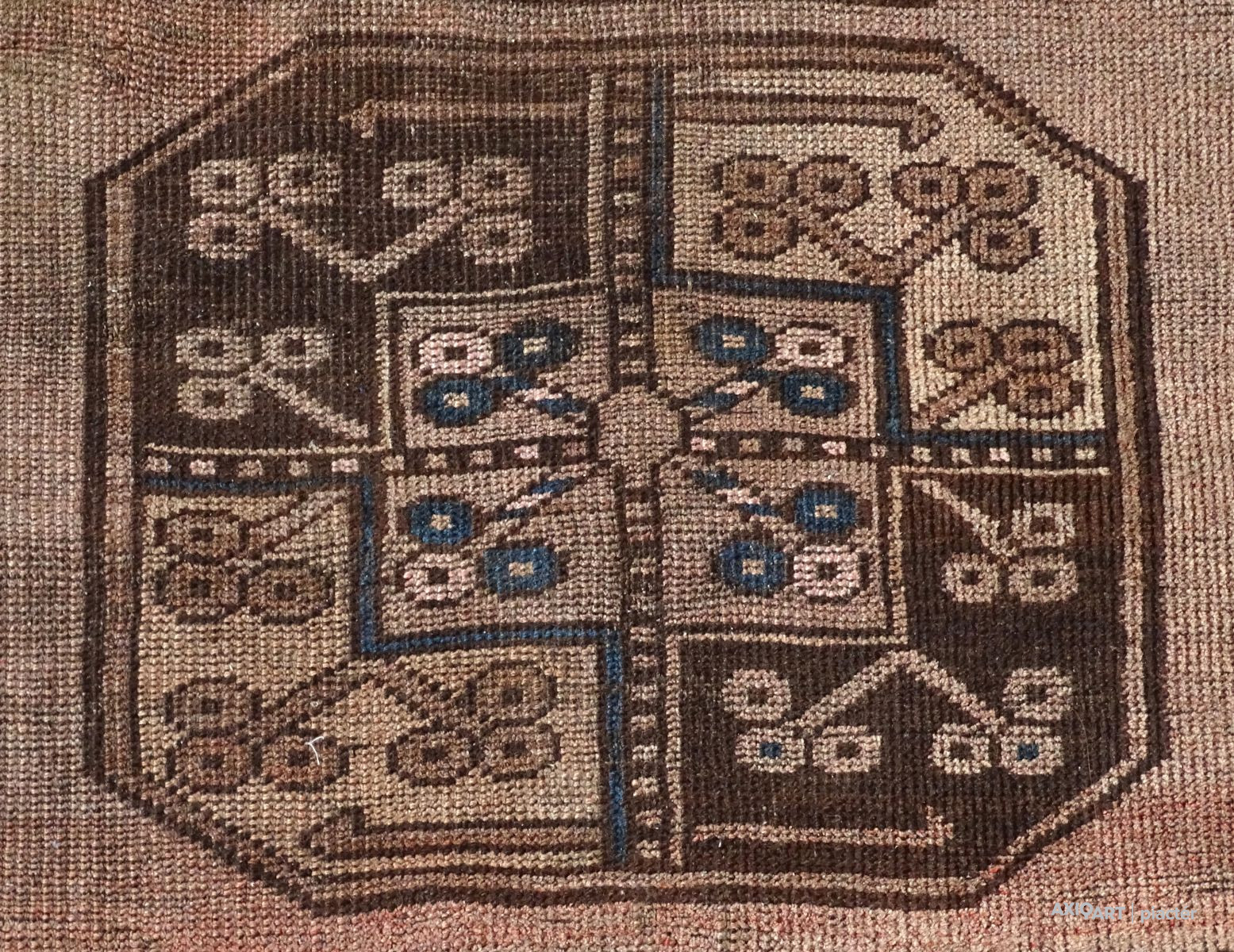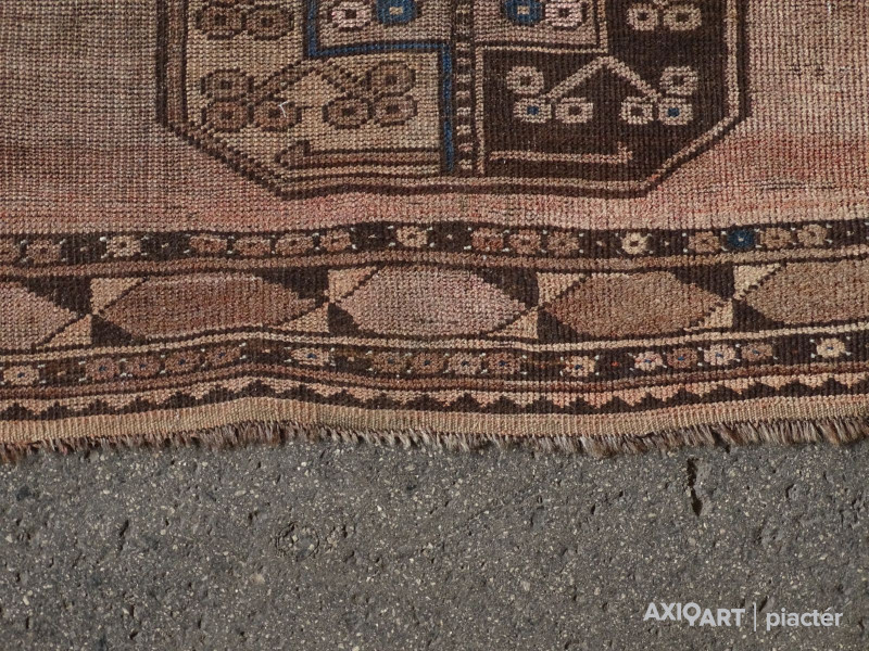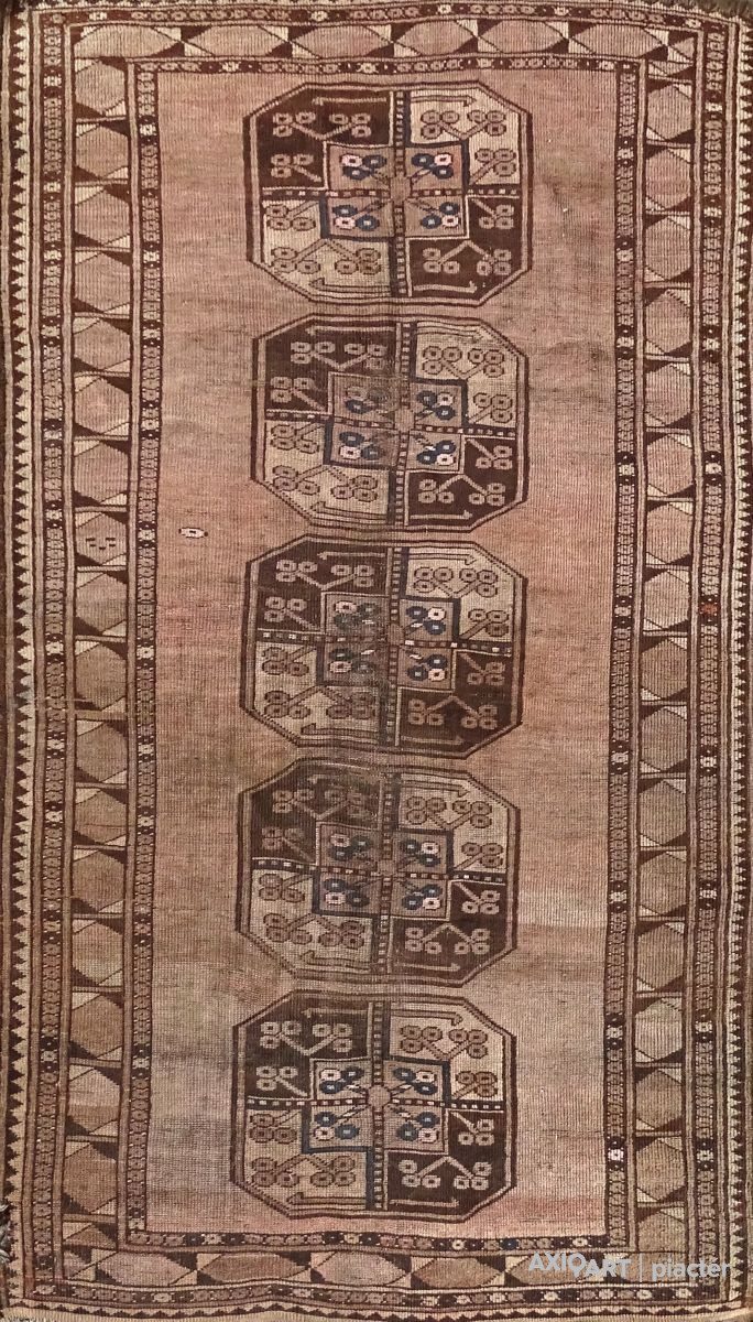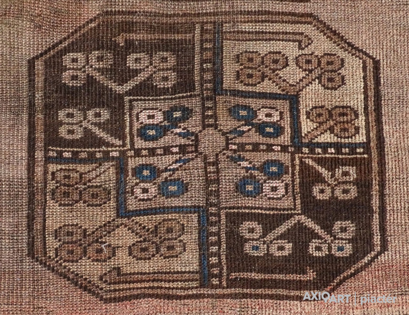Antik, XIX. századi, kézi szövésű barna tónusú szőnyeg, középszőnyeg. Közepén öt darab elefánttalp minta található. Állapota kopottas, szélén egy helyen sérült, lásd fotó.
