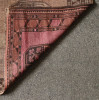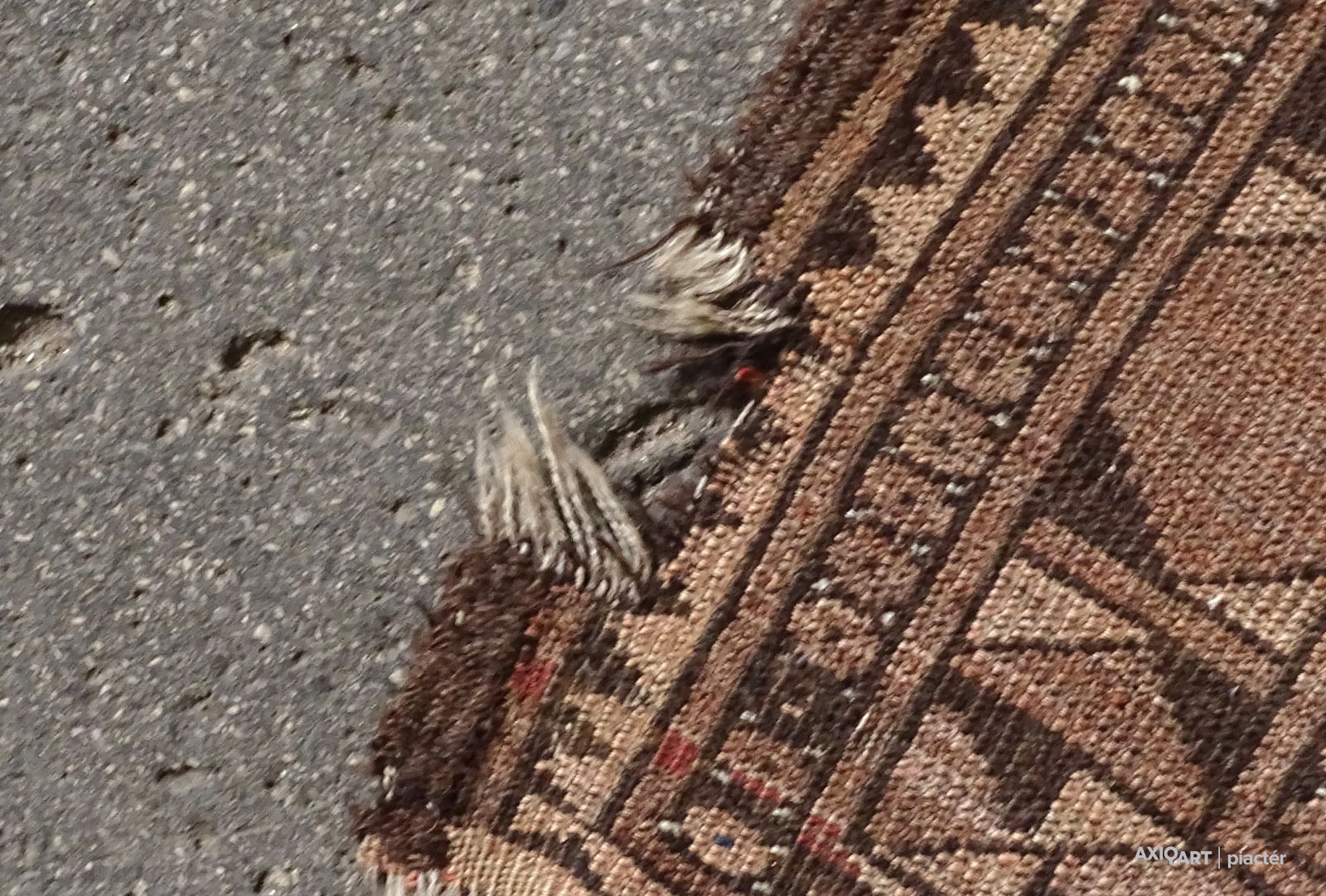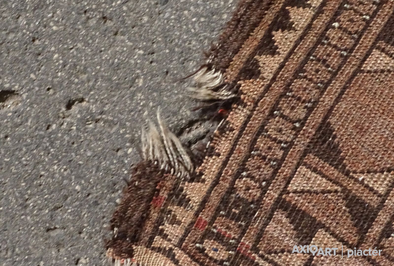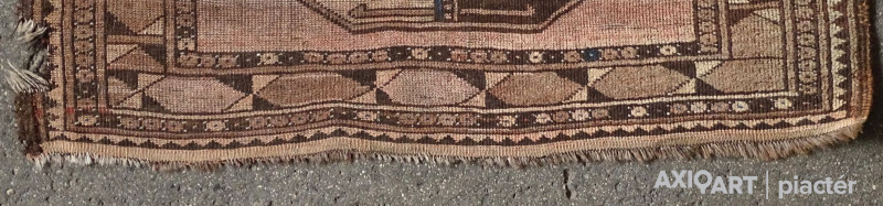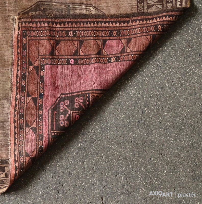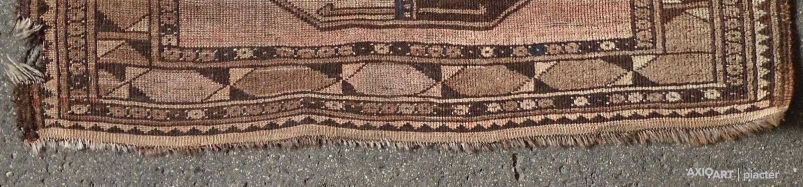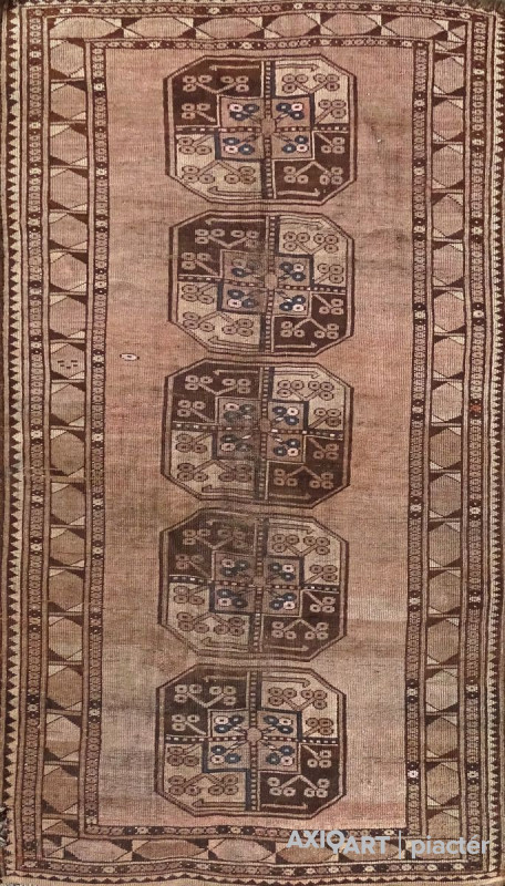 Antik, XIX. századi, kézi szövésű barna tónusú szőnyeg, középszőnyeg. Közepén öt darab elefánttalp minta található. Állapota kopottas, szélén egy helyen sérült, lásd fotó.