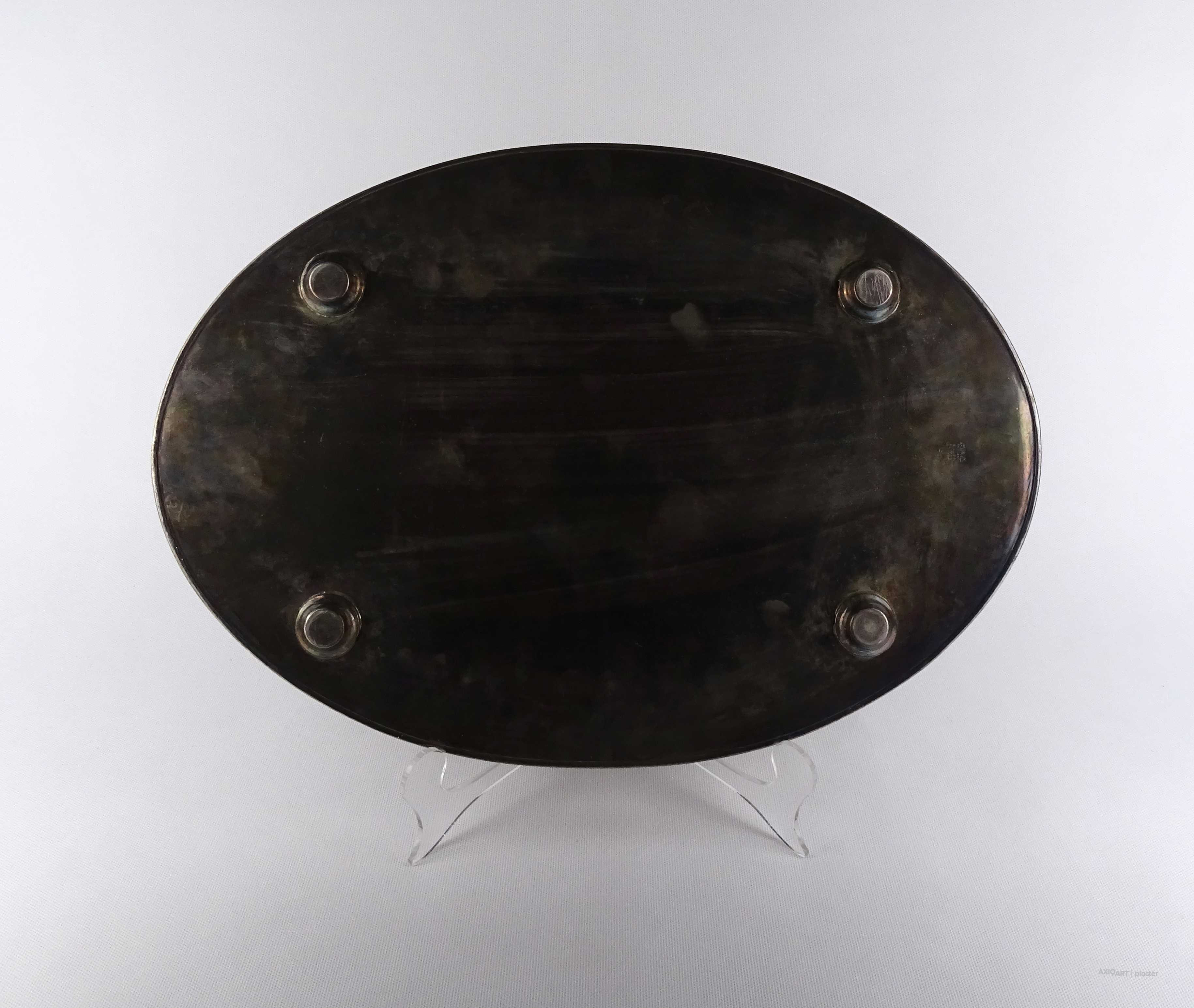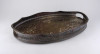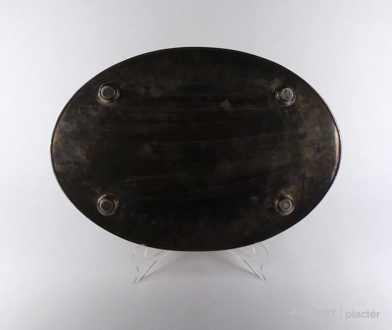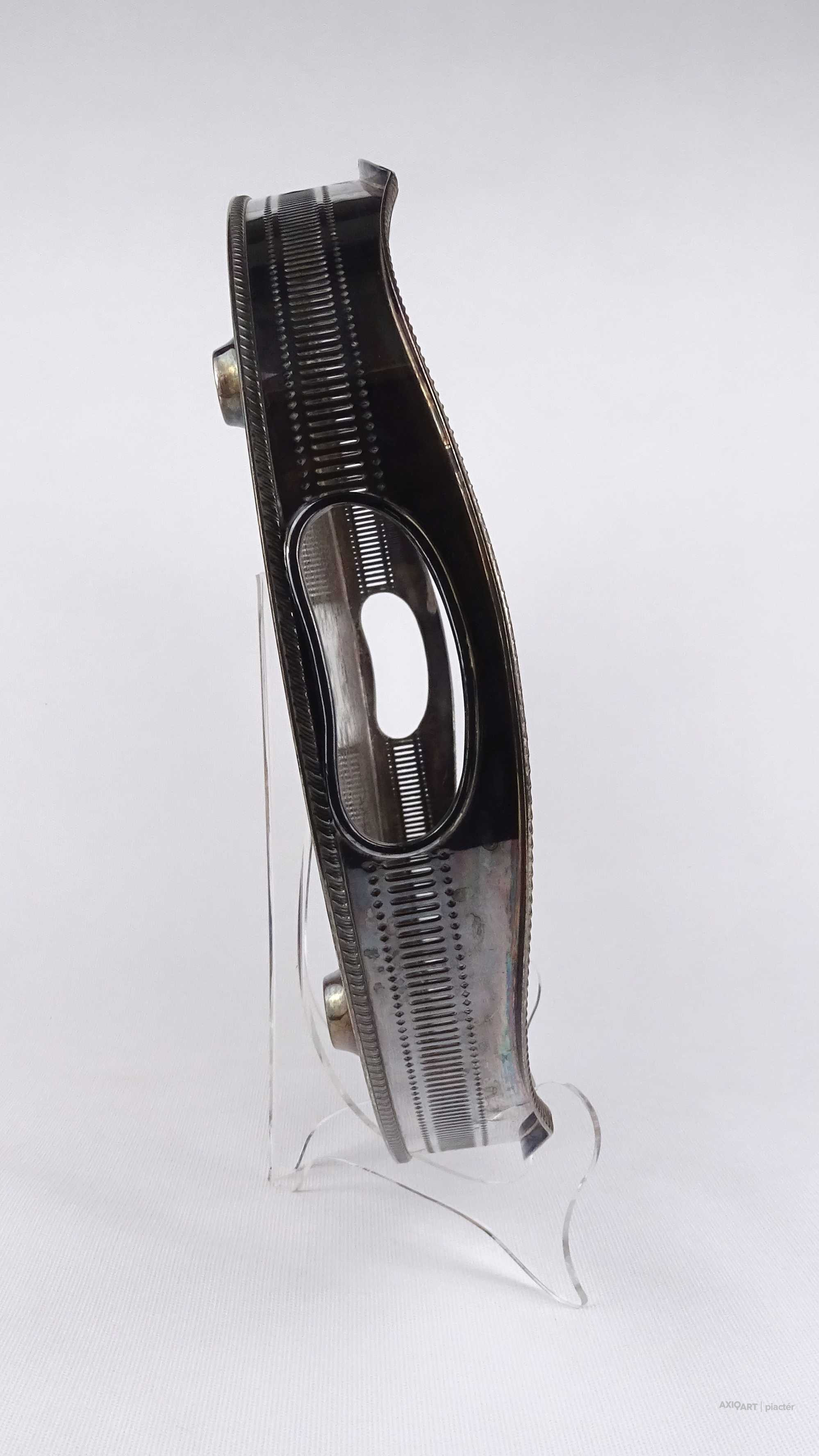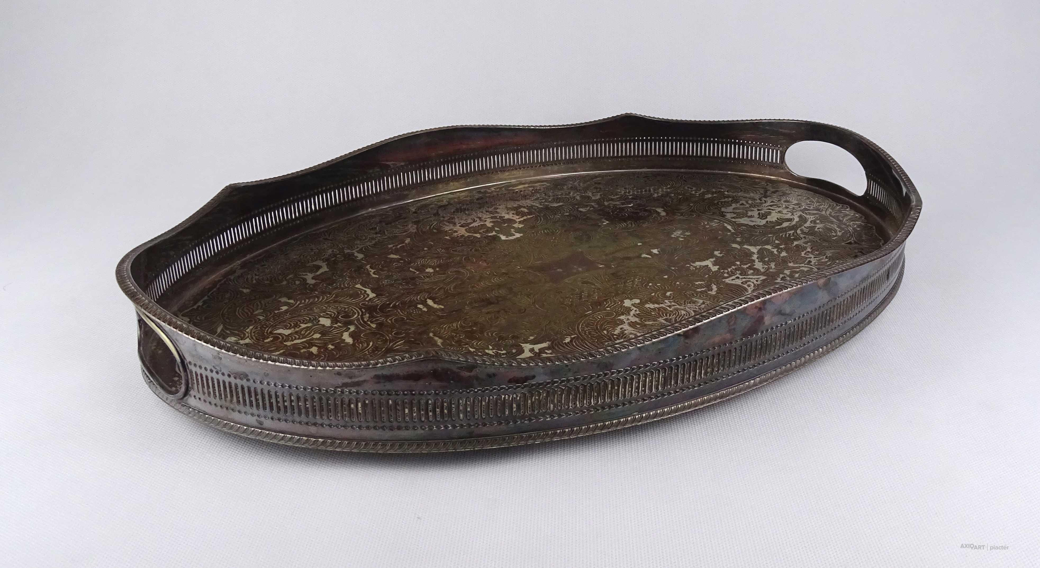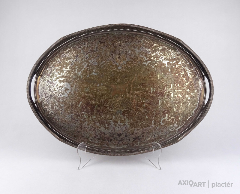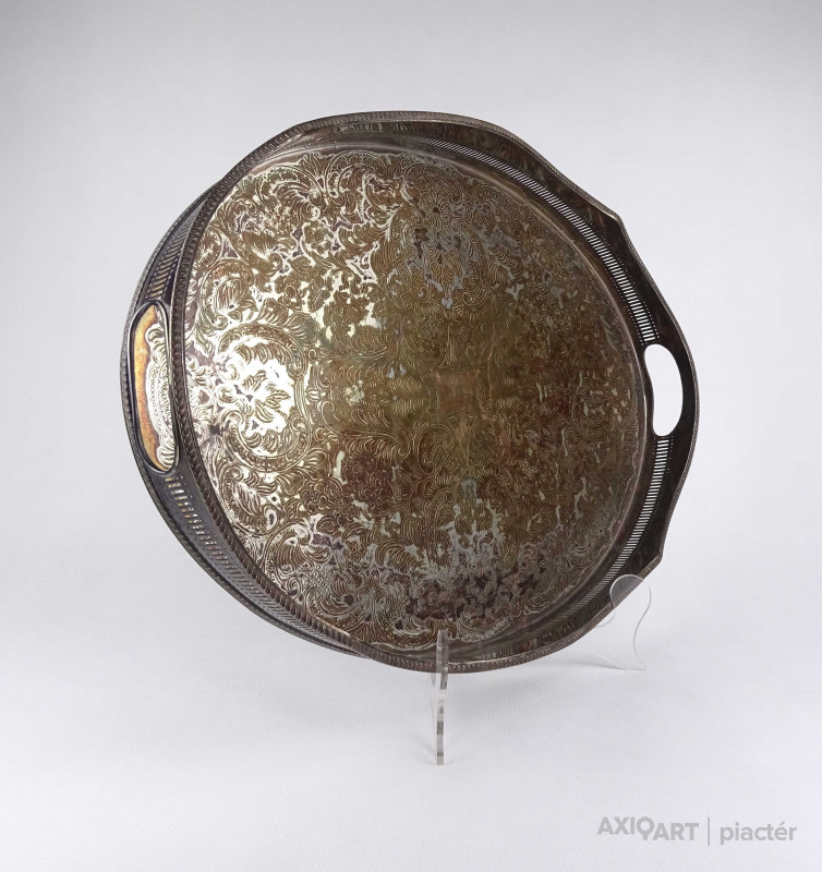 Antik, szép állapotú, nagy méretű, vésett mintákkal díszített, két füllel rendelkező, magas áttört peremű, vastagon ezüstözött réz tálca.