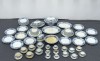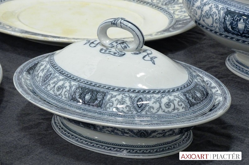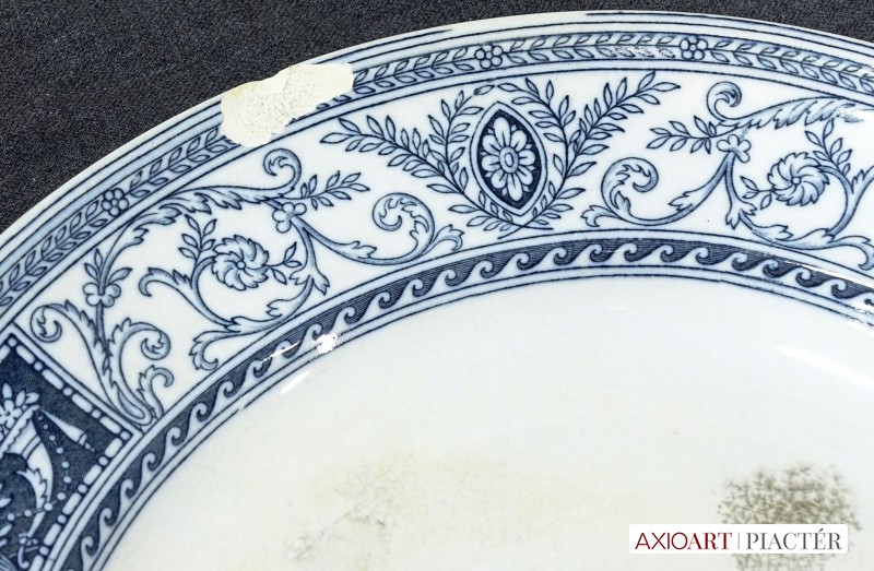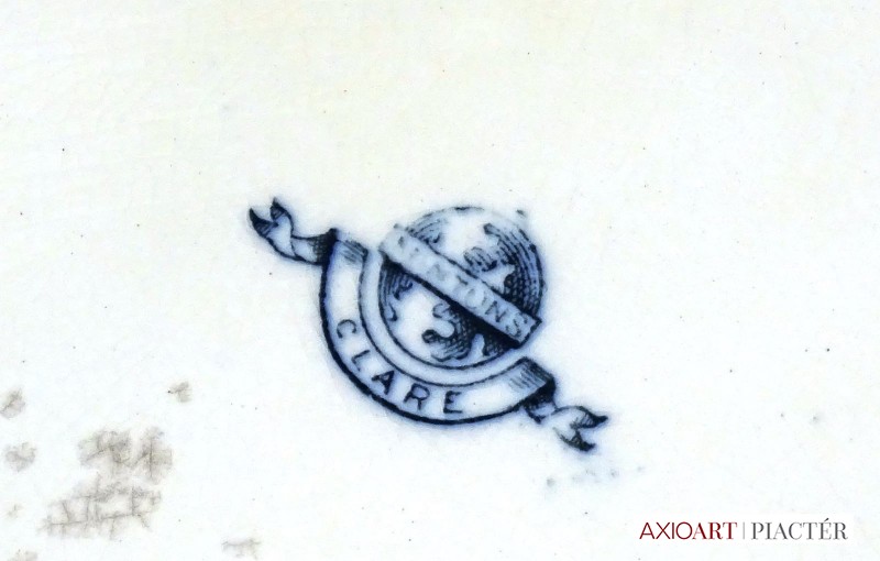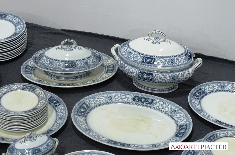 [0J905/UZ-K] Antik kék-fehér mintás jelzett fajansz étkészlet. Összesen 105 darabból álló 95%-ban hibátlan angol készlet, az 1800-as évek végéről. Alján kék jelzés: MINTON'S CLARE (Ezt a jelzést a gyár 1863 és 1872 között használta) Mélynyomással: MINTONS A készlet darabjai: - 1 darab nagyméretű leveses tál (24 x 22 x 36 cm) Füle sérült. - 1 darab ovális leveses tál alátét tál (29 x 38 cm) - 1 darab ovális pecsenyés tál (30 x 38 cm) - 1 darab ovális nagyméretű pecsenyés tál (34.5 x 44 cm) Kisebb mázhibák. - 1 darab talpas ovális kínáló tál fedővel (15 x 21 x 28.5 cm) - 1 darab szószos, mártásos kínáló tál (15 x 16 x 20 cm) Fedele repedt. - 1 darab nagyméretű, magasfalú kínáló tál (7.5 x 30 cm) Hajszálrepedt. - 24 darab lapostányér (26 cm) Egy darabon lepattanás található. - 12 darab mélytányér (26 cm) Tortás készlet: - 1 darab nagyméretű tortatál (35 cm) - 12 darab tortás tányér (20 cm) Süteményes készlet: - 1 darab nagyméretű süteményes kínáló tál (30 cm) - 12 darab süteményes tányér (20 cm) Kisméretű kávés, mokkás készlet: - 6 darab csésze (5.5 x 6 cm) - 6 darab alátét tányér (11 cm) Kávés készlet: - 6 darab csésze (5.7 x 8.5 cm) - 6 darab alátét tányér (13 cm) Teás készlet: - 6 darab teás csésze (6.8 x 10 cm) - 6 darab alátét tányér (15 cm) 2011-es londoni aukción elkelt készlet $5000 áron: http://www.christies.com/lotfinder/lot/a-minton-earthenware-tudor-pattern-part-dinner-service-5463303-details.aspx Súly: 46.25 kg Forrás: www.pinterest.com