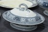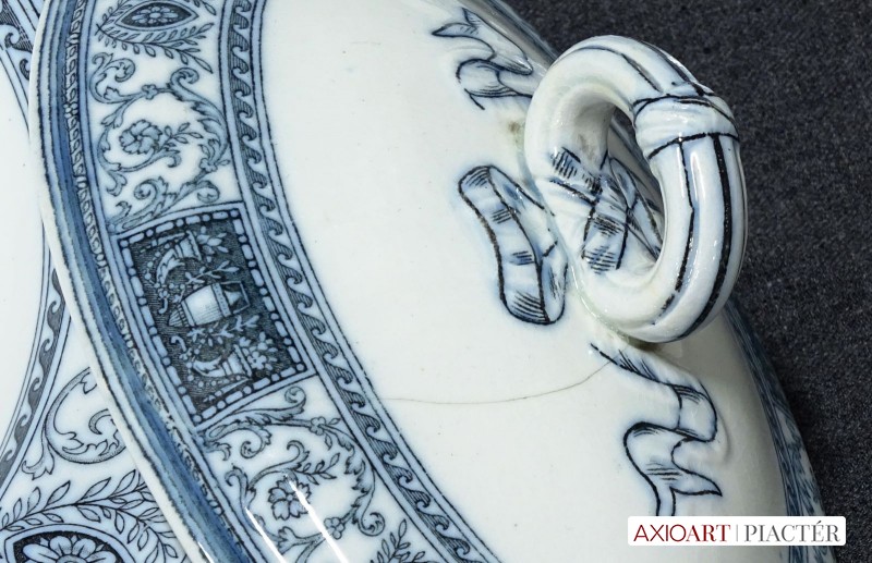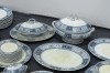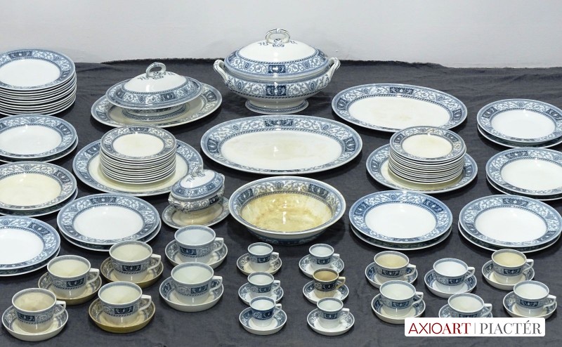 Antik kék-fehér mintás jelzett fajansz étkészlet. Összesen 105 darabból álló 95%-ban hibátlan angol készlet, az 1800-as évek végéről.