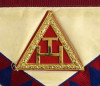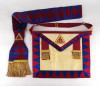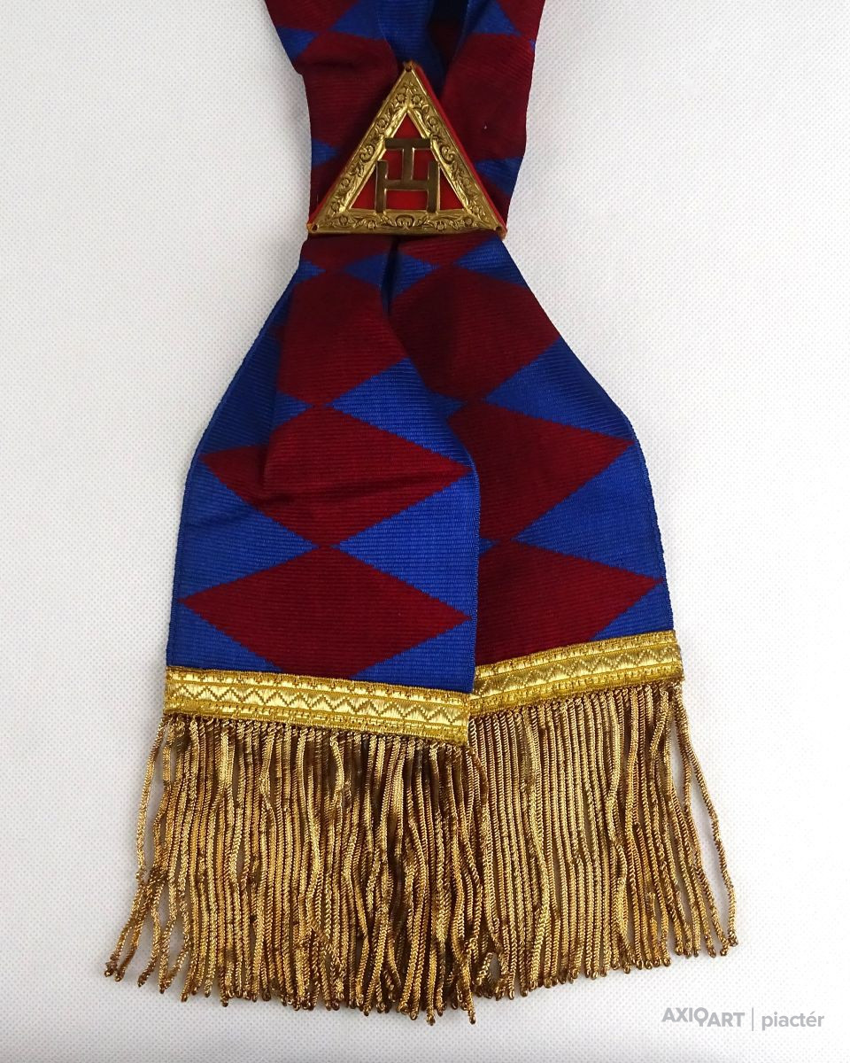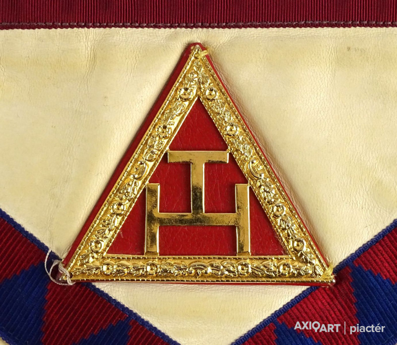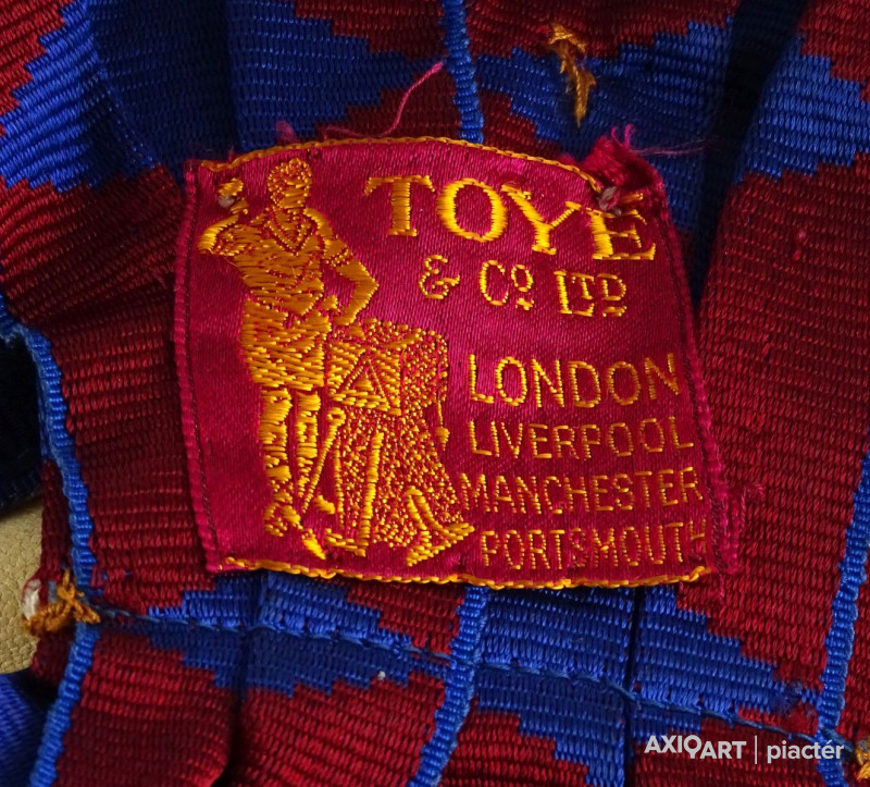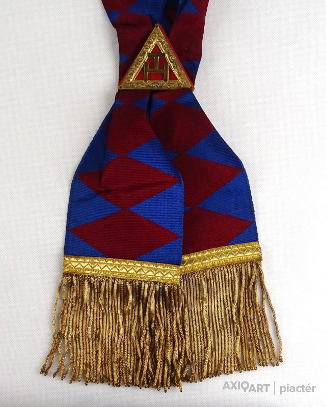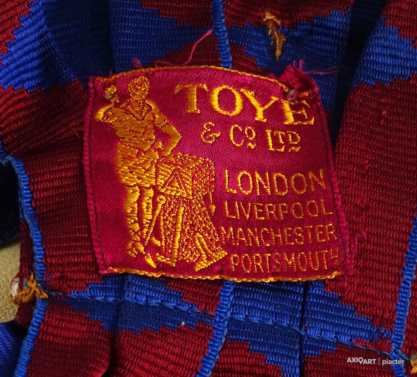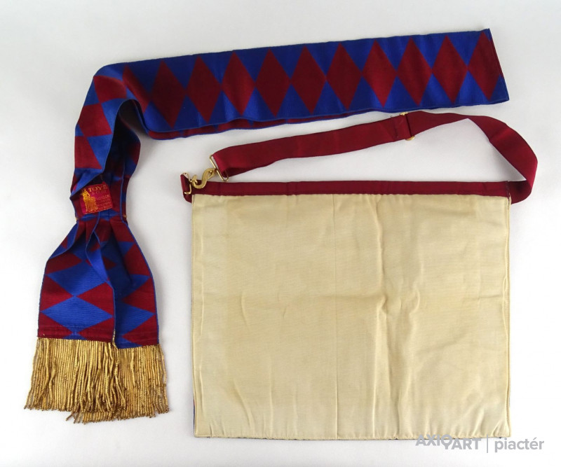 [1C841/X281/4] Gyönyörű állapotban megmaradt szabadkőműves díszruha. Gyönyörű réz díszekkel és finom bőr betétes díszítésekkel kék-vörös színben. Wales (?). A kötényen gyártói címke, rajta felirat: BY APPOINTMENT TO H.M. QUEEN ELIZABETH II. GOLD E. SILVER LACEMEN TOYE KENNING SPENCER LTD. LONDON - MANCHESTER - BIRMINGHAM - GLASGOW - LIVERPOOL & BEDWORTH ESTABLISHED 1801 Becsételt jelzés: .... MANUFACTURE Súly: 0.455 kg