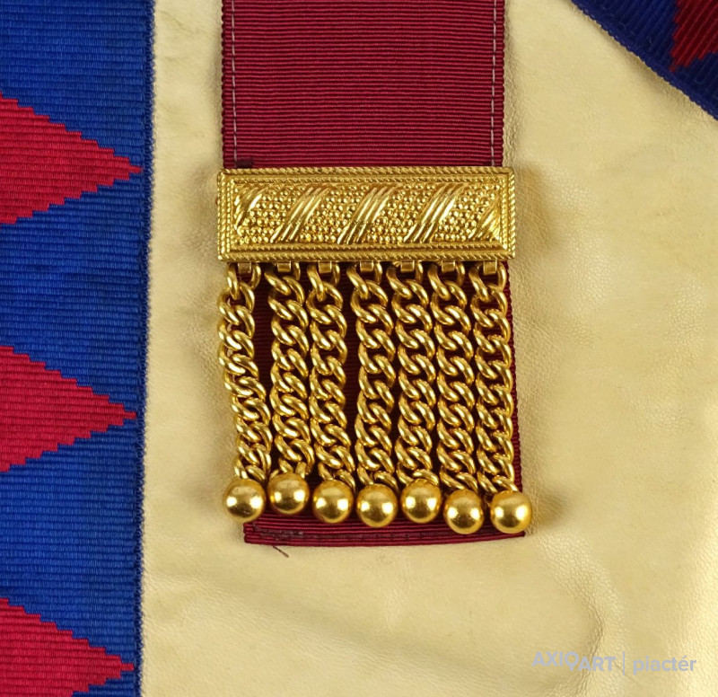 Gyönyörű állapotban megmaradt szabadkőműves díszruha. Gyönyörű réz díszekkel és finom bőr betétes díszítésekkel kék-vörös színben. Wales (?).