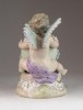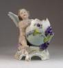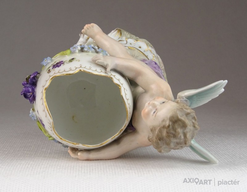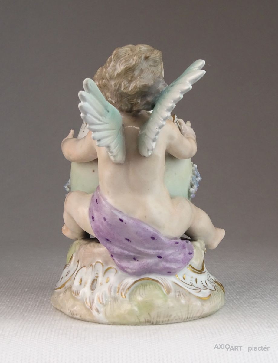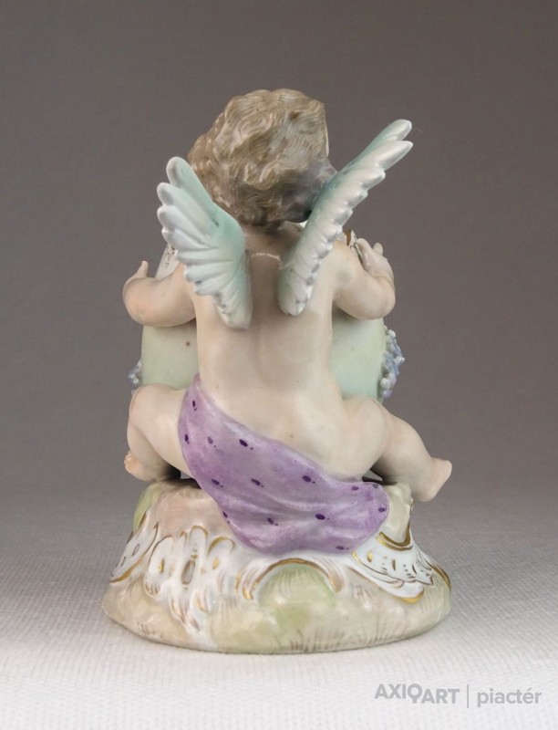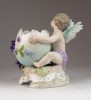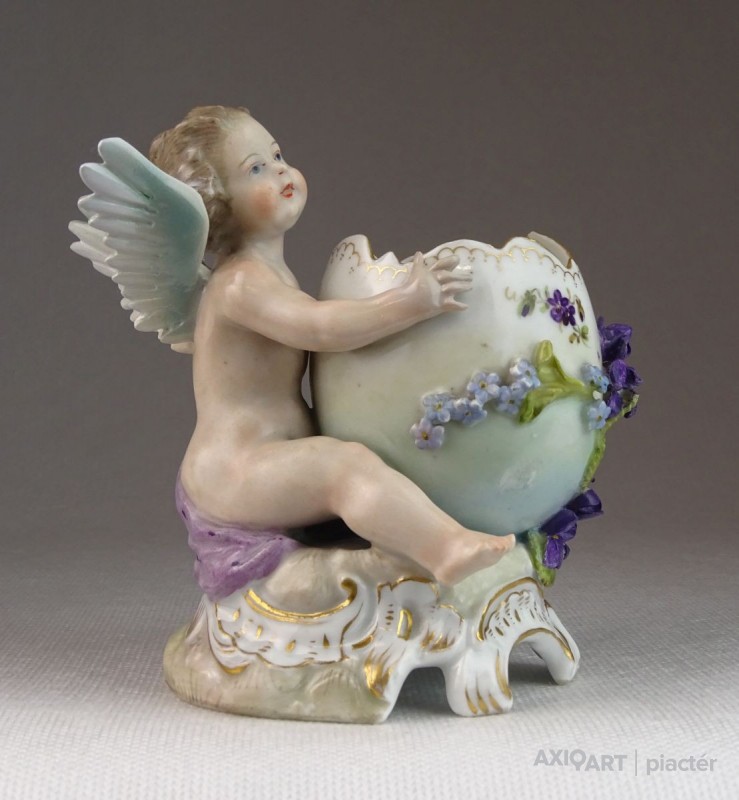 Antik, hibátlan állapotú, kezében tojást tartó porcelán angyal barokkos talapzaton.