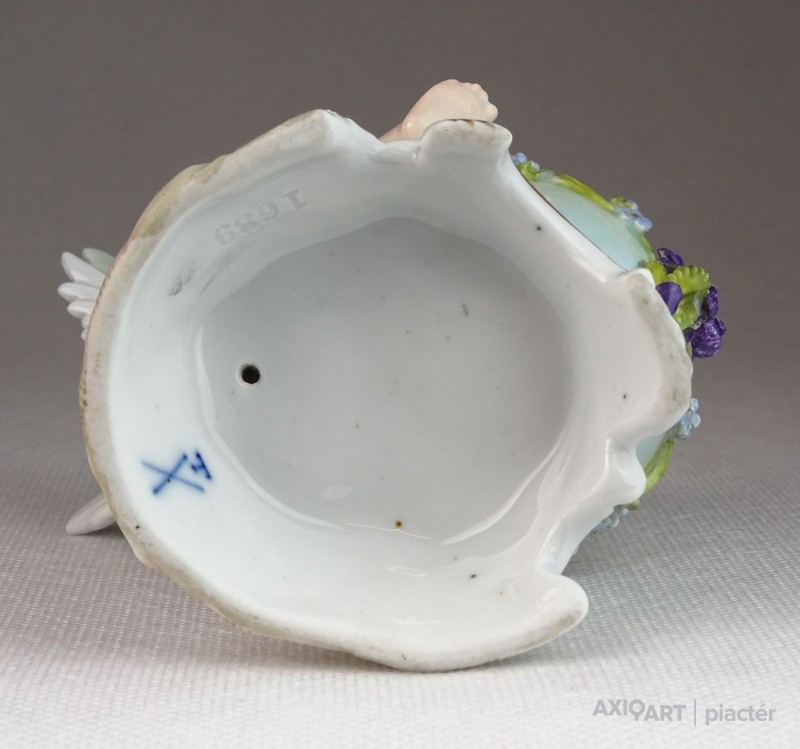 [0K218/Z267] Antik, hibátlan állapotú, kezében tojást tartó porcelán angyal barokkos talapzaton. Alján kék jelzés, (Carl Thieme at Potschappel) lásd fotó. Profi restaurátor által javított. Magasság: 11.3 cm Súly: 0.245 kg