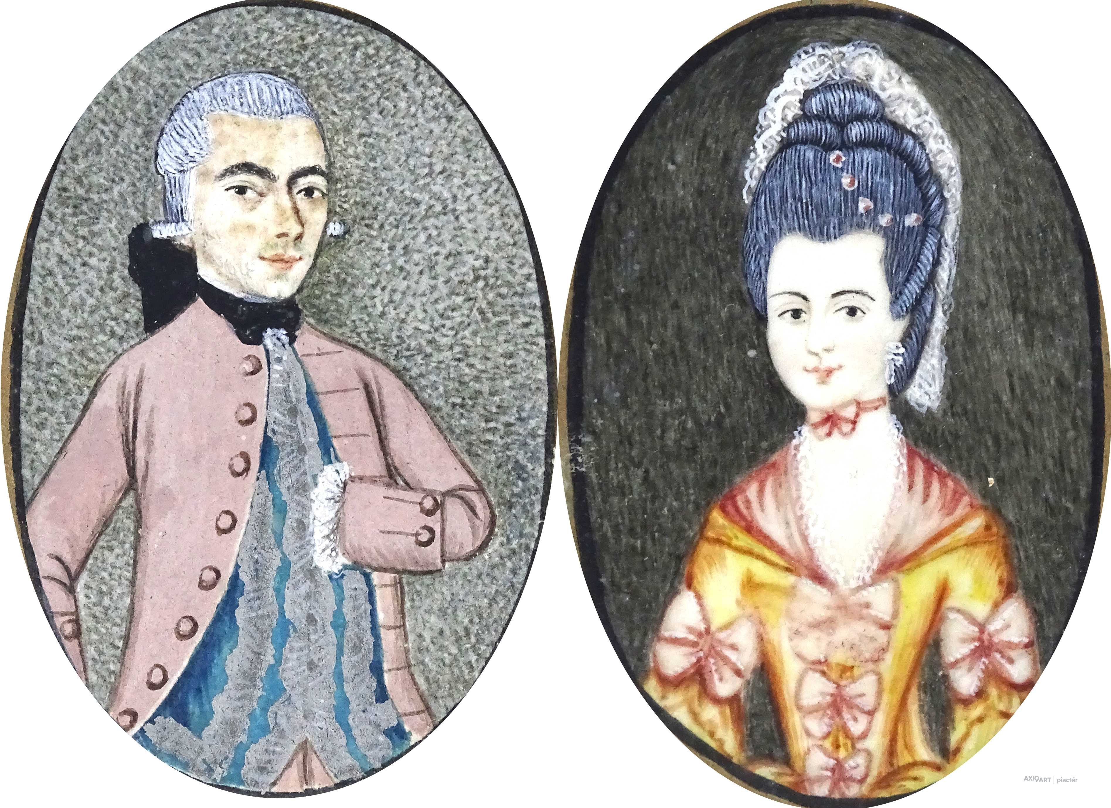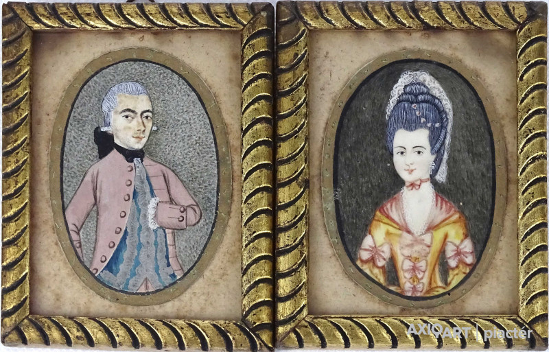 Antik, miniatűr barokk, főúri porté festmény pár, képpár, üveglap mögött aranyozott keretben.