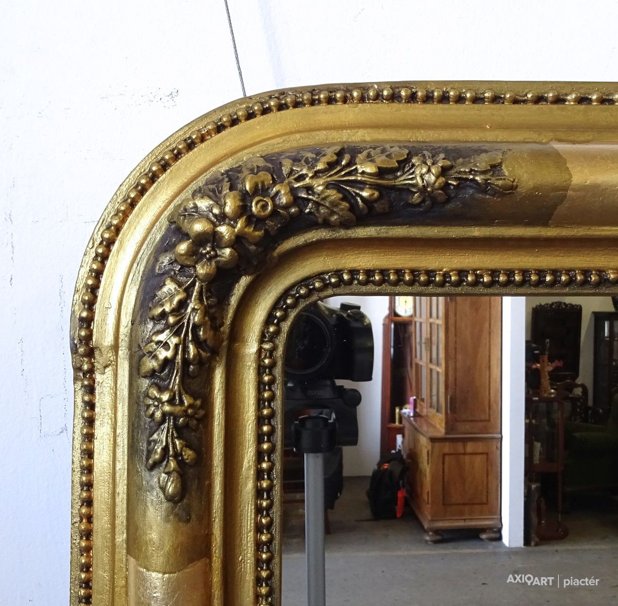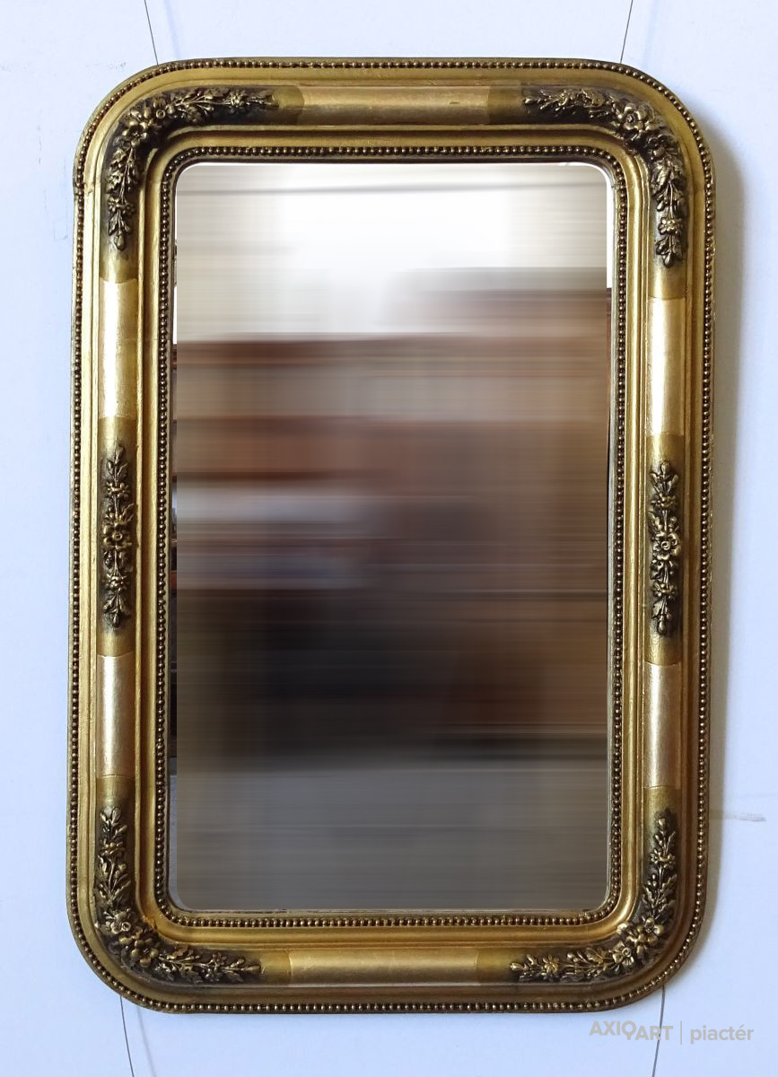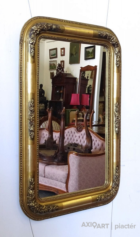 Antik biedermeier, aranyozott tükör falra akasztási lehetőséggel. Benne cserélt hibátlan, vakfolt mentes tükör található. Azonnal enteriőrbe helyezhető állapotban van.