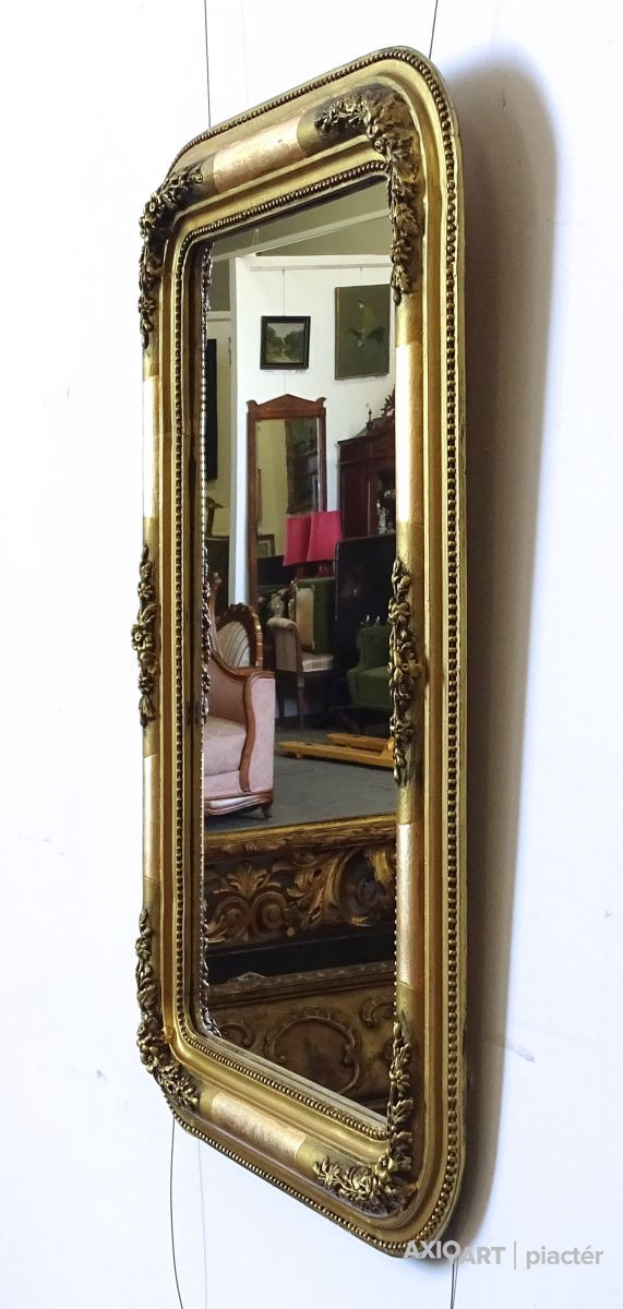 [1N313/UZ-K] Antik biedermeier, aranyozott tükör falra akasztási lehetőséggel. Benne cserélt hibátlan, vakfolt mentes tükör található. Azonnal enteriőrbe helyezhető állapotban van. Magasság: 97 cm Szélesség: 65 cm