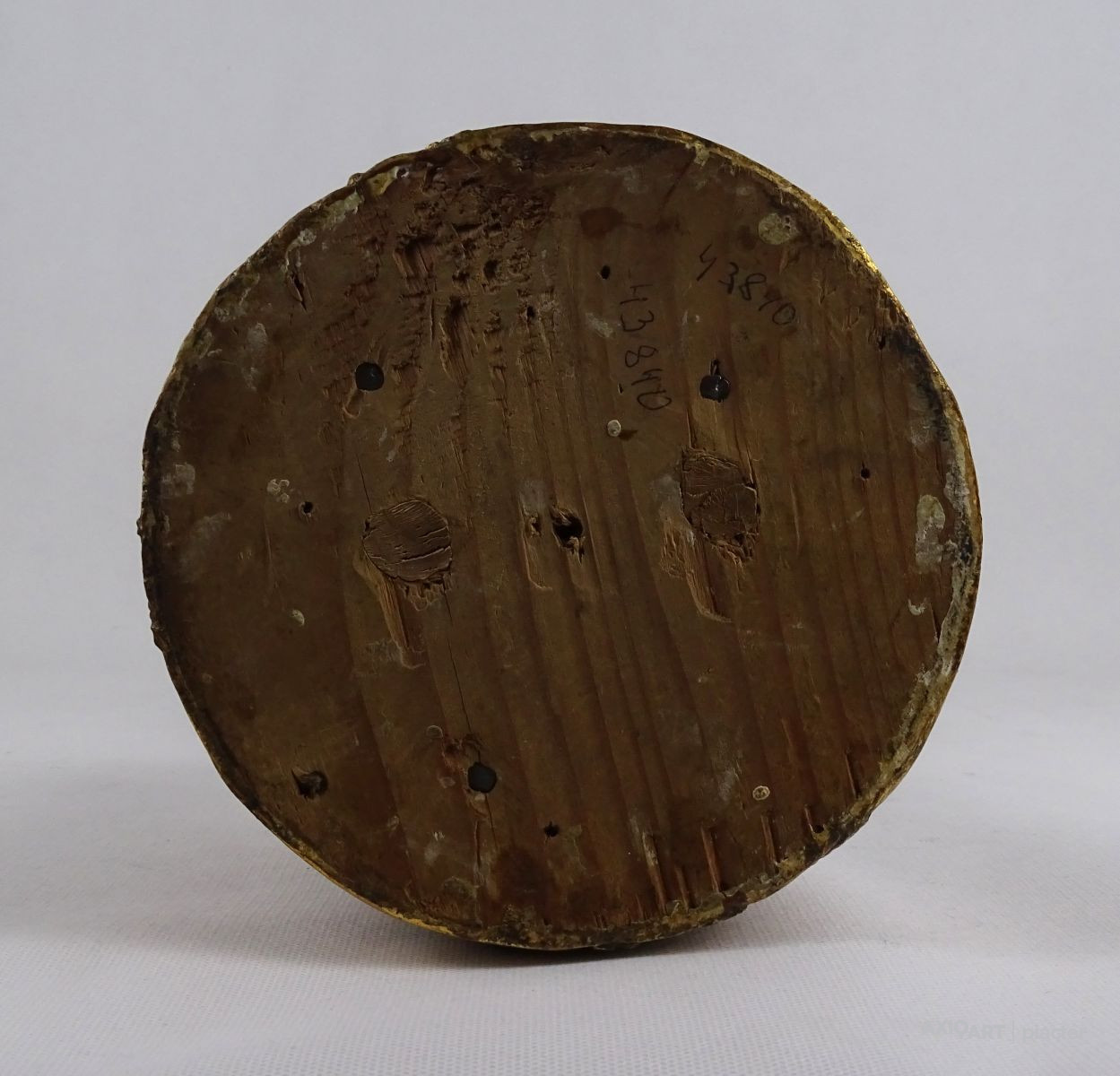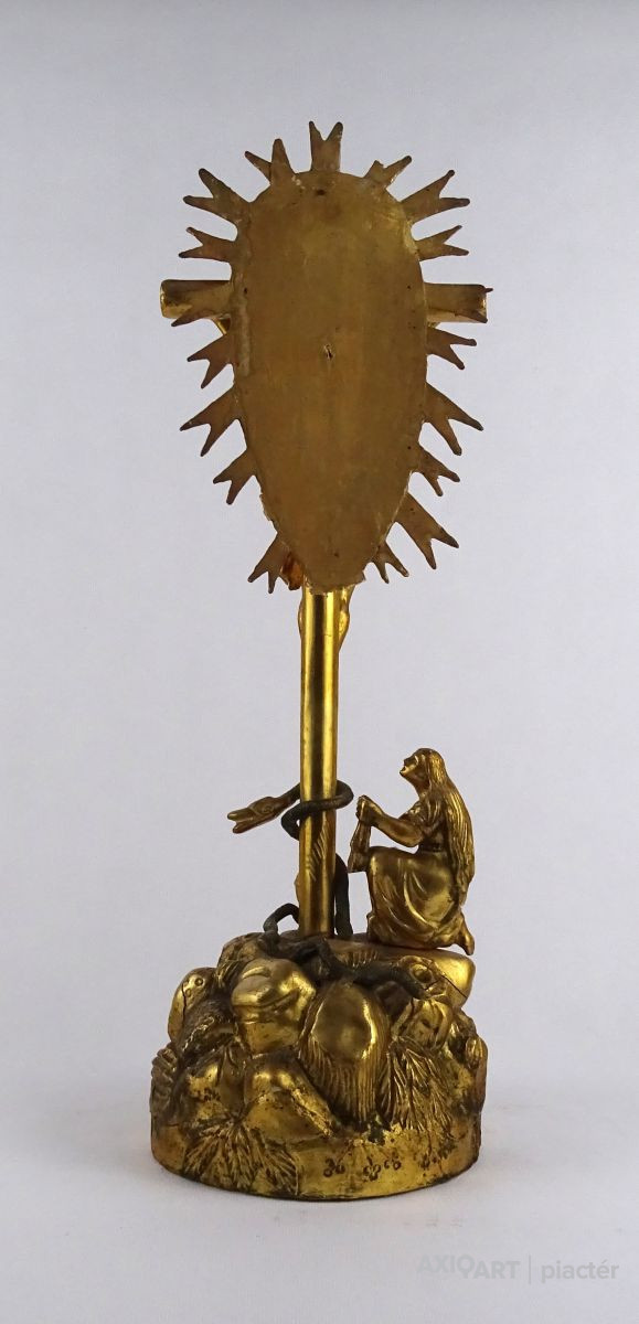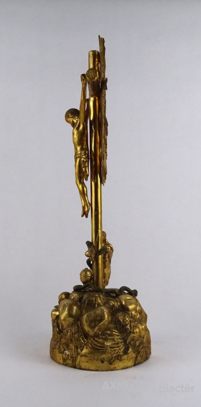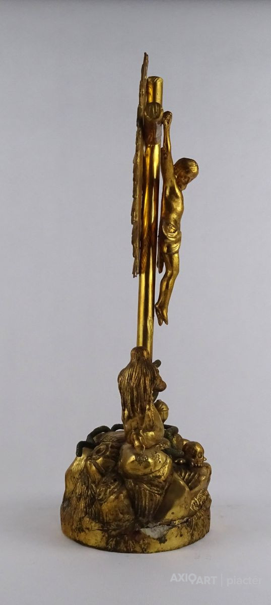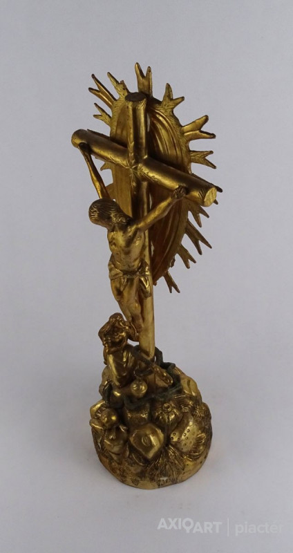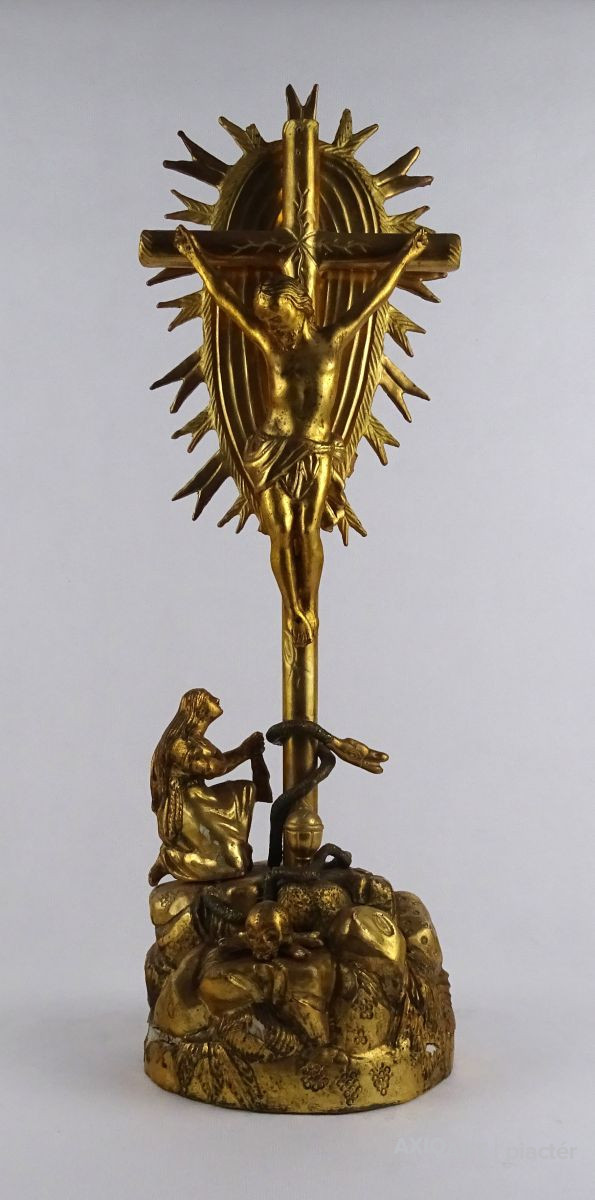 Gyönyörű aranyozott antik egyházi, vallási kellék. Talapzaton álló feszület, rajta a keresztre feszített Jézus. Lábánál anyja, Mária, egy serleg, koponya és kígyó látható.