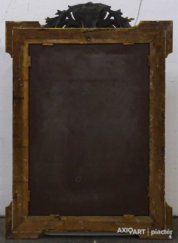 Antik, aranyozott, faragott, fakeretes, díszkoronás barokk tükör falra akasztási lehetőséggel.