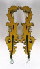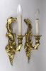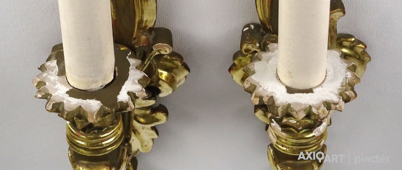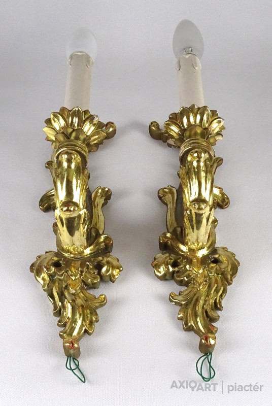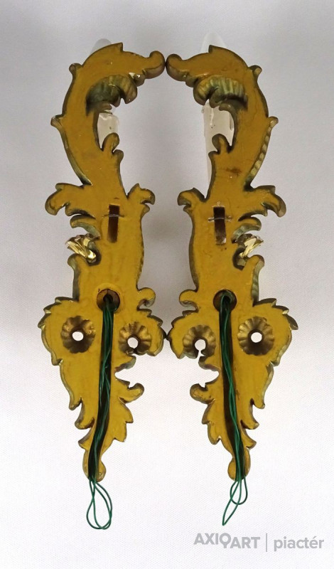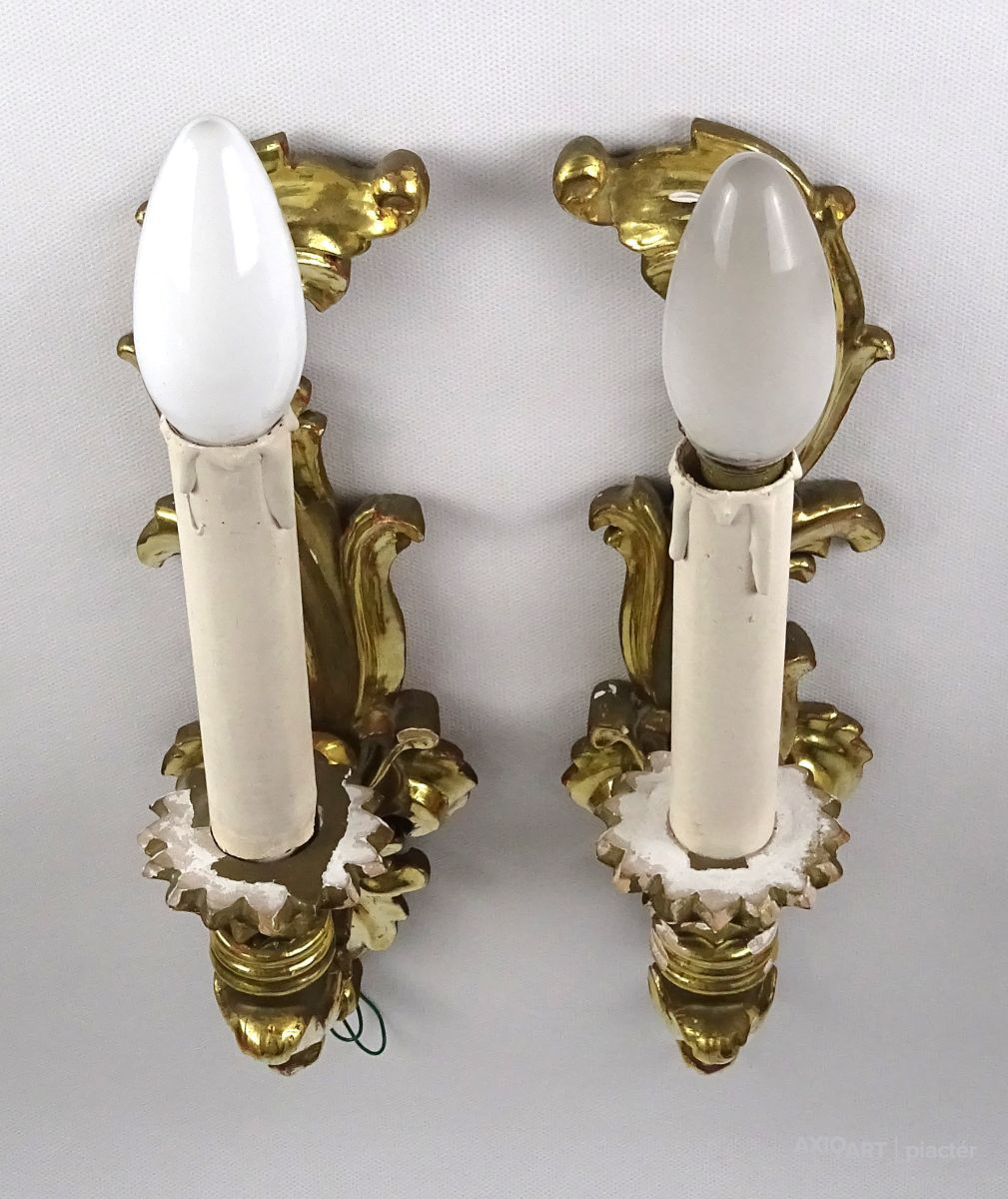 Szép állapotú, falra akasztható, aranyozott florentin falikar párban. A karok papírmasé gyertyákban végződnek, kis méretű E14-es izzó való Rendkívül díszes, faragott hársfa florentin fali világítás.
