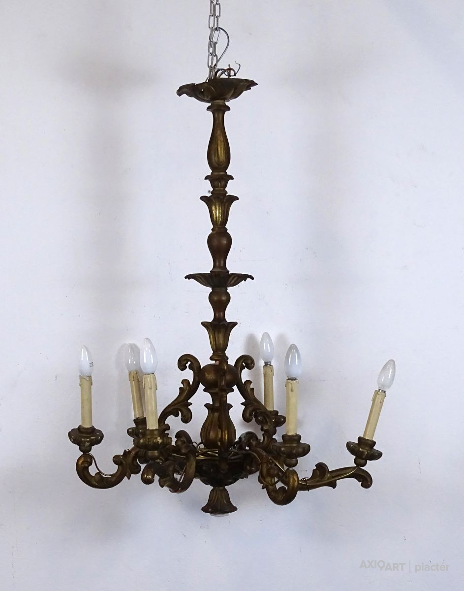 Antik, szépen faragott, aranyozott, hatkarú mennyezeti lámpa, csillár. A karok gyertyacsonkokban végződnek, hat darab kisméretű (E14) és egy darab nagyméretű (E27) izzó való bele.