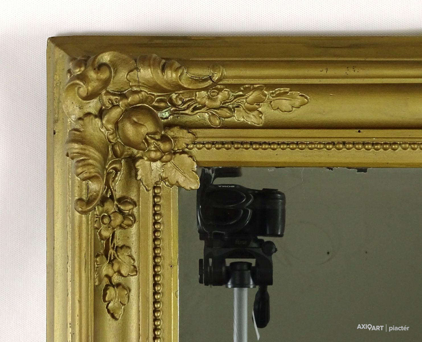 Antik, szép állapotú aranyozott keretes falitükör. A benne lévő eredeti antik tükör szinte teljesen vakfolt mentes. Széles, csiszolt több mint 3 cm-es fazettával rendelkezik. Hátlapja eredeti deszkázott felirat. Azonnal falra akasztható állapotban van.