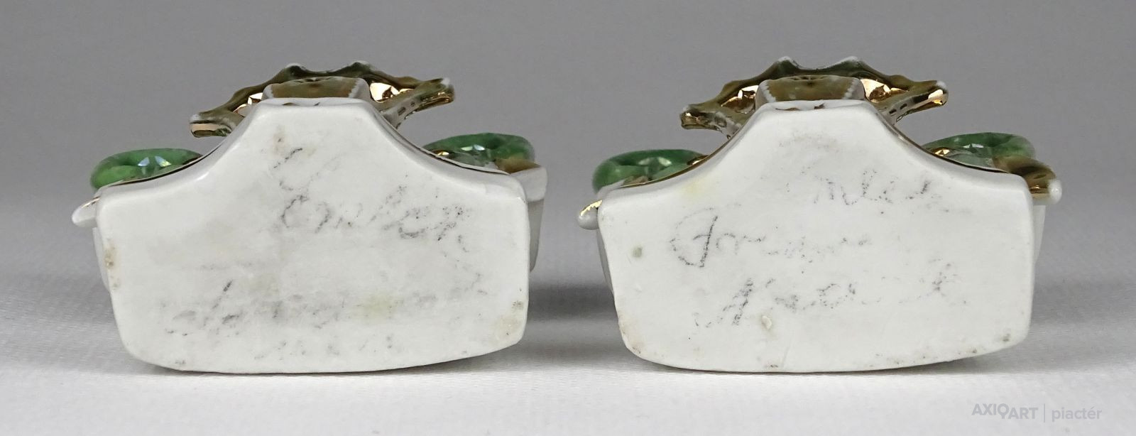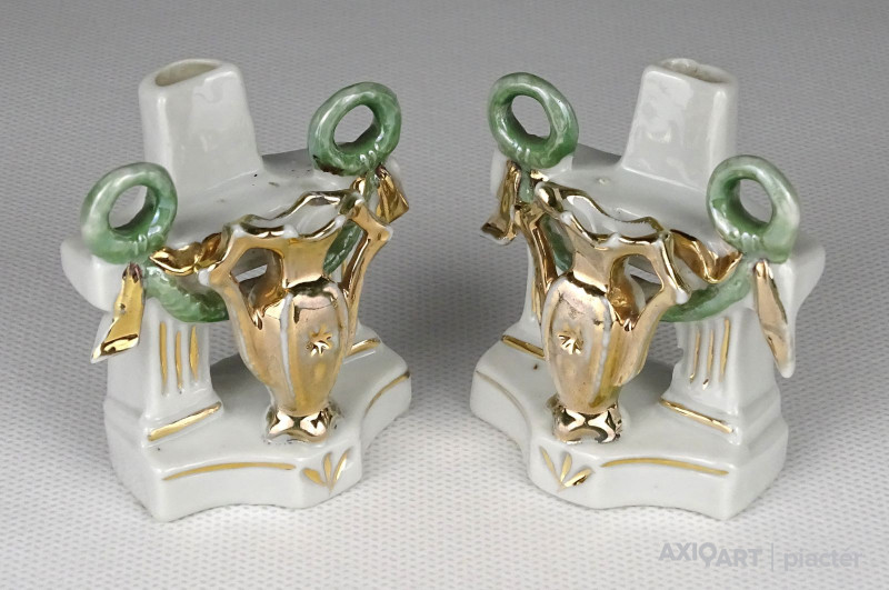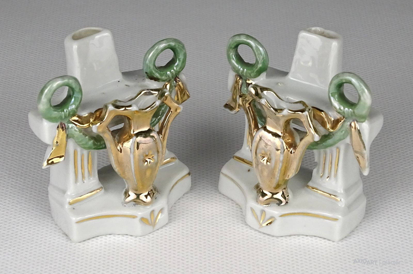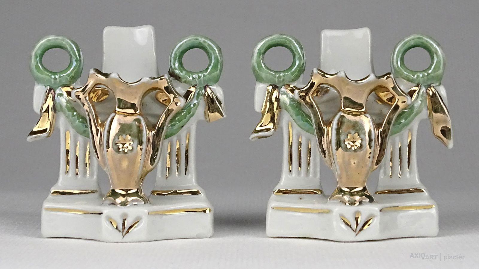 Antik, jelzett kis méretű, vastagon aranyozott porcelán dísztárgy pár. Kandalló alakú ibolyaváza.