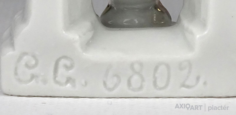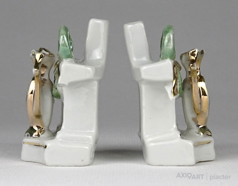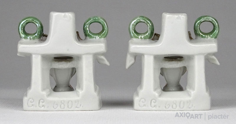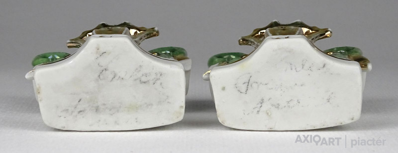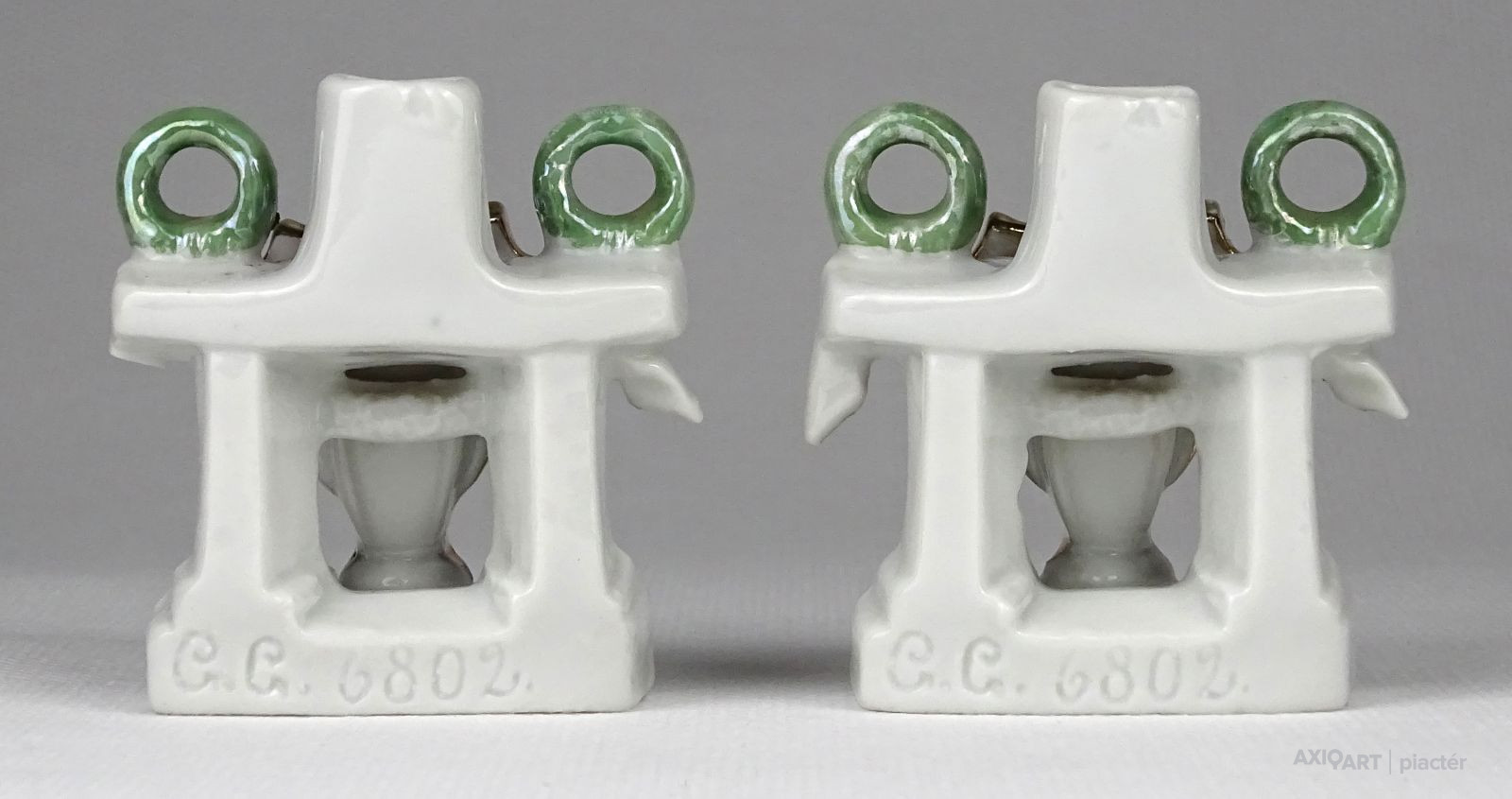 [1N518/X209] Antik, jelzett kis méretű, vastagon aranyozott porcelán dísztárgy pár. Kandalló alakú ibolyaváza. Hátoldalán mélynyomott jelzés: G.G. 6802 Magasság: 5.5 cm Szélesség: 5.5 cm Súly: 0.07 kg