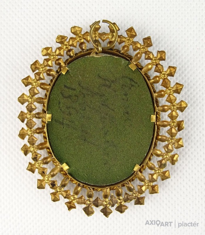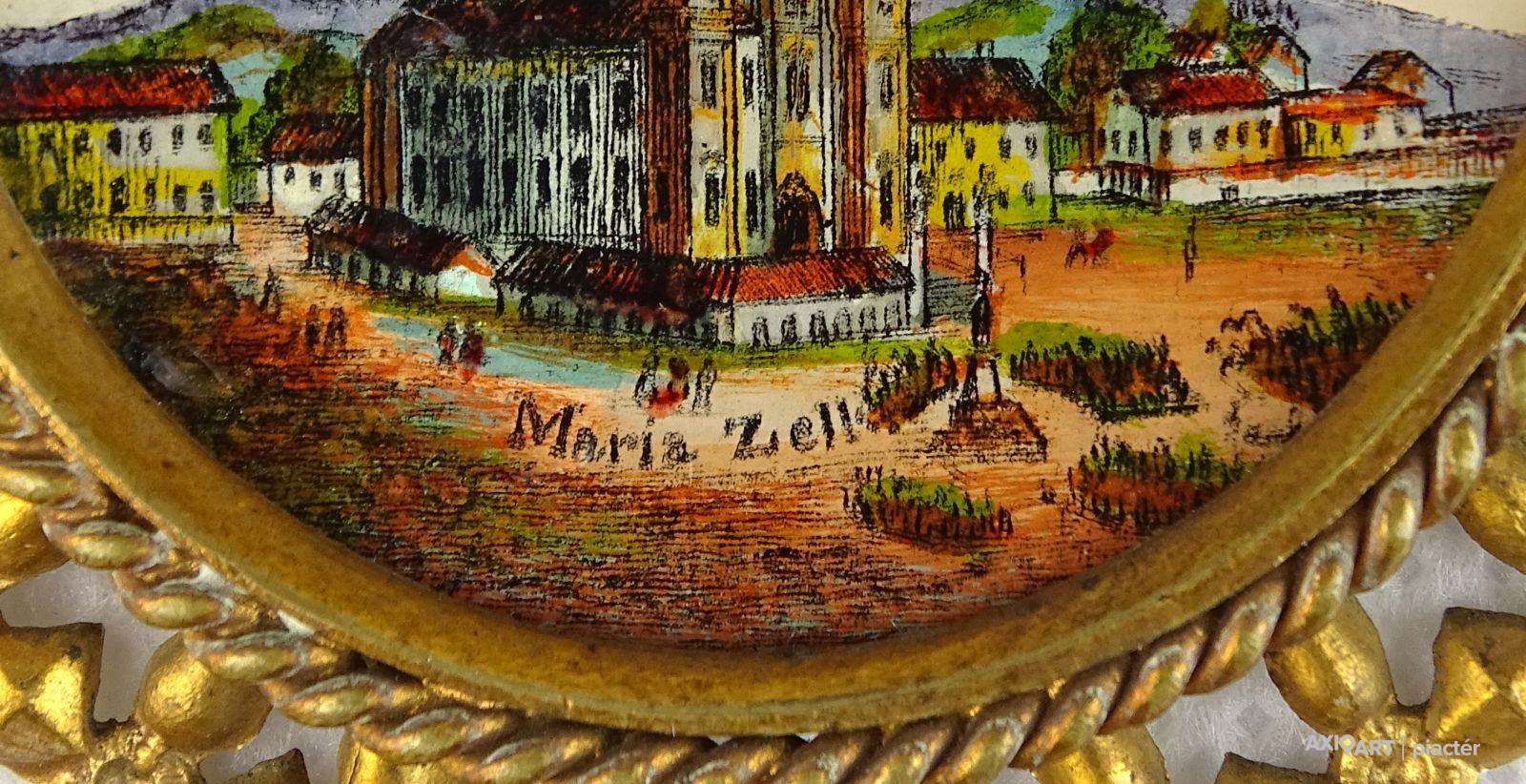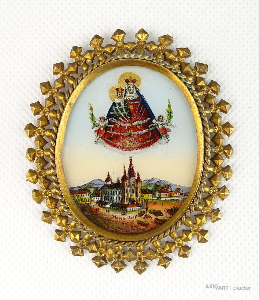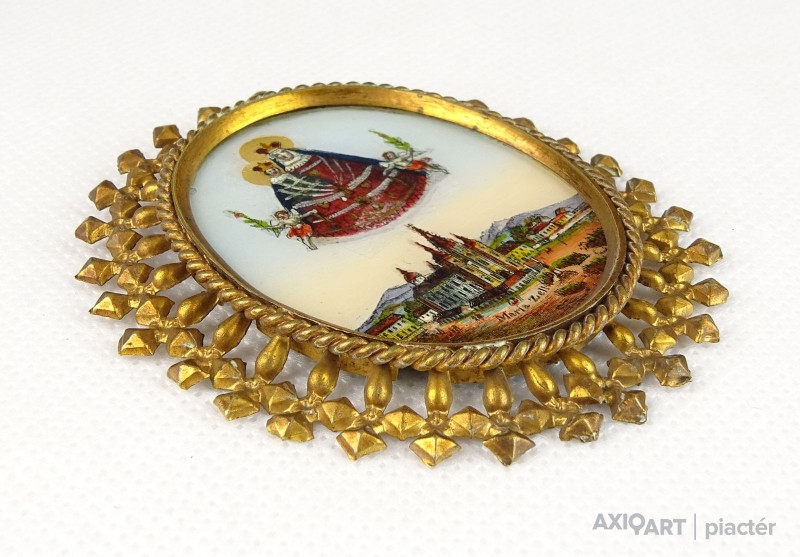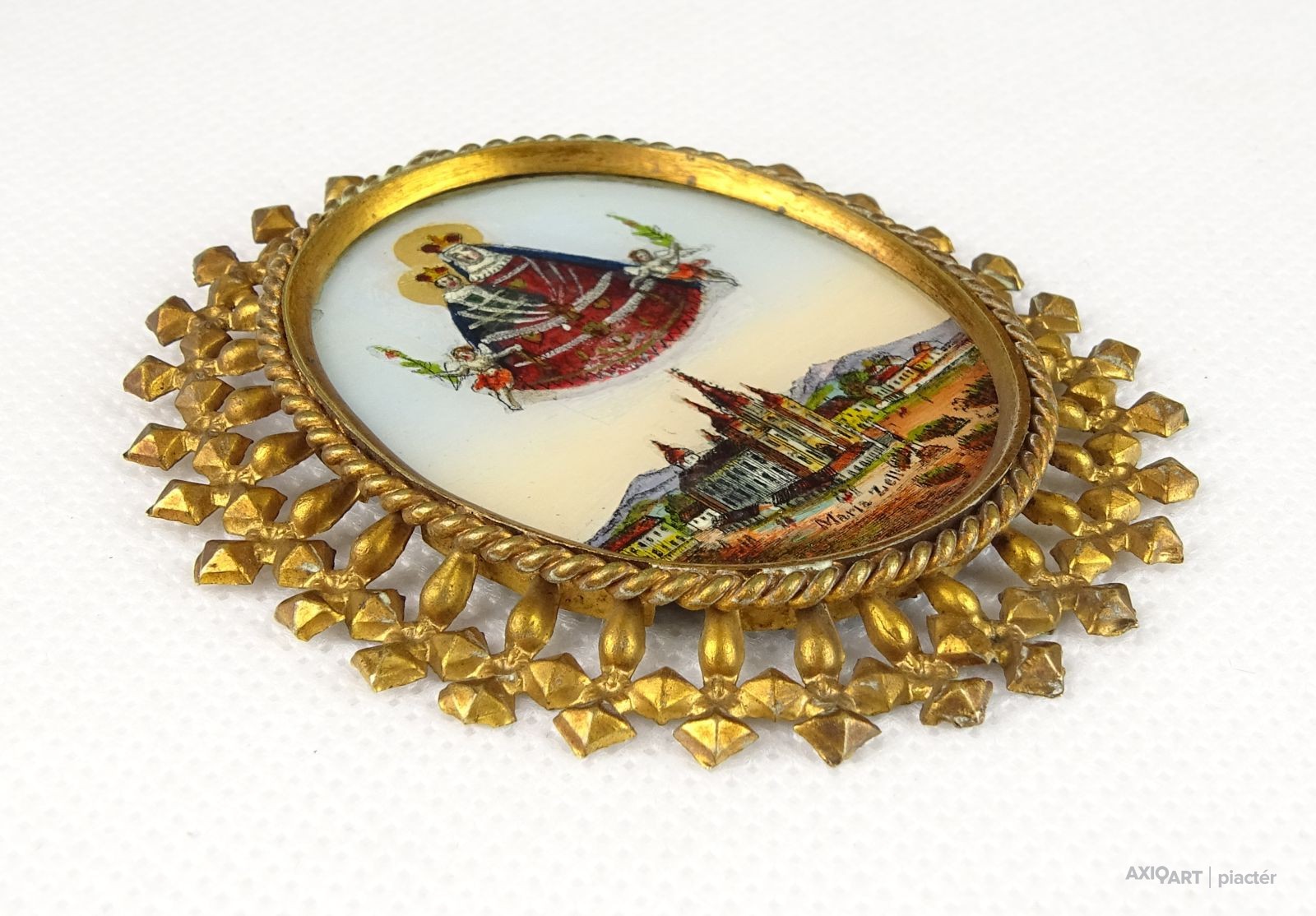 [0R290/X018] Antik, kisméretű, áttört aranyozott keretben lévő, ovális alakú, kézzel festett ikon. Rajta Mária gyermekével, laparany glóriával. Alatta a Bazilika épülete, korabeli városképpel. Felirat: MARIA ZELL Hátoldalán nehezen olvasható, kézzel írt datált felirat: 1894 Magasság: 7.7 cm Szélesség: 6.5 cm Súly: 0.012 kg