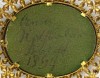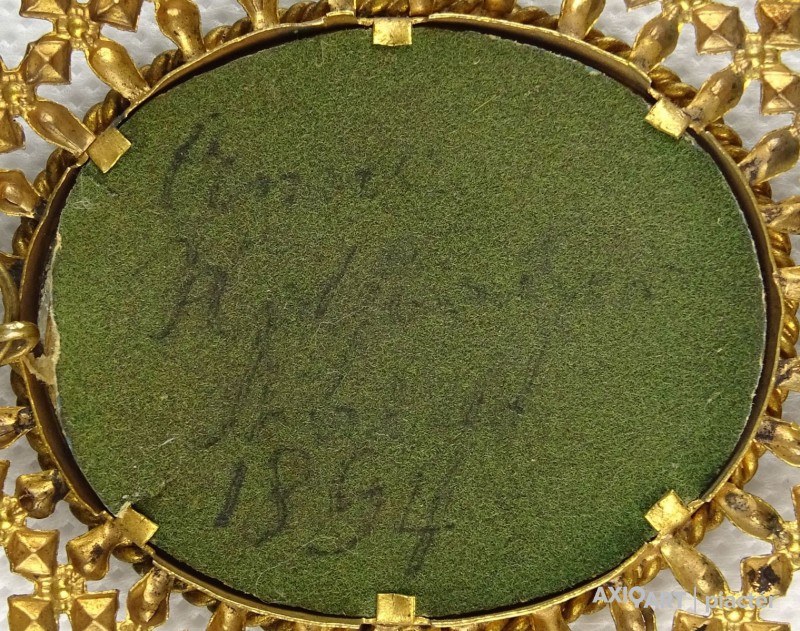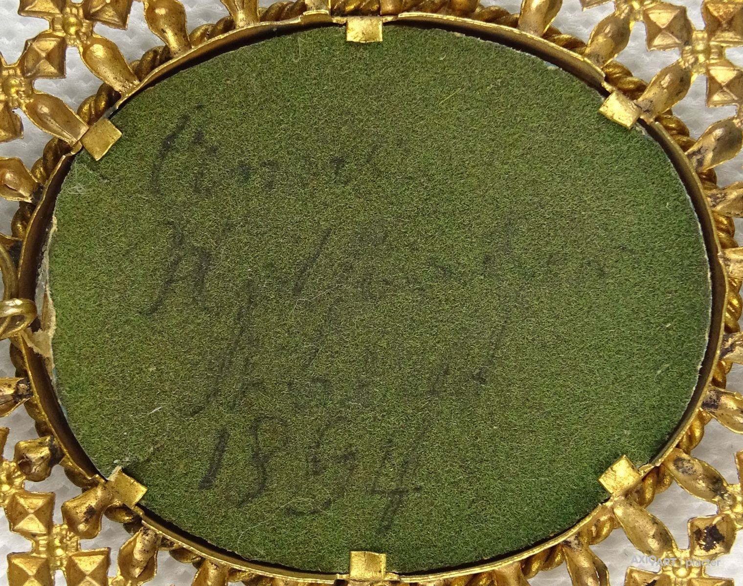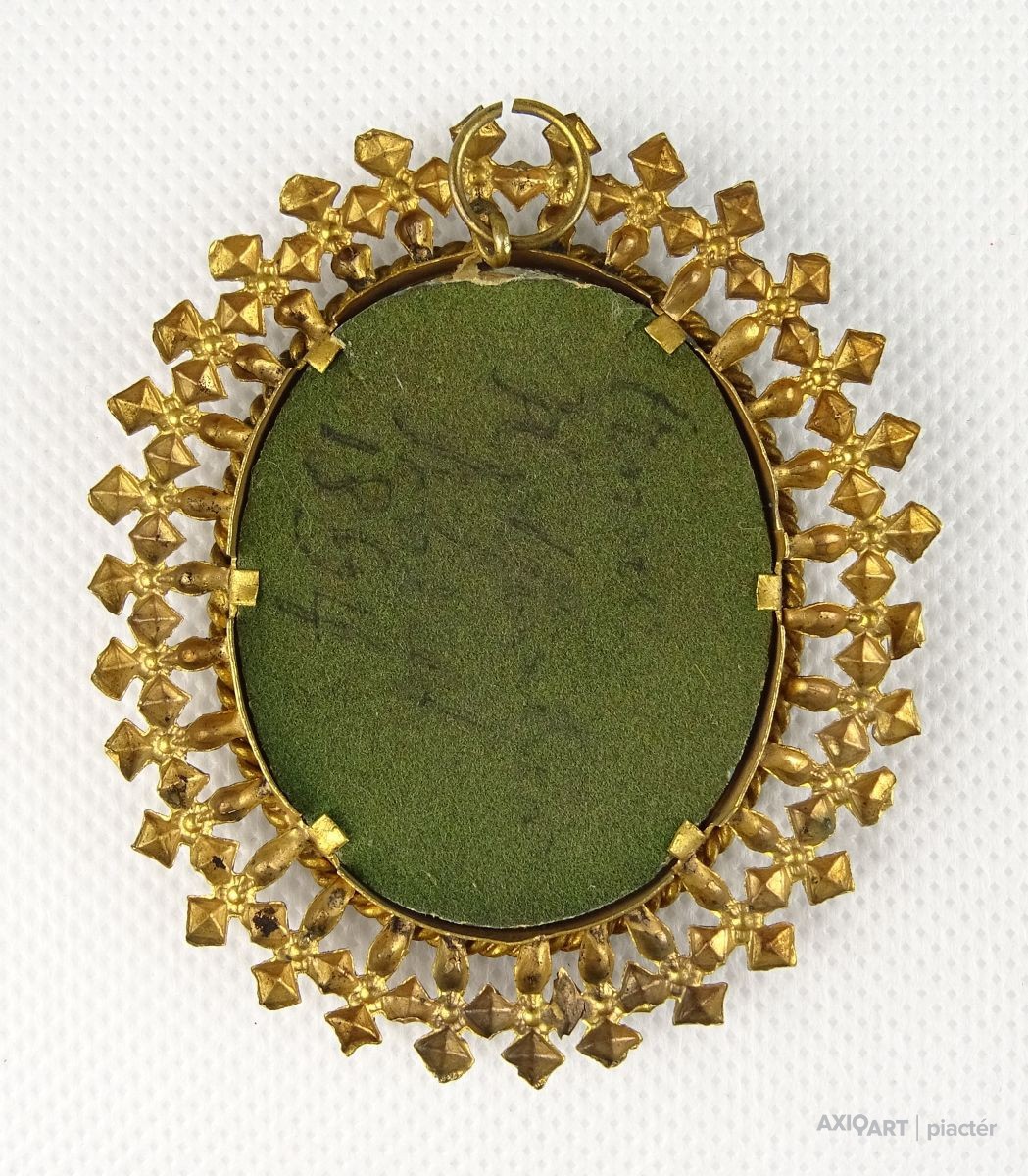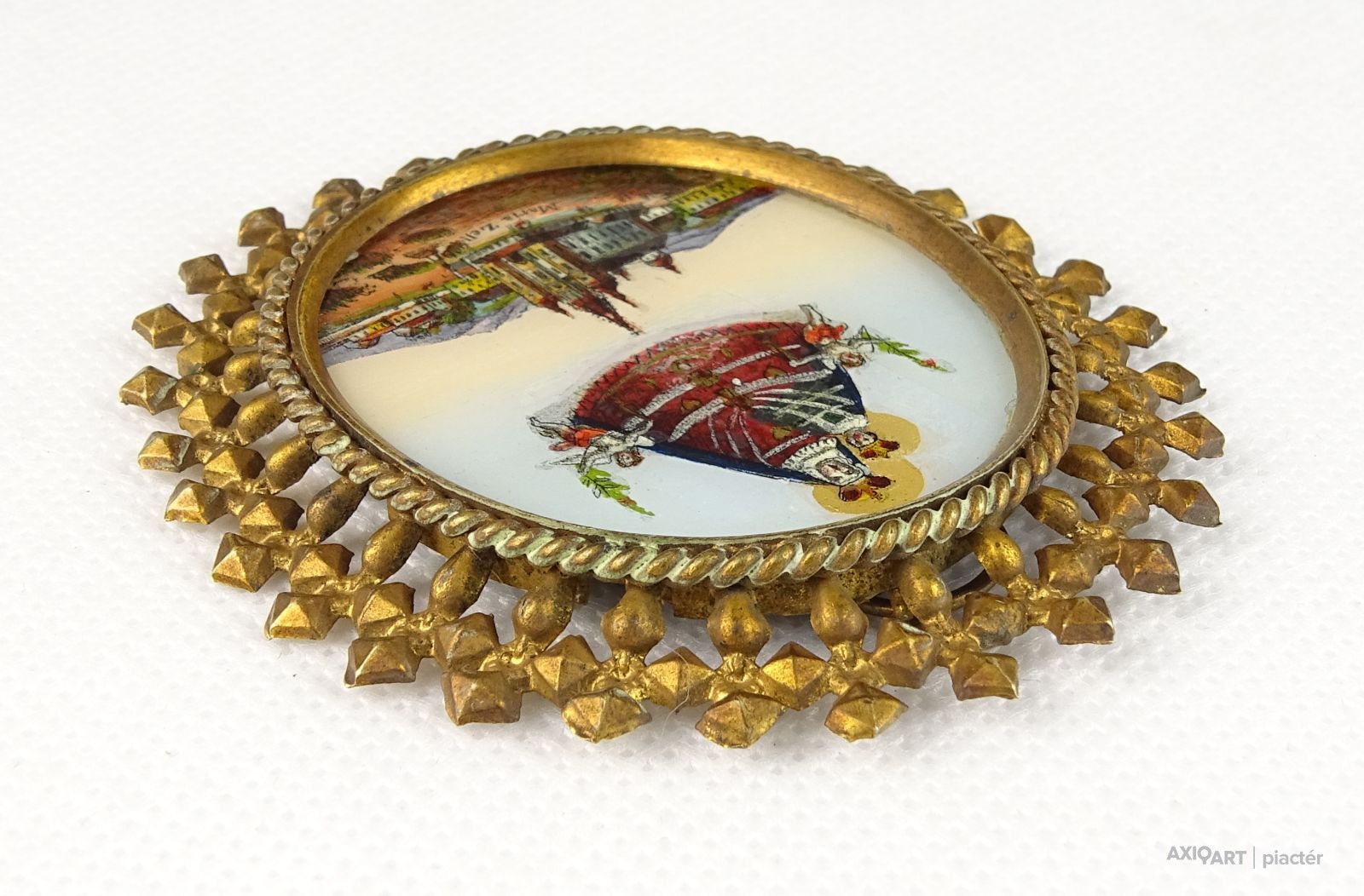 [0R290/X018] Antik, kisméretű, áttört aranyozott keretben lévő, ovális alakú, kézzel festett ikon. Rajta Mária gyermekével, laparany glóriával. Alatta a Bazilika épülete, korabeli városképpel. Felirat: MARIA ZELL Hátoldalán nehezen olvasható, kézzel írt datált felirat: 1894 Magasság: 7.7 cm Szélesség: 6.5 cm Súly: 0.012 kg