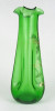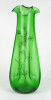 [1R730/Z065] Antik hibátlan állapotú, aranyozott tölgyfaág díszes zöld színű fújt üveg váza, virágváza, díszváza. Alján a fújás, szakítás kicsiszolt nyoma látható. Magasság: 26 cm Szélesség: 9 cm Súly: 0.465 kg