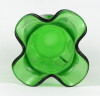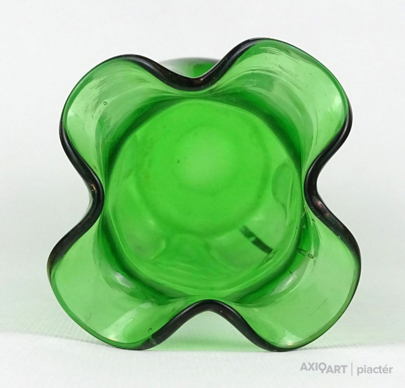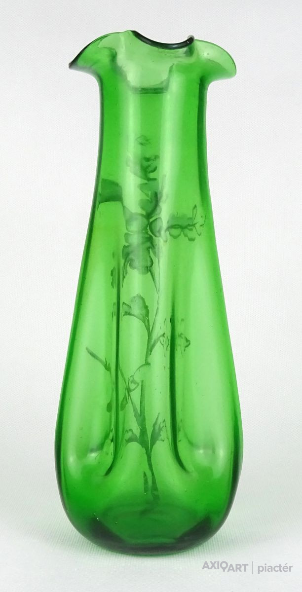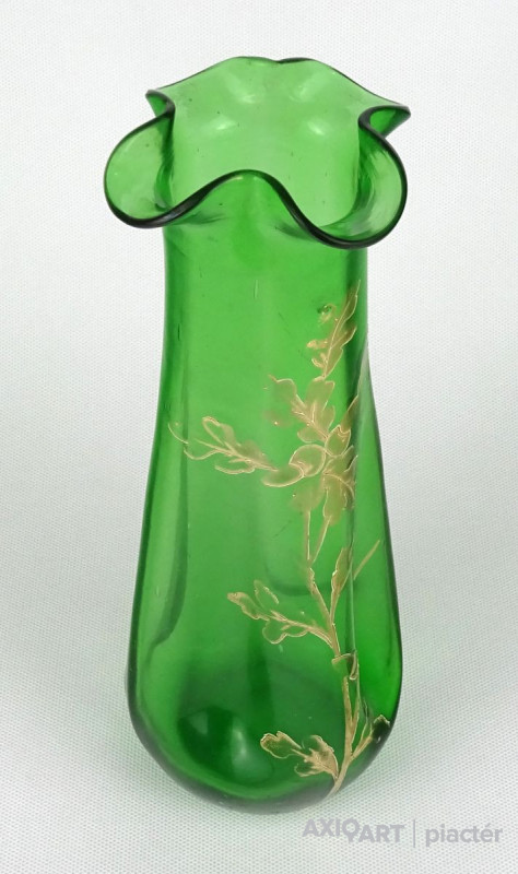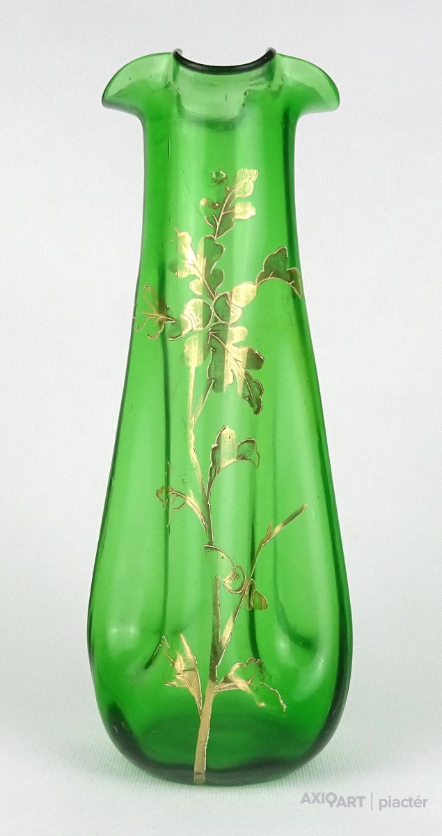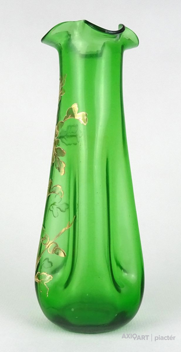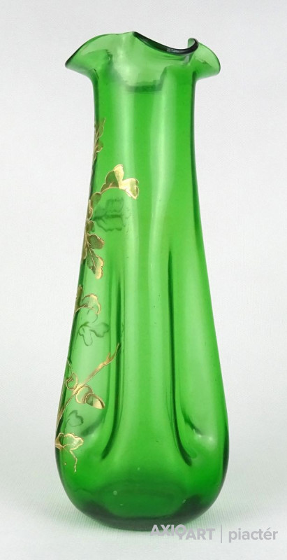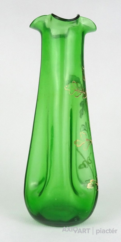 Antik hibátlan állapotú, aranyozott tölgyfaág díszes zöld színű fújt üveg váza, virágváza, díszváza. Alján a fújás, szakítás kicsiszolt nyoma látható.