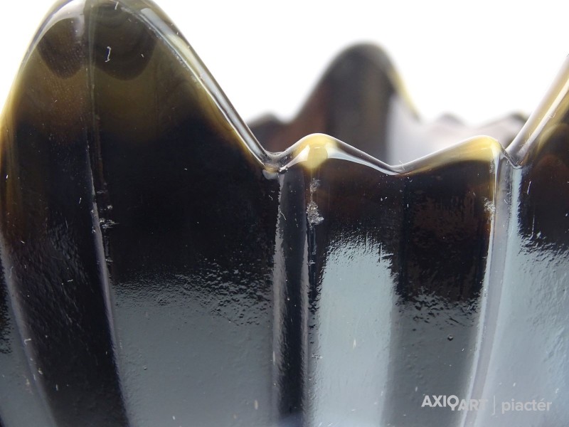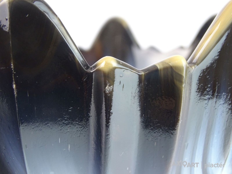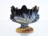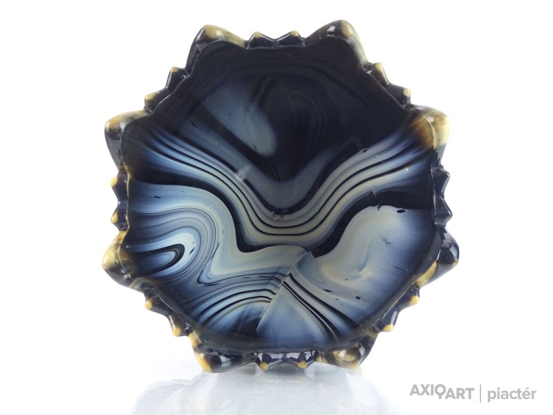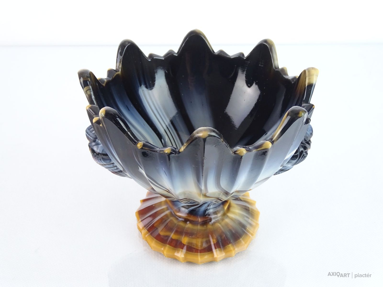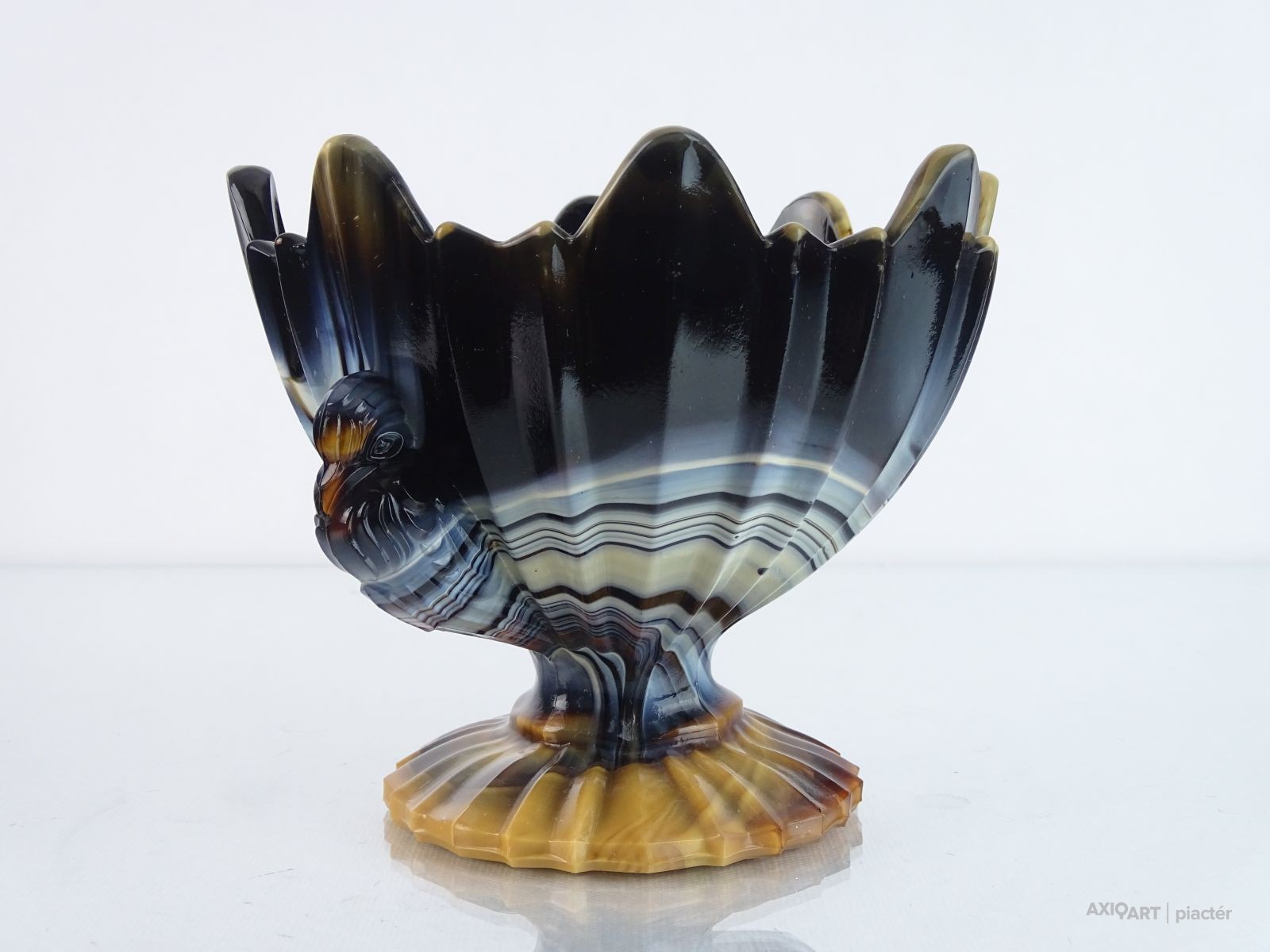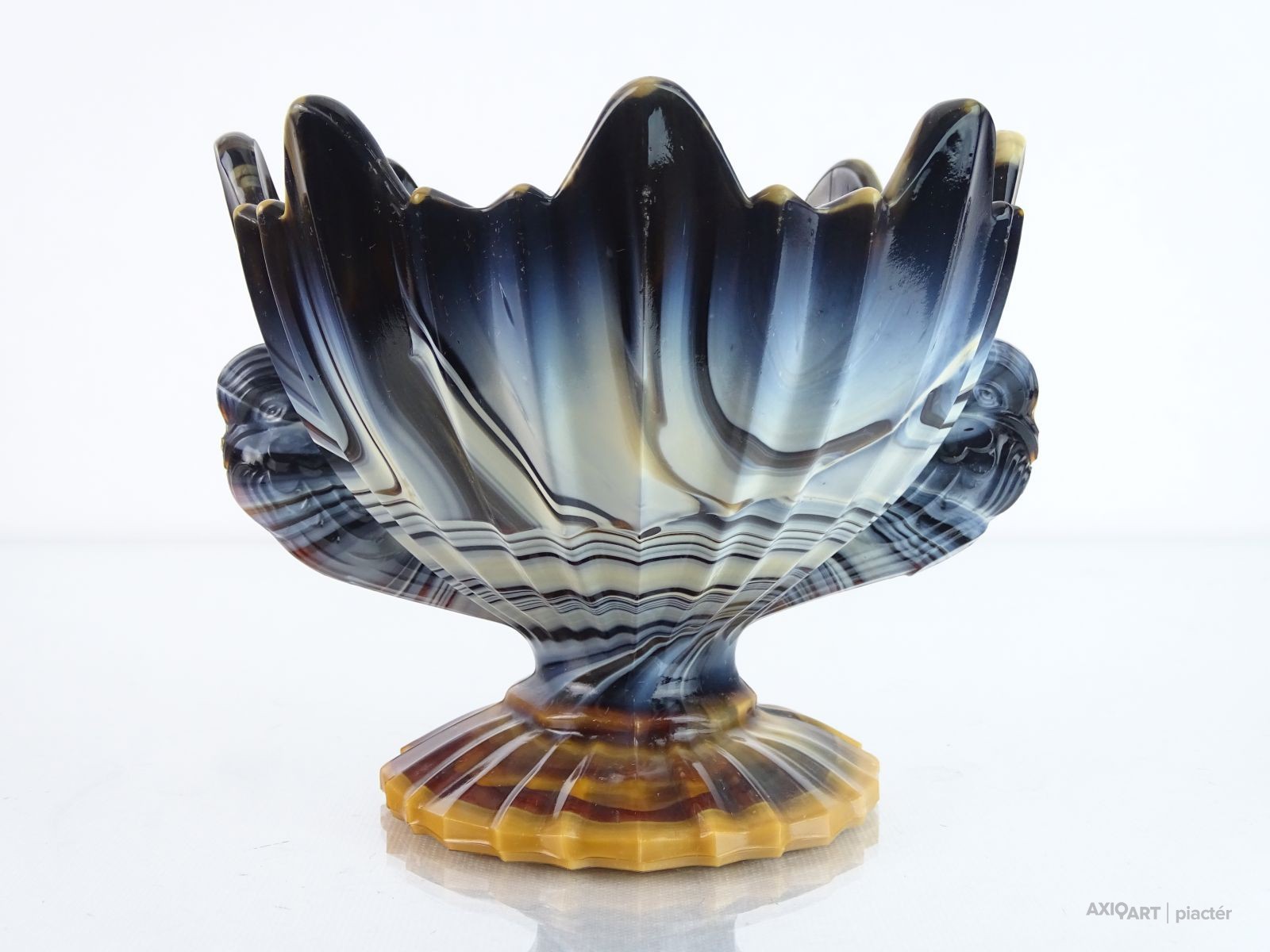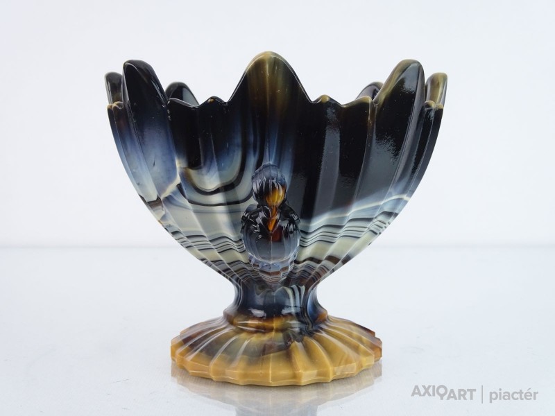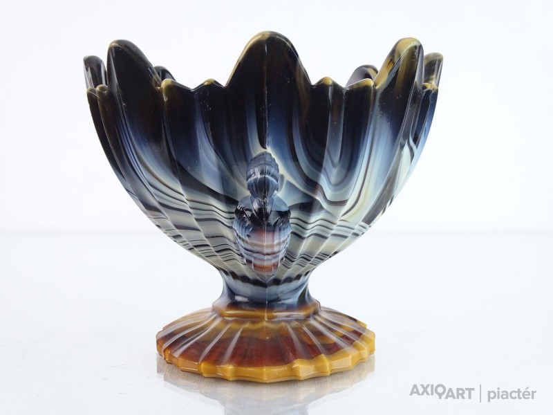 [0M293/Z059] Régi, szép állapotú, talpon álló, márványszerű folyatott mintával díszített, két oldalán madaras kehely alakú asztali kínáló. STS ABEL üveg kínáló az 1930-as évekből. (SJEDINJENE TVORNICE STAKLA ZAGREB YUGOSLAVIA) A bordák élén egy-két apróbb kopás található. Magasság: 15.5 cm Szélesség: 20.5 cm Súly: 1.545 kg