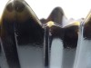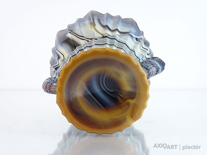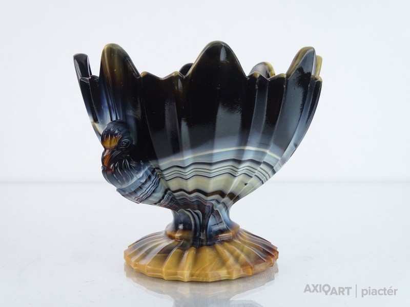 Régi, szép állapotú, talpon álló, márványszerű folyatott mintával díszített, két oldalán madaras kehely alakú asztali kínáló. STS ABEL üveg kínáló az 1930-as évekből.