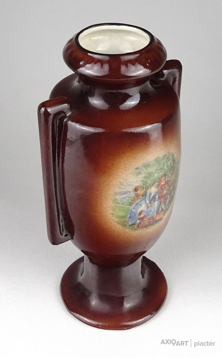 Jelzett, szép állapotú, korai Hollóházi fajansz váza, díszváza. Barna színű, rajta négy alakos allegorikus jelenettel.