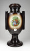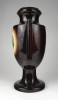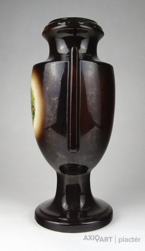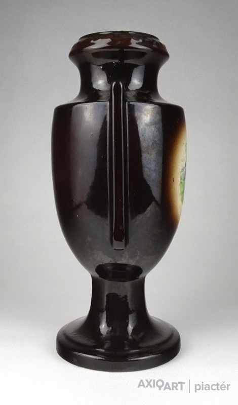 Jelzett, szép állapotú, korai Hollóházi fajance váza, díszváza. Barna színű, rajta négy alakos allegorikus jelenettel. Alatta nagyon kopott ezüst színű Szakmáry címke található.