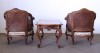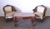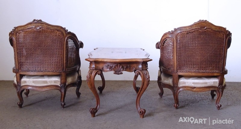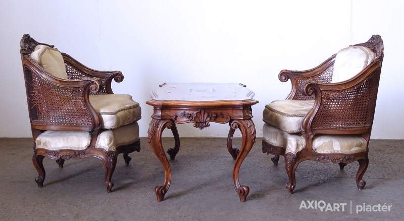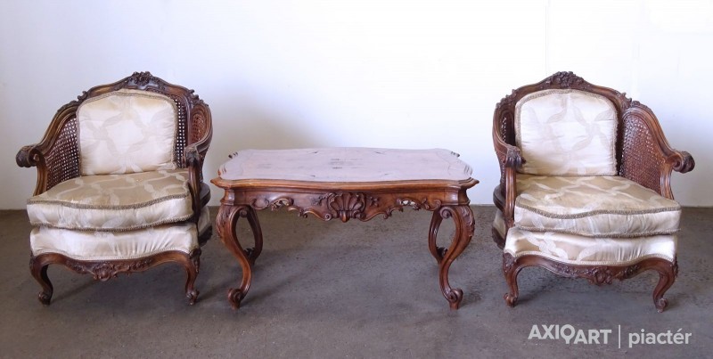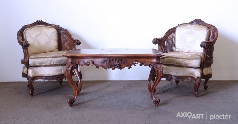 Antik, három darabos, gyékény fonatos, nagypolgári bécsi barokk szalon garnitúra. A fa szerkezetek épek, dúsan faragott díszítésűek.